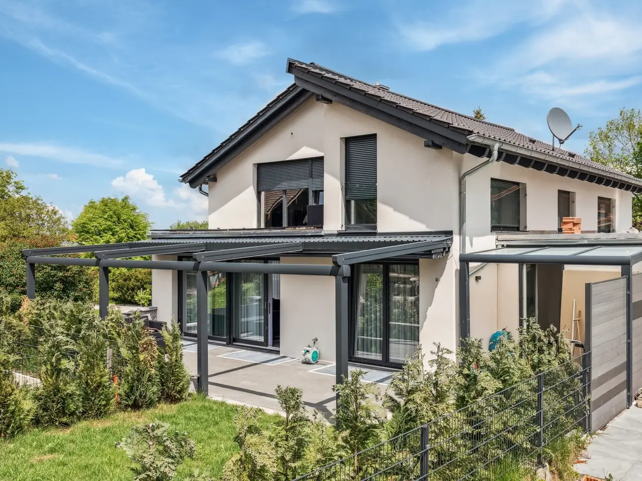 This modern residential building, which was just in 2021, is located in an absolutely quiet and sunny location, not far from Holzkirchen and Lake Tegernsee, on a dead end street. In many ways, it is an ideal place to live for families with children. A good infrastructure enables comfortable living in a rural environment with ideal transport links to Munich and Holzkirchen. The approx. 92 m² granny flat can also be used separately thanks to a separate entrance, making the house a two-family house. The home office theme can be ideally implemented here. A solid brick construction (36.5 cm) in combination with triple glazing and geothermal heating make the house a modern residential building in terms of energy too. The high-quality equipment offers, for example, an open fireplace in both the family house and the granny flat for cozy warmth in cozy hours at home. A pleasant comfort feature is the access to the house through the garage, not only in winter, but also when it rains. The owner family has to move for professional reasons and, with a heavy heart, is parting with the location and the house.