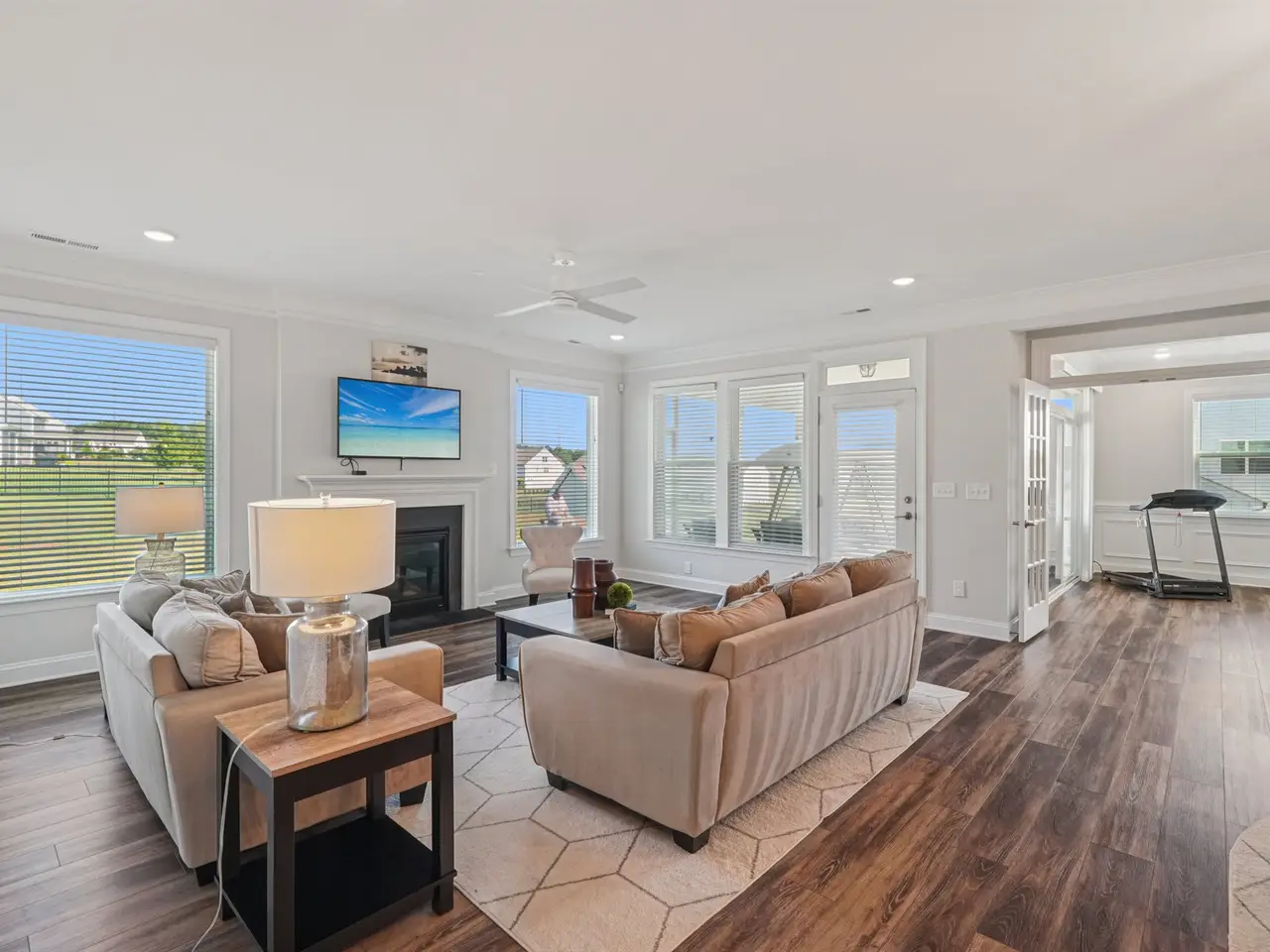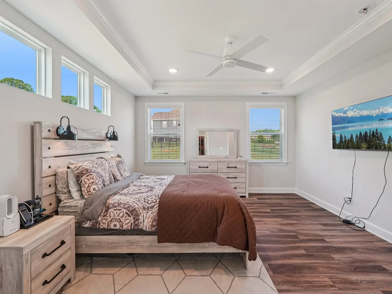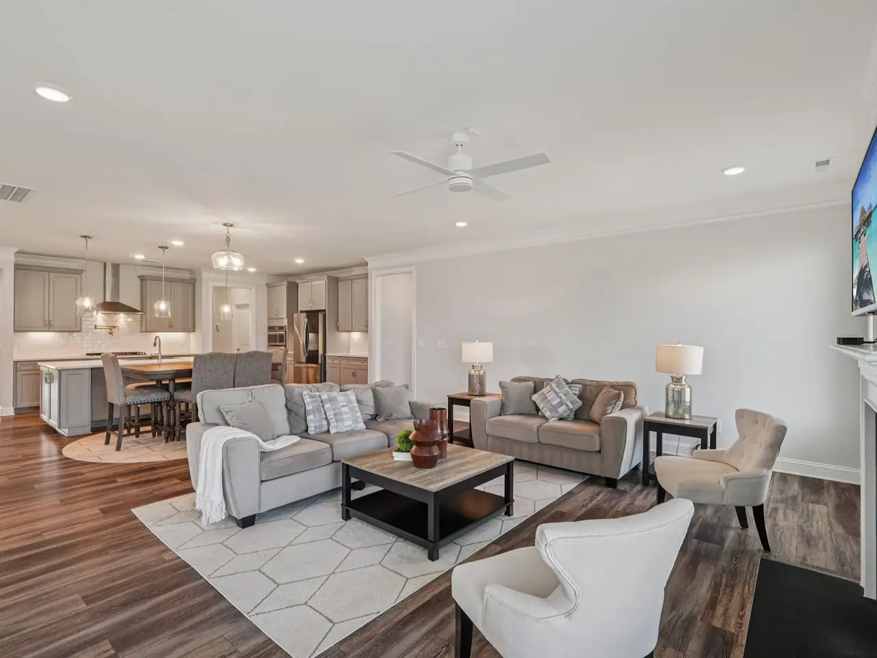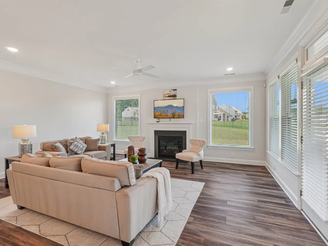 Freshly Priced! Beautiful east-facing, ranch-style home with over 2,600 SF on the main floor plus 500+ SF upstairs. The main level showcases a luxurious primary suite with spa-like shower, tray ceiling, custom closets, and quartz countertops (featured throughout the kitchen and all baths). Two additional bedrooms and full baths, a formal dining room, and a chef's kitchen with large quartz island, walk-in pantry, and drop zone complete the main level.Enjoy casual dining and gatherings in the spacious family room with gas fireplace. A private office offers built-in cabinetry, French doors to the family room, and sliding doors to the screened porch. Abundant natural light fills every space.Upstairs, a versatile loft with built-in cabinets, plus a 4th bedroom and full bath, create the perfect flex space. Outdoor living is ideal with a screened porch, paved patio, firepit, and a large, flat backyard just waiting to make this your own.Immaculately maintained and move-in ready?this home easily accommodates multi-generational living!