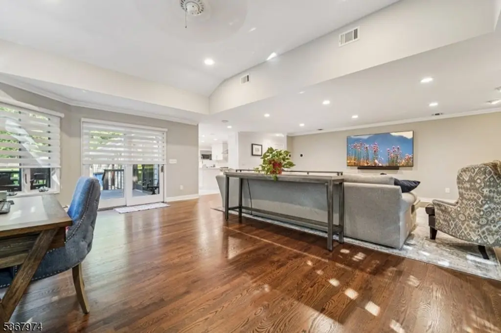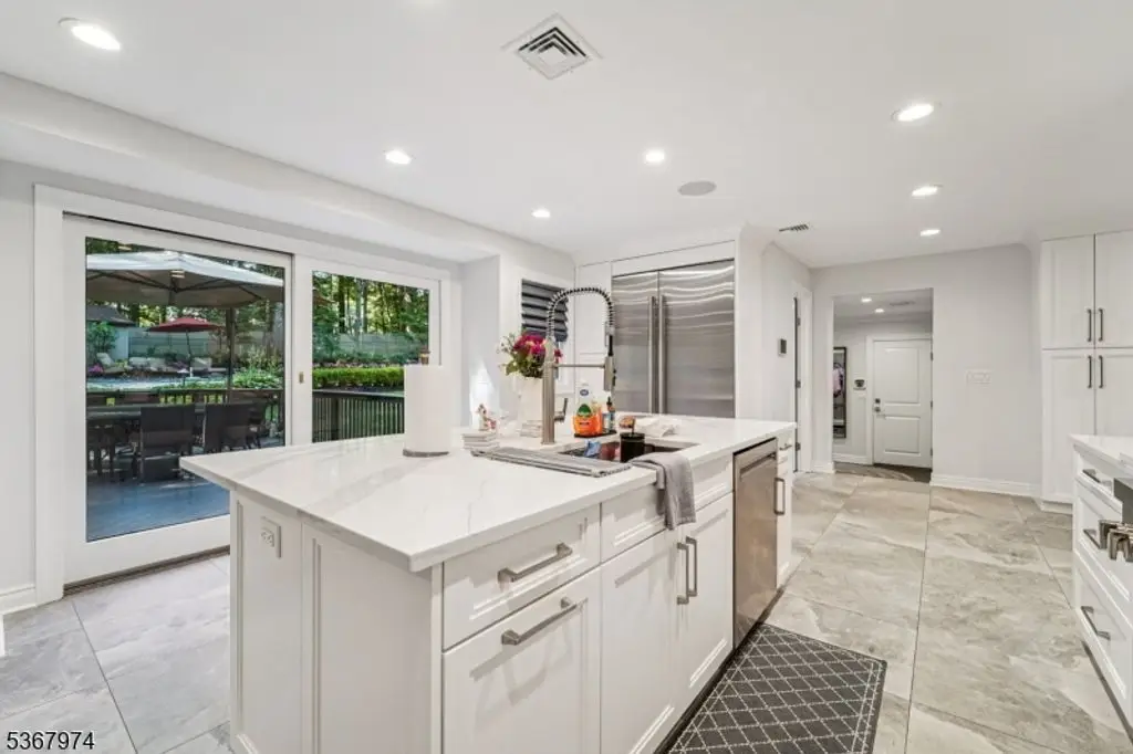 Welcome home to this meticulously maintained 4-bedroom, 2 full and 2 half bath Tudor-style residence, beautifully set on a generous, professionally landscaped lot. A welcoming entry foyer leads into the elegant living room, filled with natural light and perfect for relaxed entertaining. Continue into the expansive family room featuring soaring ceilings, custom built-ins, oversized windows, and a charming brick fireplace an ideal setting for cozy evenings. The formal dining room offers the perfect backdrop for everything from quiet dinners to festive gatherings, while sliding glass doors open to a large rear deck designed for al fresco dining and summer grilling. The gourmet kitchen is a chef's dream with custom cabinetry, Corian countertops, double wall ovens, gas cooktop, and center island with bar seating. A mudroom, laundry area, powder room, and garage access add convenience to the main level. Upstairs, the serene primary suite boasts a sitting area, walk-in closet, and en suite. Three additional bedrooms one currently used as a home office share a full bath. The full partially finished basement offers den, gym, powder room and abundant storage. Step outside to your private backyard retreat featuring a fully fenced, wooded yard with lush greenery, an expansive deck, an in-ground pool, and patio perfect for luxurious outdoor living and entertaining. This home offers the perfect blend of timeless elegance, everyday comfort, and resort-style living both indoors and out.