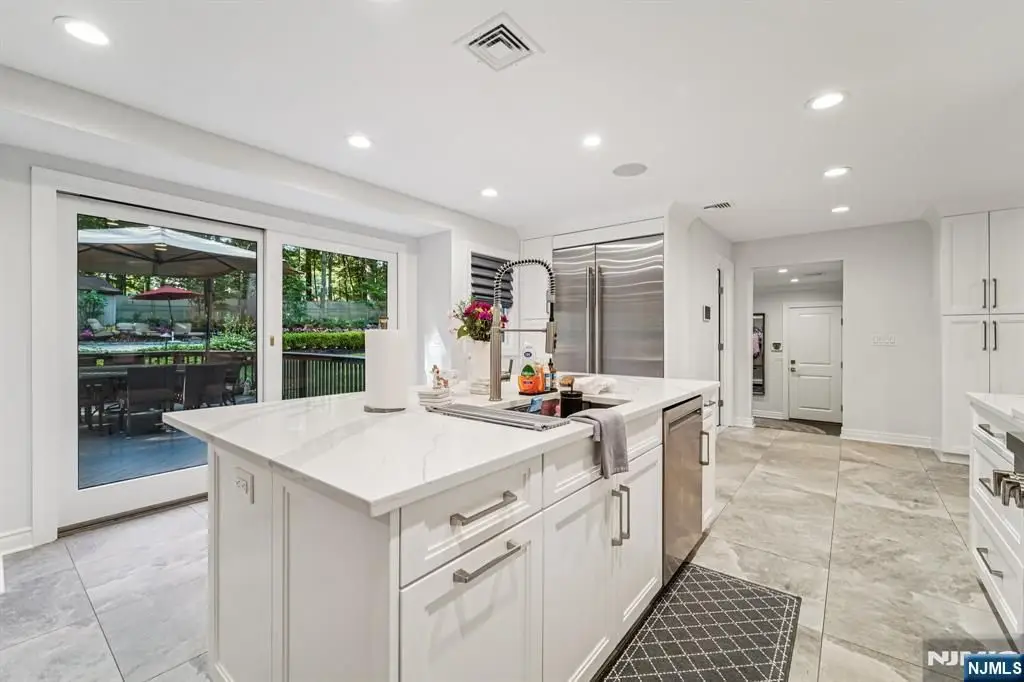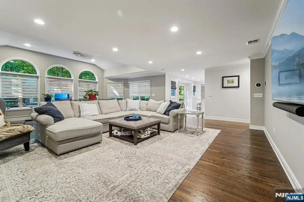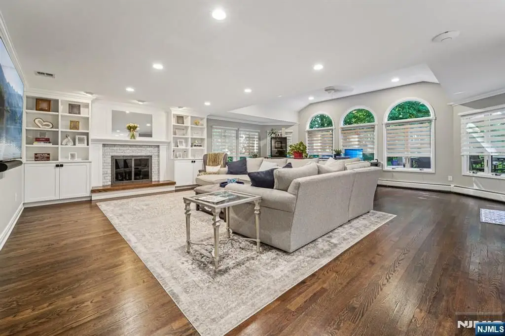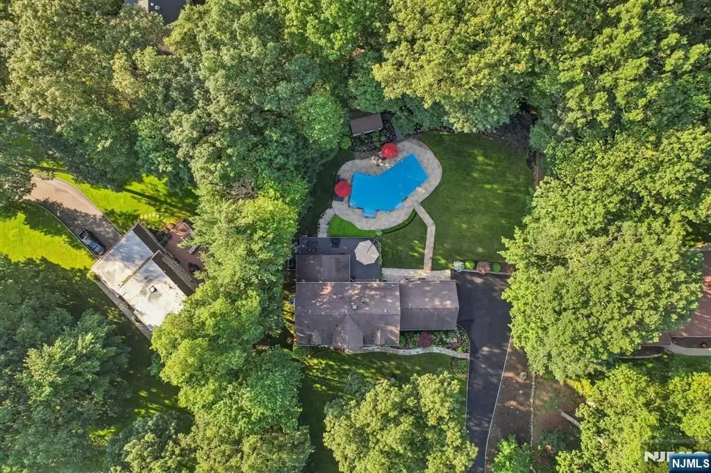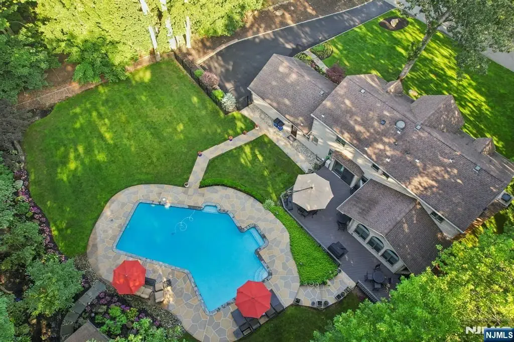 Welcome home to this meticulously maintained 4-bedroom, 2 full and 2 half bath Tudor-style residence, beautifully set on a generous, professionally landscaped lot. A welcoming entry foyer leads into the elegant living room, filled with natural light and perfect for relaxed entertaining. Continue into the expansive family room featuring soaring ceilings, custom built-ins, oversized windows, and a charming brick fireplace an ideal setting for cozy evenings. The formal dining room offers the perfect backdrop for everything from quiet dinners to festive gatherings, while sliding glass doors open to a large rear deck designed for al fresco dining and summer grilling. The gourmet kitchen is a chef's dream with custom cabinetry, Corian countertops, double wall ovens, gas cooktop, and center island with bar seating. A mudroom, laundry area, powder room, and garage access add convenience to the main level. Upstairs, the serene primary suite boasts a sitting area, walk-in closet, and en suite. Three additional bedrooms one currently used as a home office share a full bath. The full partially finished basement offers den, gym, powder room and abundant storage. Step outside to your private backyard retreat featuring a fully fenced, wooded yard with lush greenery, an expansive deck, an in-ground pool, and patio perfect for luxurious outdoor living and entertaining. This home offers the perfect blend of timeless elegance, everyday comfort, and resort-style living both indoors and out.