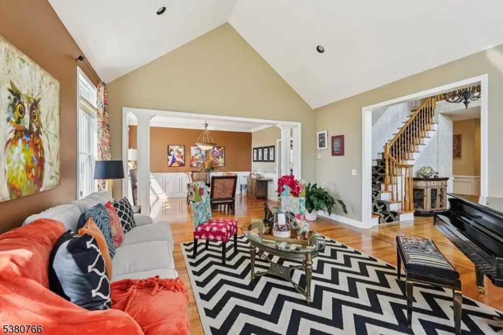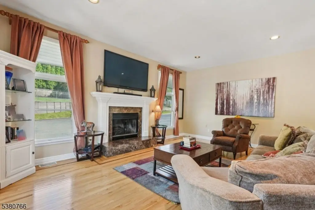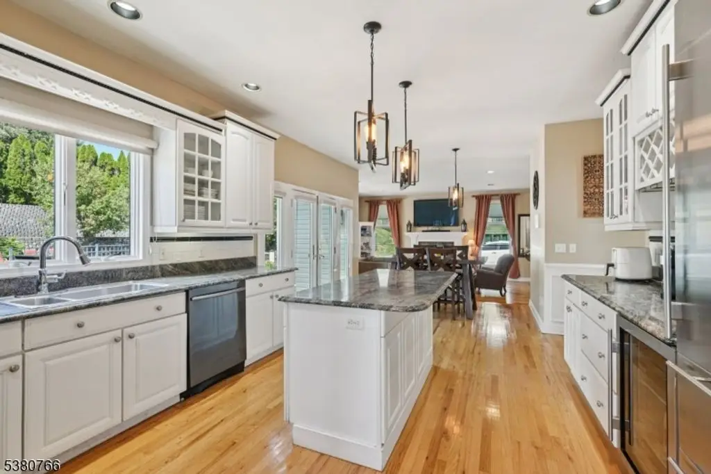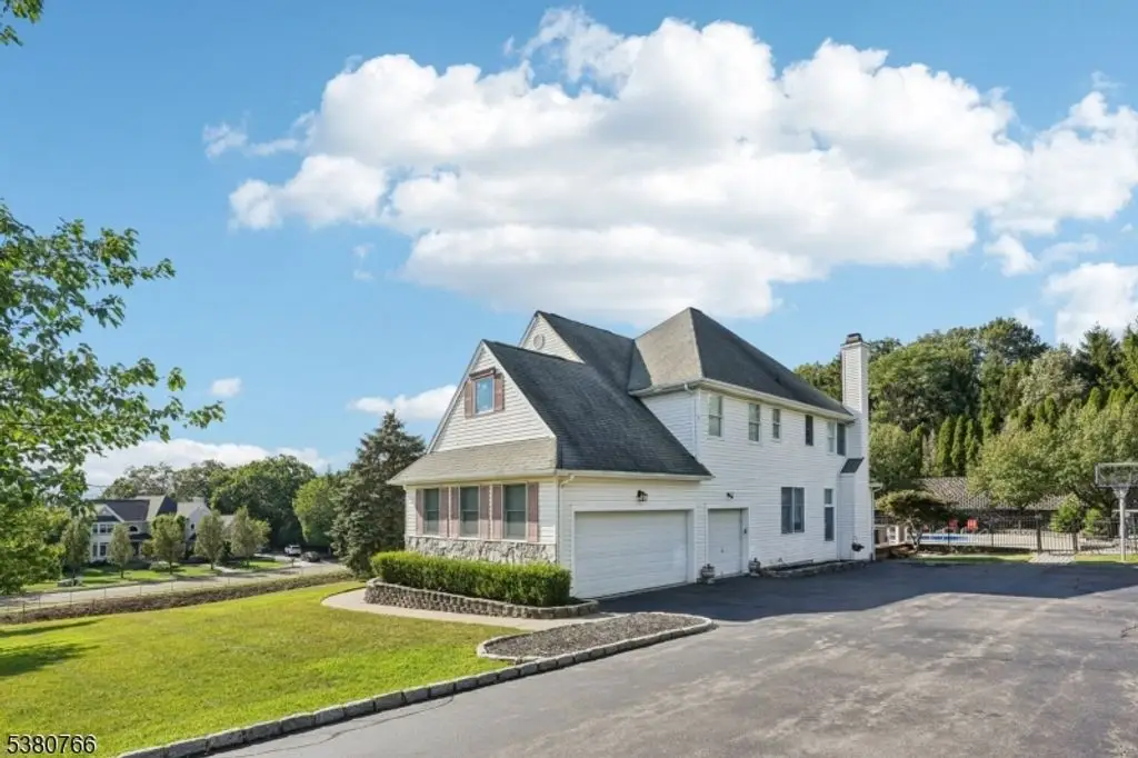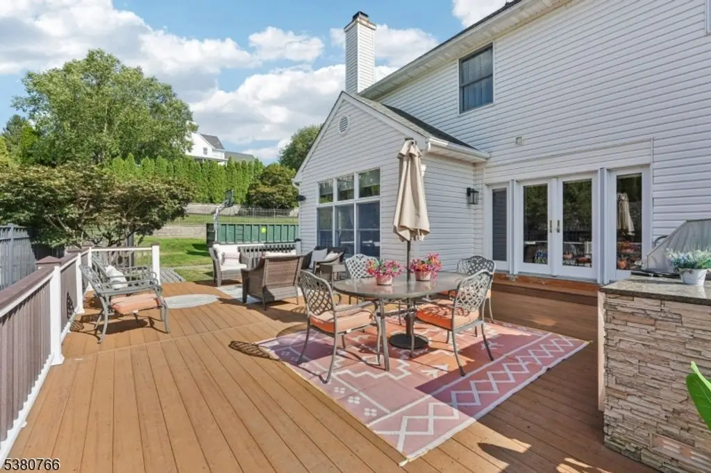 Welcome home to this exquisite 6 bedroom, 5.5 bathroom Colonial, situated on a beautifully manicured lot in the prestigious Cobblestone Woods. Step inside the elegant two-story foyer and be greeted by a sun-drenched living room with soaring vaulted ceilings, expansive windows, and gleaming hardwood floors an inviting space for relaxation and conversation. The open flow continues into the formal dining room, ideal for intimate gatherings or festive entertaining. The heart of the home is the chef's kitchen, showcasing custom cabinetry, marble countertops, premium stainless steel appliances, a center island, and breakfast area. French doors open to an expansive deck, offering the ultimate setting for al fresco dining, grilling, and outdoor entertaining. Unwind in the sophisticated family room with its cozy fireplace and seamless connection to the kitchen. Half bath and laundry complete the level. Upstairs, the luxurious primary suite boasts walk-in closet and spa-inspired en suite, while four additional bedrooms and three bathrooms provide comfort and privacy. The full finished walkout basement offers versatility with a bedroom, full bath, second kitchen, den, and access to the backyard. Step outside to your private retreat featuring a sparkling in-ground pool, patio, and lush yard perfect for play or gardening. A three-car garage and ample parking complete this remarkable property. Experience private luxury living just minutes from NYC transportation, shopping, and fine dining.