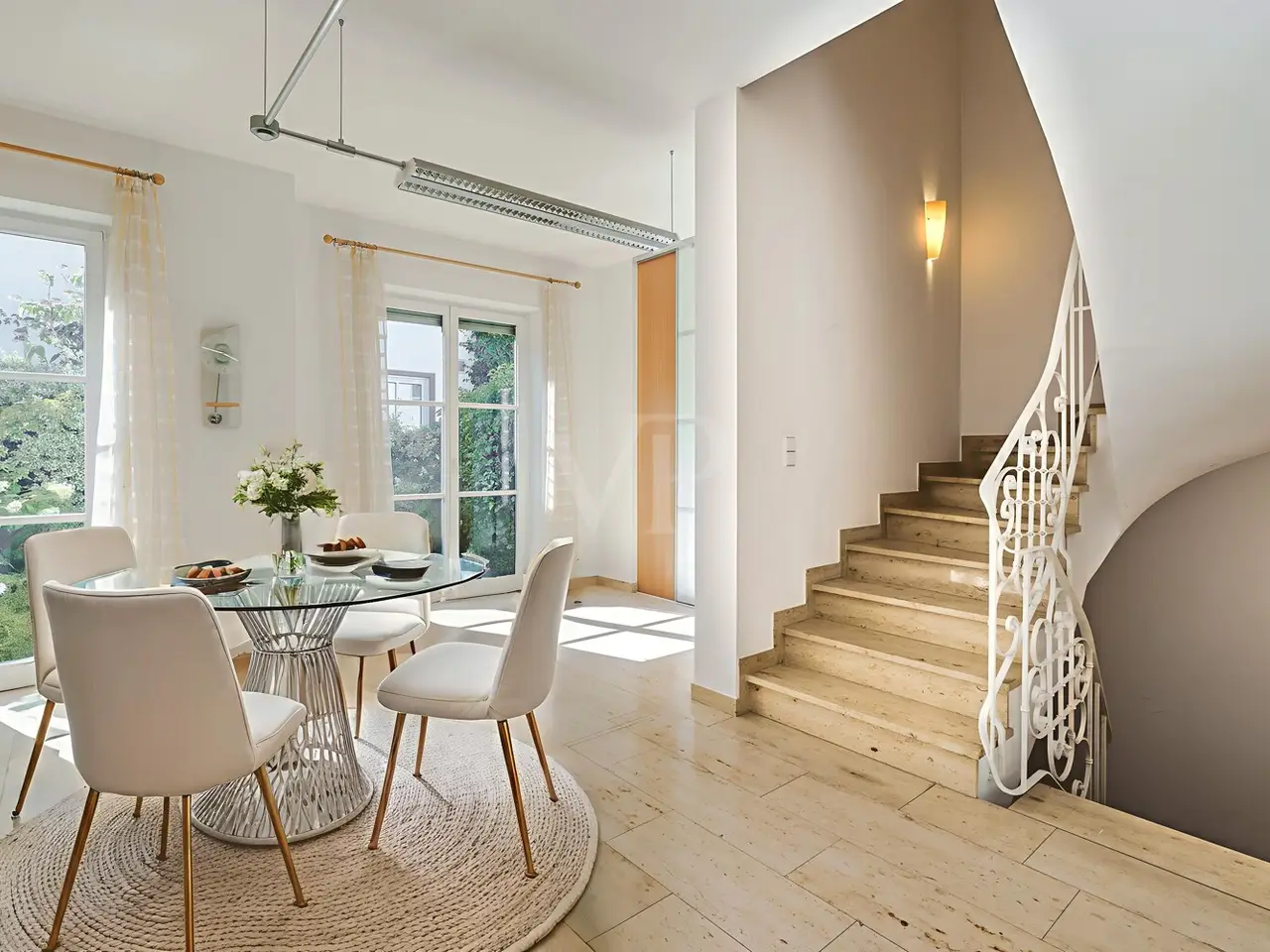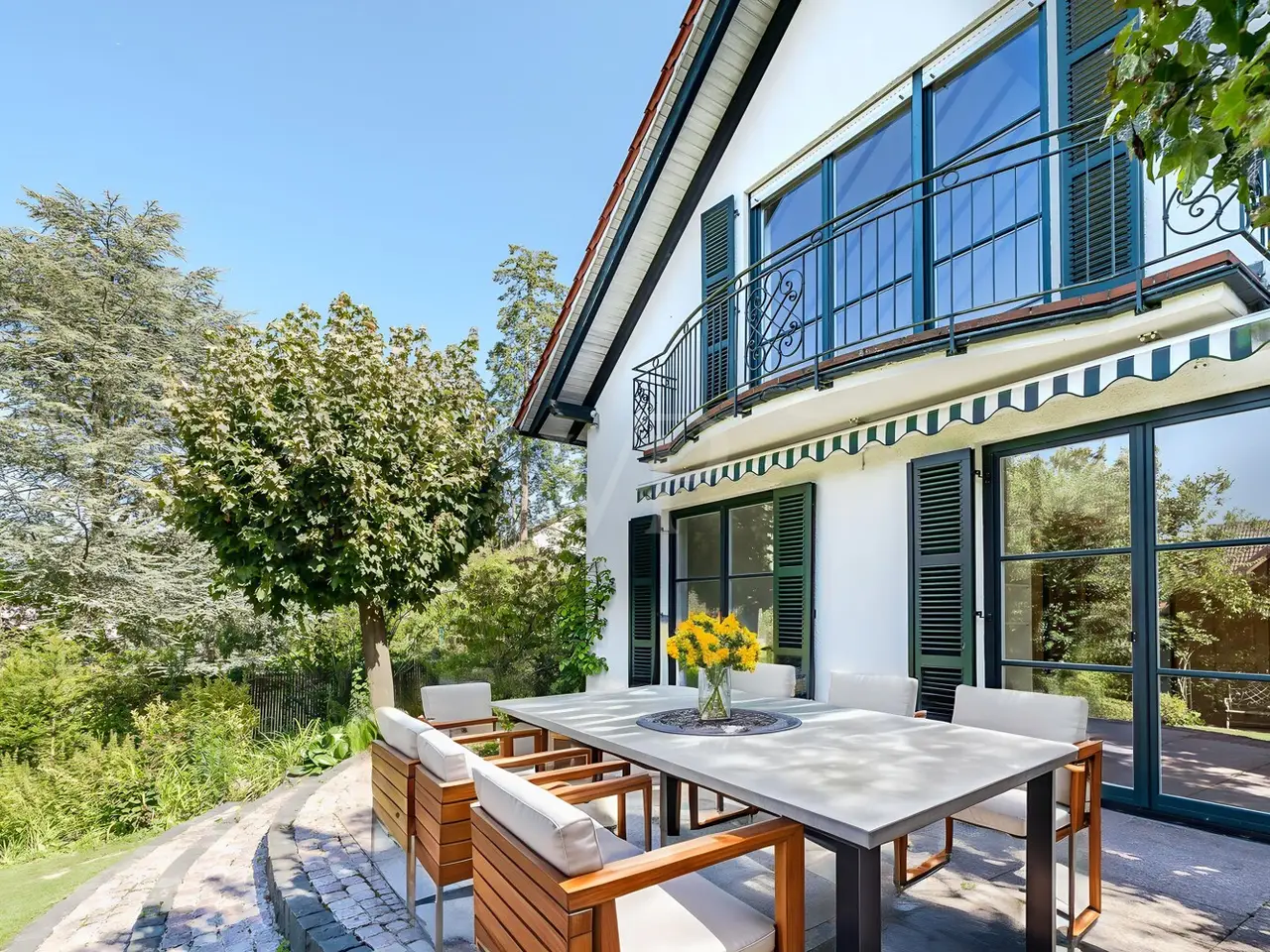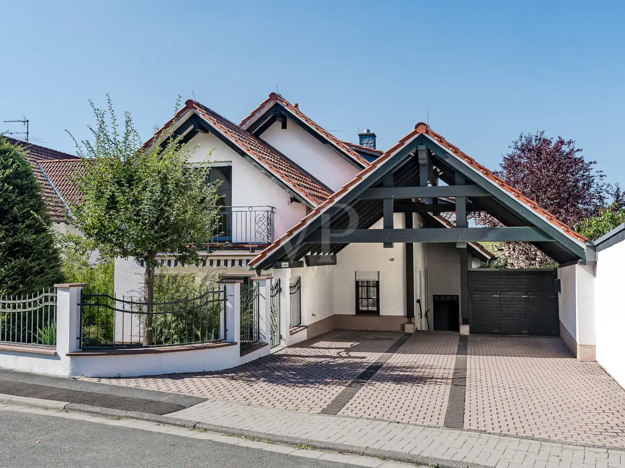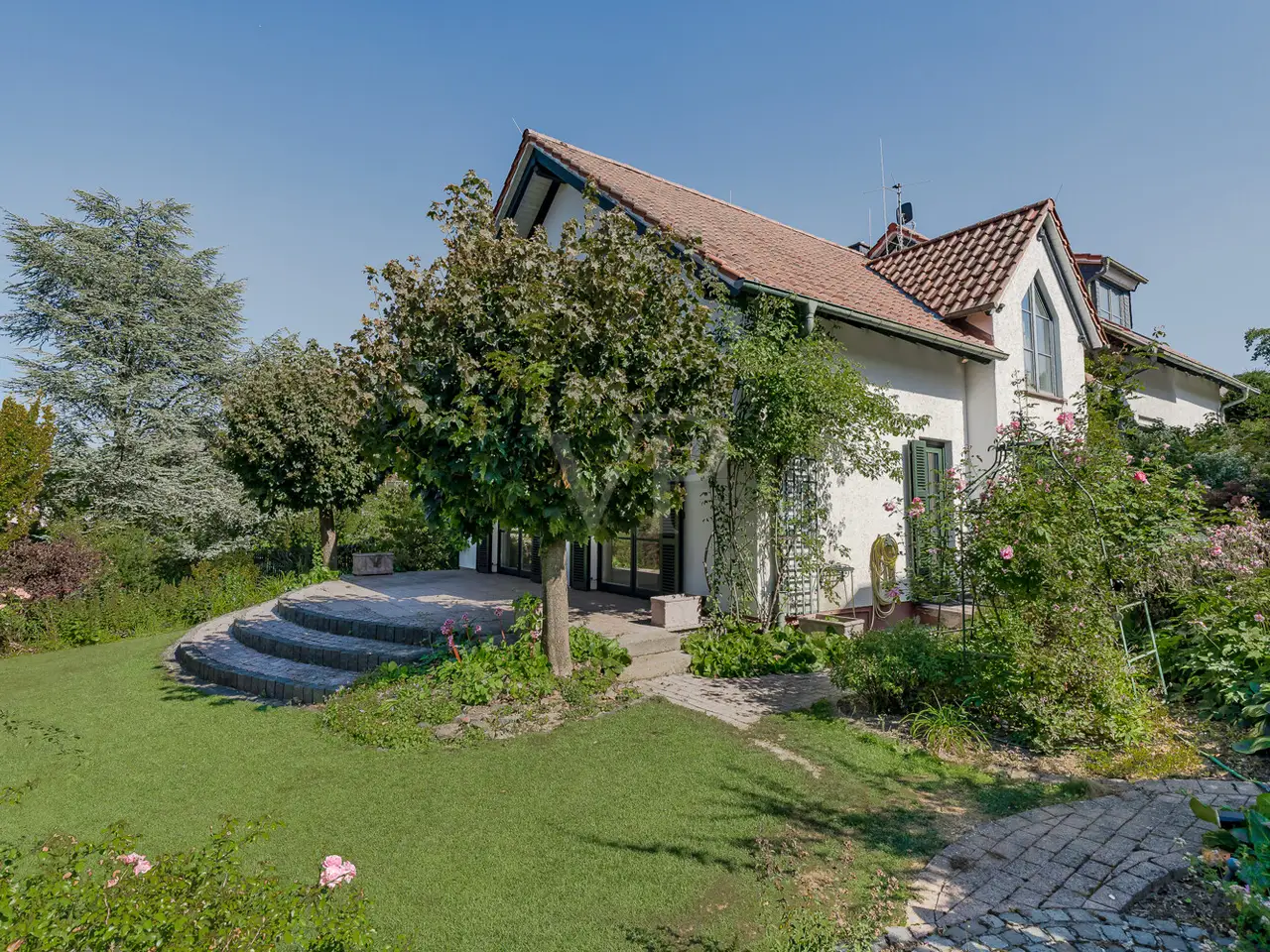 Just a few steps - and you are in the middle of the Taunus forest. Whether hiking, cycling or enjoying nature: here your leisure paradise starts almost on your doorstep. A wide range of leisure activities (such as tennis, horse riding, gliding, etc.) and the short journey time to Bad Homburg or Frankfurt will quickly convince you of Obernhain's location. Here in this sought-after residential area of Wehrheim-Obernhain, in a quiet and family-friendly environment, you will find this very special two-family house, which consists of two separate house halves, each with separate entrances. This results in a variety of possible uses: Living and working under one roof, as a multi-generational house - each for themselves and yet together, or for owner-occupation and partial letting to third parties, which offers attractive financing options. The solidly built house with two storeys and a full basement is in excellent condition with high-quality fittings and selected materials. There are 8 rooms in total, including 4 bedrooms and 2 bathrooms. Floor-to-ceiling window elements and the comfortable ceiling height of 2.93 m ensure light-flooded rooms and a pleasant living ambience and provide views of the romantic garden and the plants around the house from all rooms. A terrace adjoining the living area across the entire width of the house offers ideal conditions for enjoying the garden, which is virtually secluded in summer, as well as peace and privacy. Special features of the garden-side half of the house: The antique, French cotto flooring throughout the first floor exudes a very special charm and is complemented on the upper floor by solid country house floorboards in oiled oak. The light-flooded studio/bedroom is adjoined by a balcony that offers a romantic view of the garden. The daylight bathroom on the upper floor has a shower, bathtub and a double washbasin in Rosso Sardo with a ceiling-high mirror element. The first floor is dominated by the large, open living and dining area with access to the terrace, which can be separated by a sliding door. The current room divider, which can be used as shelving, can easily be removed, allowing for flexible use. Special features of the front building: Here, too, you can expect high-quality fittings with natural stone floors on the first floor (Jura banded), various built-in wardrobes including a mirrored wardrobe and also a room divider between the living and dining area, which can be easily removed. On the upper floor there are two further living/bedrooms, one of which has a dressing room and a daylight bathroom. From the balcony adjoining the bedroom, you have a wonderful view of the greenery. The technical equipment has a lot to offer, such as underfloor heating on all living levels, fiber optic connection, lightning and surge protection, as well as an alarm and water protection system in the garden-side house. Last but not least, the existing lighting with designer lamps reflects the special ambience. The boiler room in the basement is accessible from both houses and secured by lockable fire doors. The overall attractive design is also continued outside. Even the entrance area to the two halves of the house and the garden, in pink sandstone and the folding shutters, give the exterior of this house ensemble a very special flair. The low-maintenance garden behind the house with rose and shrub beds and a unique sandstone sculpture by the fountain invites you to linger and daydream. A spacious double carport with two additional parking spaces rounds off the offer. The property is available immediately. Get in touch with us today. We look forward to your inquiry.