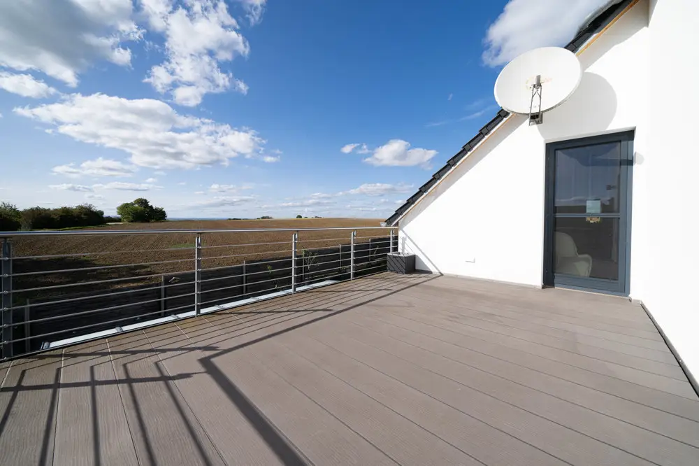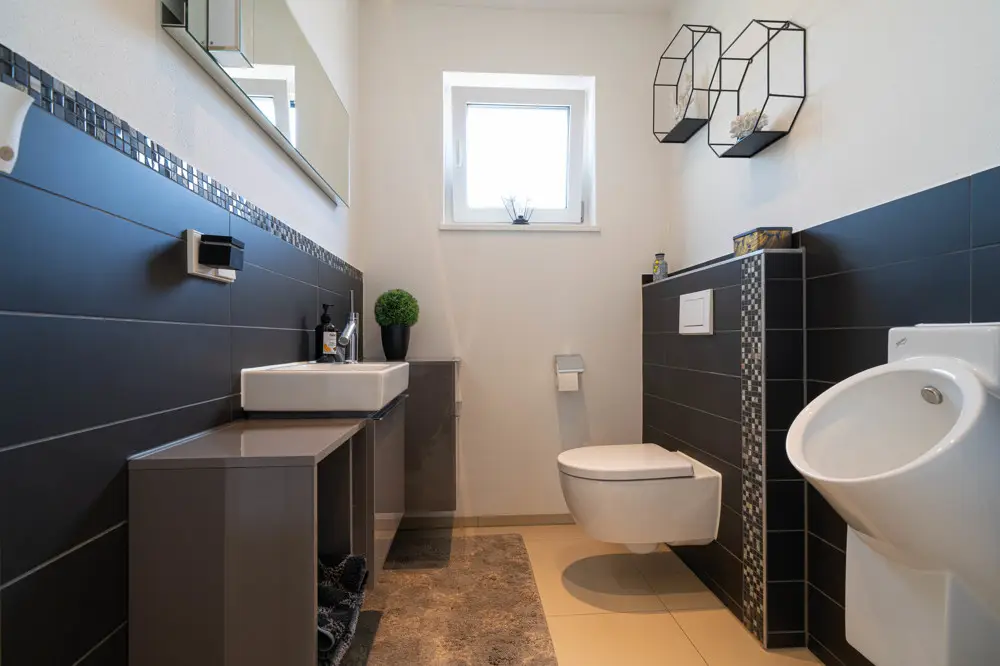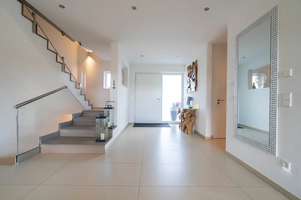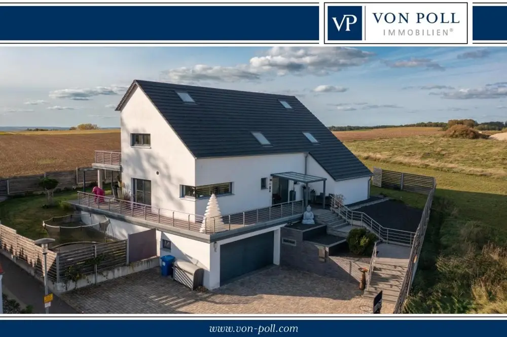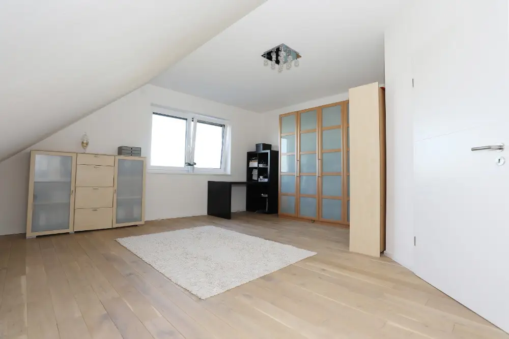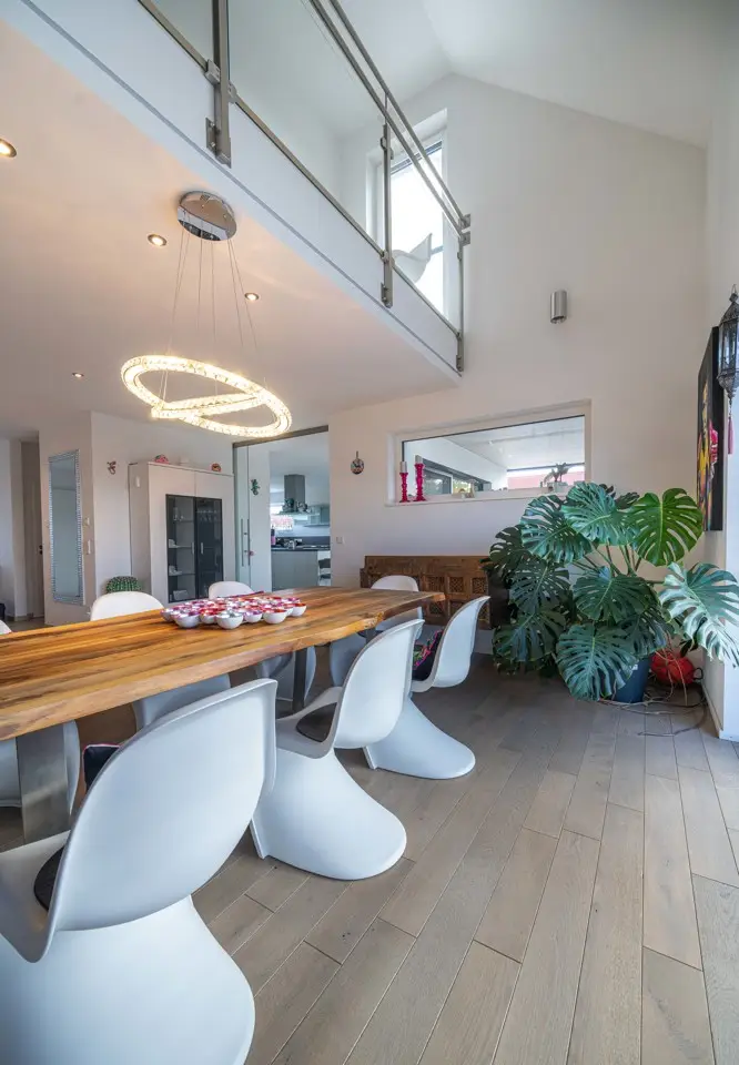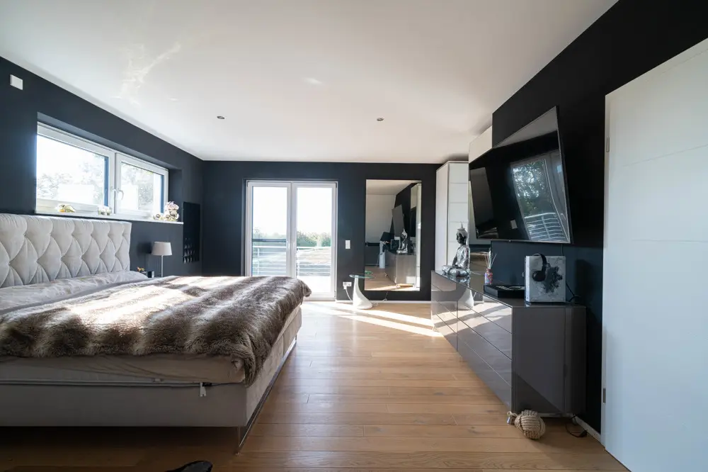 This attractive architect-designed house was built in 2012 according to the owner's personal wishes. Particular emphasis was placed on high living comfort, design and the best construction quality. The result is a modern, well thought-out home with a spacious floor plan and high-quality, elegant furnishings. Large glass windows and doors, natural stone floors and real wood parquet dominate the materials used. Overall, this property offers an ideal home for a family that appreciates luxury and modern amenities. In the impressive living and dining area, you can expect airy ceiling heights and bright natural stone; the floor-to-ceiling windows ensure that the rooms are flooded with light. One highlight (of many) is the visually and functionally high-quality designer panoramic fireplace and the homely fitted kitchen as part of the overall concept of extravagant furnishings. A large sliding glass door separates the kitchen from the dining/living area. The panoramic fireplace separates the dining area from the living room and is fitted with glass on both sides. The elegant fitted kitchen from Leicht with its many technical refinements and a modern cooking island leaves nothing to be desired with its high-quality Siemens, Miele and Whirlpool appliances: Induction hob, Silence dishwasher, modern oven and an American fridge with ice cube maker. From the kitchen, a floor-to-ceiling sliding glass door leads to the stylish covered terrace with fantastic views of the natural surroundings, allowing you to relax after work. The terrace is laid out around half the house, guaranteeing an uninterrupted view of the city. The landscaped lawn surrounds a large part of the house and is fenced off with wooden privacy screens and plants. Adjacent to the living area on the first floor, you will find a guest bedroom and an en suite bathroom with equally impressive modern fittings. The numerous spotlights and the LED strip in the open-plan area make the first floor ceiling shine brightly. A checkroom and a guest WC with urinal complete the offer on the first floor. A spacious open gallery is centrally located on the top floor. From here, you can access the bright bedroom with a practical dressing area and a master bathroom en suite with luxurious fittings. You will find a large walk-in shower, a spacious deep-soaking bath, WC, bidet and two washbasins. From the sleeping area and the gallery, you have access to the wonderfully large balcony and can enjoy the view of the natural surroundings from here. Two further well-designed, bright and spacious rooms complete the sleeping area on this floor. An open staircase leads to the attic, which has been converted into a studio. Only limited by sloping ceilings, you have another living area here, e.g. as a play area for children, a guest area or for your home office. In the converted basement you will find the boiler/technical room, a heated anteroom with built-in cupboards, a fitness room with wellness area (sauna and shower), a separate laundry room and a fully equipped home cinema. An additional storage room and a further guest WC complete this area. You have direct access to the garage from the entrance hall and the utility room. Here you have enough space for 4 large cars and other various vehicles and objects. A car enthusiast will really appreciate this garage with access in the house. The garage floor has been coated with a self-leveling reaction resin mortar and additionally sealed. An electric double garage door is a matter of course here. In front of the garages, you have numerous other parking options for your guests in the spacious courtyard. The entire house (including the basement) is heated by underfloor heating using a heat pump. The Creaton roof panels in black matt, including a fully integrated photovoltaic system, give the house a modern look, support the energy supply in the house and ensure low heating costs. The exterior railings are made of stainless steel and the terrace boards are fitted with an aluminum substructure. Electric roller shutters provide comfort and security. The house has a total of 6 rooms, including 4 bedrooms and a studio. There are also 2 guest WCs and 2 bathrooms, a sauna with wellness shower, fitness room and home cinema. This architect's house is situated on a slope and is a rare highlight. Let us convince you of its noble overall concept during a personal viewing. Please understand that we only allow viewings on presentation of a financing confirmation. VON POLL FINANCE can assist you with this. Our colleagues will be happy to provide you with a mortgage certificate free of charge and without obligation.