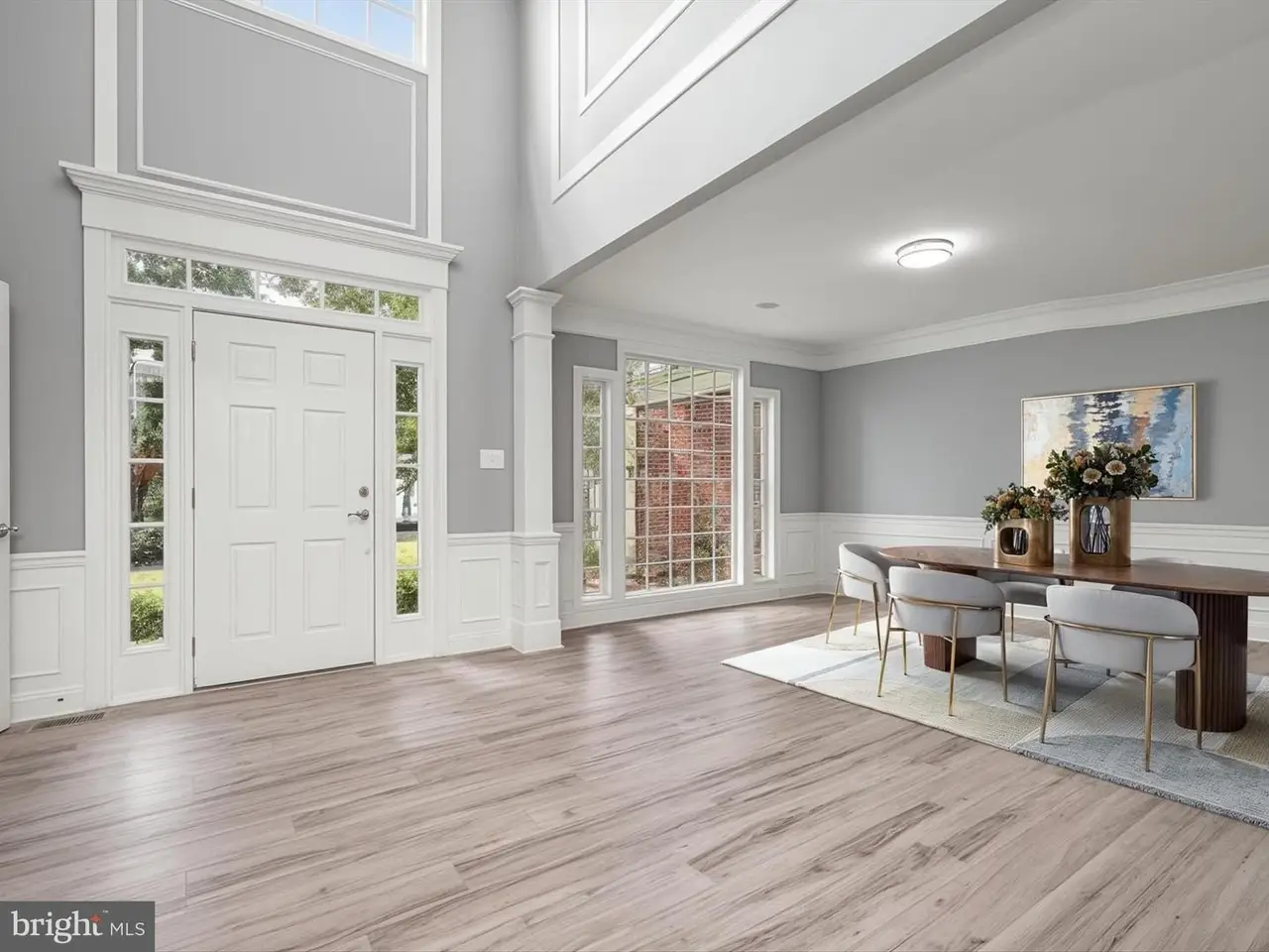 Two-story great room with crown moldings