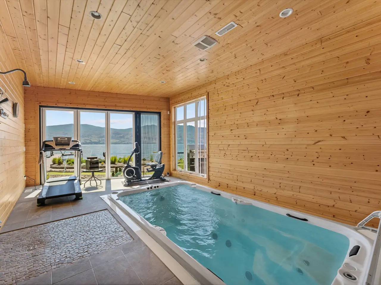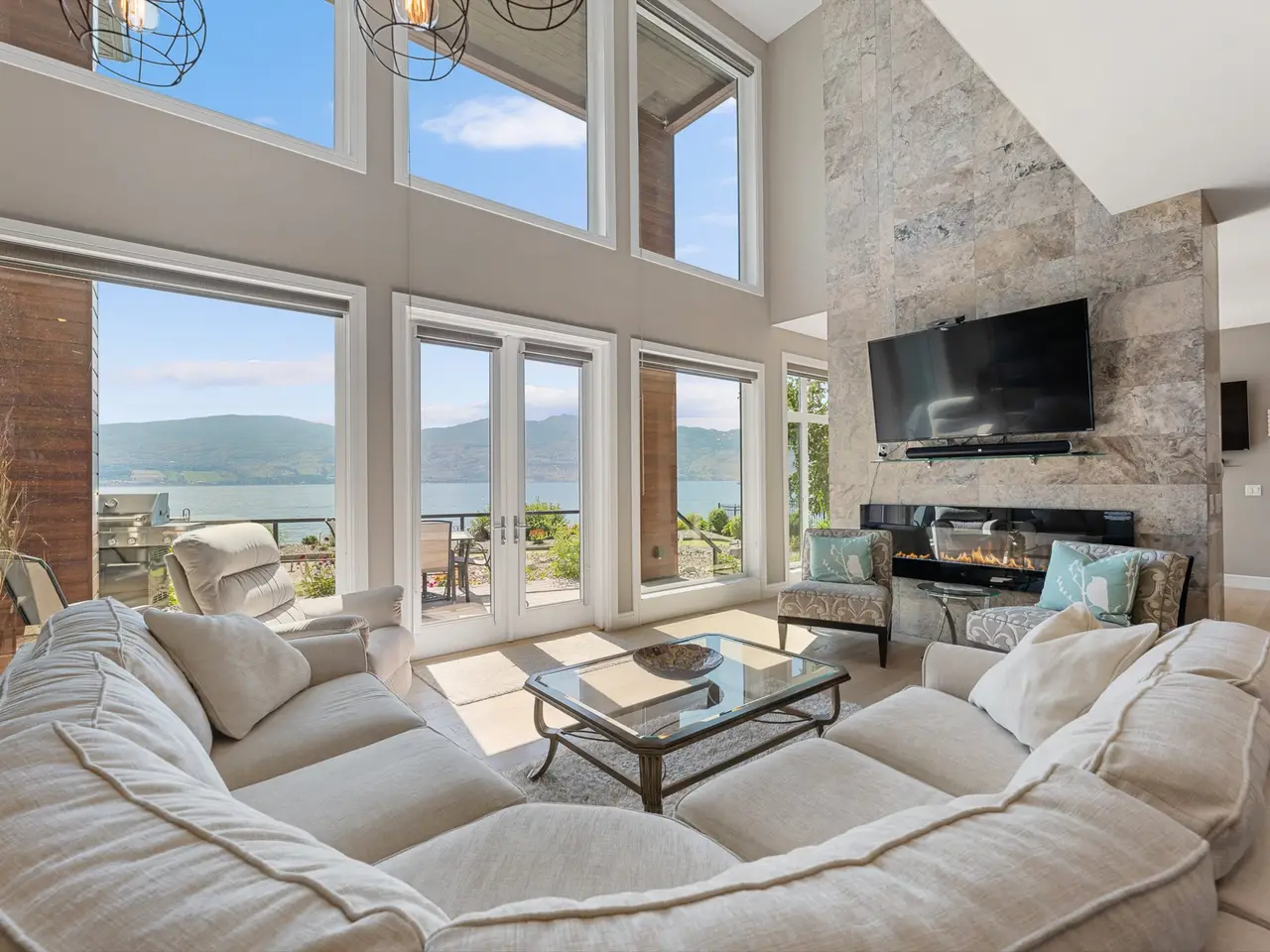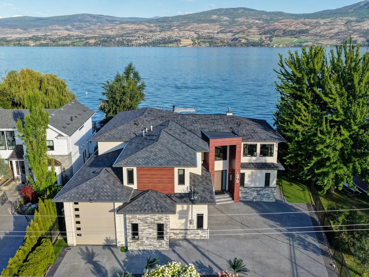 Listed by Unison Jane Hoffman Realty | Beautifully designed for lakefront living, this beach house on Pritchard Drive offers level lakeshore access and panoramic views of Okanagan Lake and the surrounding mountains. Enjoy seamless indoor–outdoor living, with floor-to-ceiling windows and sliding doors that open to the lakeside patio. The main level features a chef’s kitchen with granite countertops, premium KitchenAid appliances, and a large entertaining island. Soaring ceilings in the living room capture the view and provide ample natural light. The lower-level lakeview primary bedroom includes a fireplace and spa-inspired ensuite. A dedicated home gym features cedar walls and an indoor swim spa, positioned to take in the view. Upstairs, a second primary retreat offers a private balcony, gas fireplace, luxurious ensuite, and walk-in closet with custom built-ins. A spacious loft lounge with wet bar, family room, office, guest bedrooms, and two additional baths complete the upper level. The beautifully landscaped, low-maintenance yard is a golf enthusiast’s dream with turf grass, a 9-hole putting green, and a sandy beach leading to a private dock with boat lift. An oversized heated garage is ideal for RV owners or outdoor enthusiasts, featuring two standard bays, a 20-ft bay for a 40-ft RV, and a mini overhead door for golf carts or gear. Built-in cabinetry, ceiling fan, and EV charger wiring add versatility and function. Located just a short walk to Frind Estate Winery.