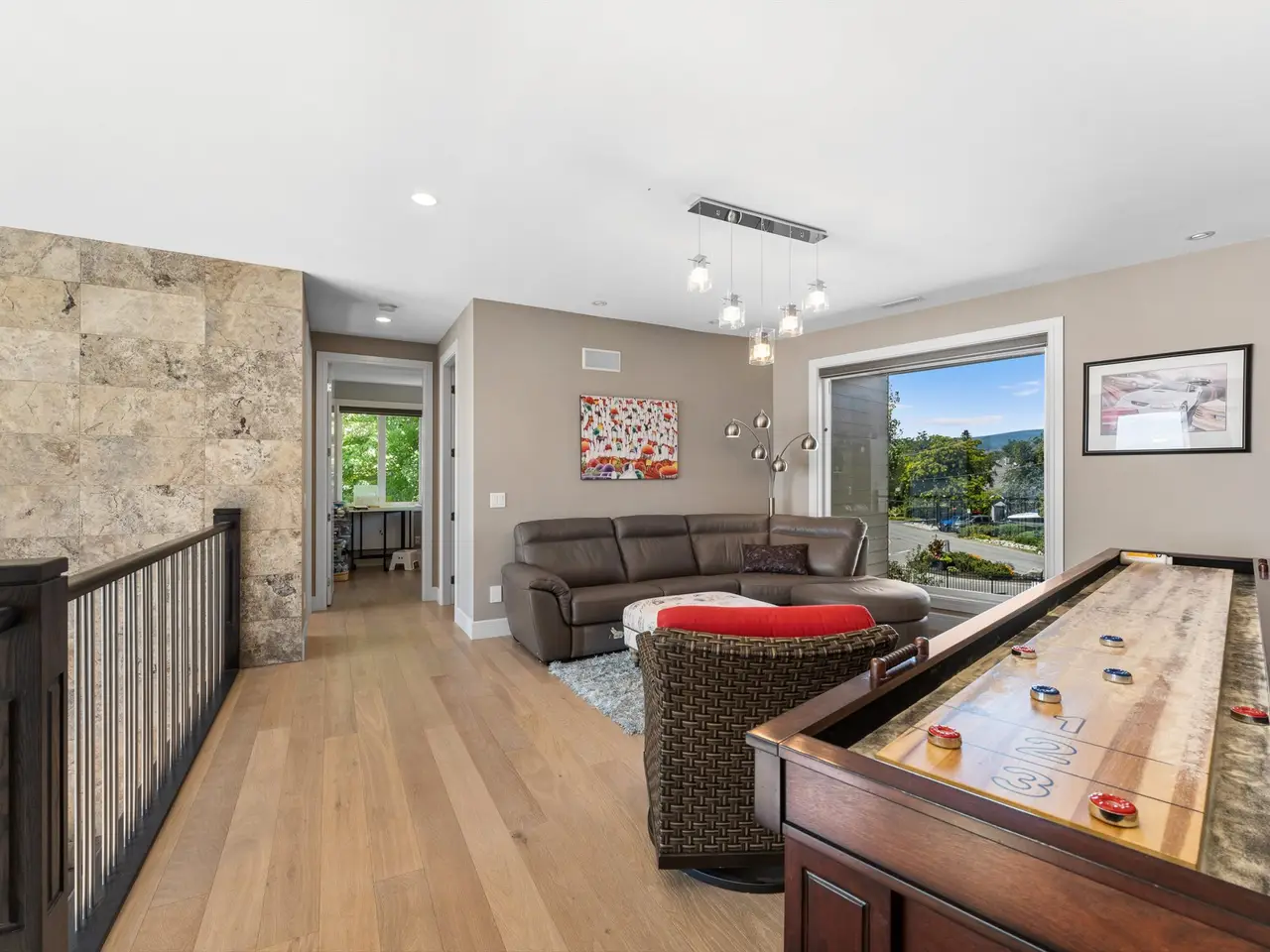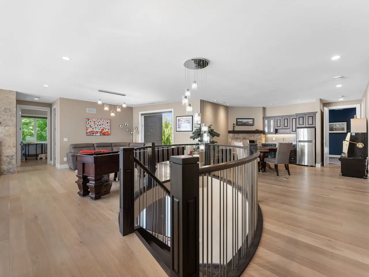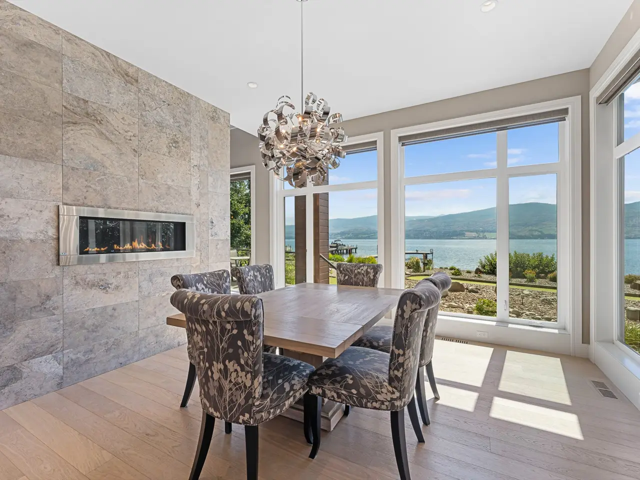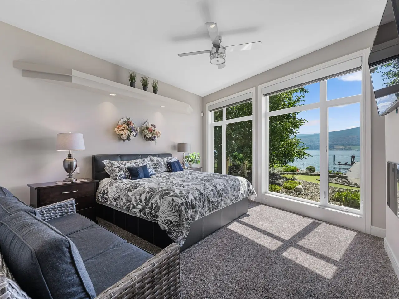 Listed by Unison Jane Hoffman Realty | Beautifully designed for lakefront living, this beach house on Pritchard Drive offers level lakeshore access and panoramic views of Okanagan Lake and the surrounding mountains. Enjoy seamless indoor–outdoor living, with floor-to-ceiling windows and sliding doors that open to the lakeside patio. The main level features a chef’s kitchen with granite countertops, premium KitchenAid appliances, and a large entertaining island. Soaring ceilings in the living room capture the view and provide ample natural light. The lower-level lakeview primary bedroom includes a fireplace and spa-inspired ensuite. A dedicated home gym features cedar walls and an indoor swim spa, positioned to take in the view. Upstairs, a second primary retreat offers a private balcony, gas fireplace, luxurious ensuite, and walk-in closet with custom built-ins. A spacious loft lounge with wet bar, family room, office, guest bedrooms, and two additional baths complete the upper level. The beautifully landscaped, low-maintenance yard is a golf enthusiast’s dream with turf grass, a 9-hole putting green, and a sandy beach leading to a private dock with boat lift. An oversized heated garage is ideal for RV owners or outdoor enthusiasts, featuring two standard bays, a 20-ft bay for a 40-ft RV, and a mini overhead door for golf carts or gear. Built-in cabinetry, ceiling fan, and EV charger wiring add versatility and function. Located just a short walk to Frind Estate Winery.
