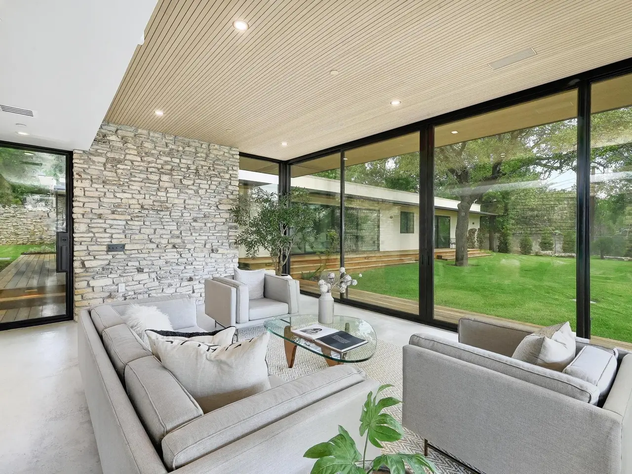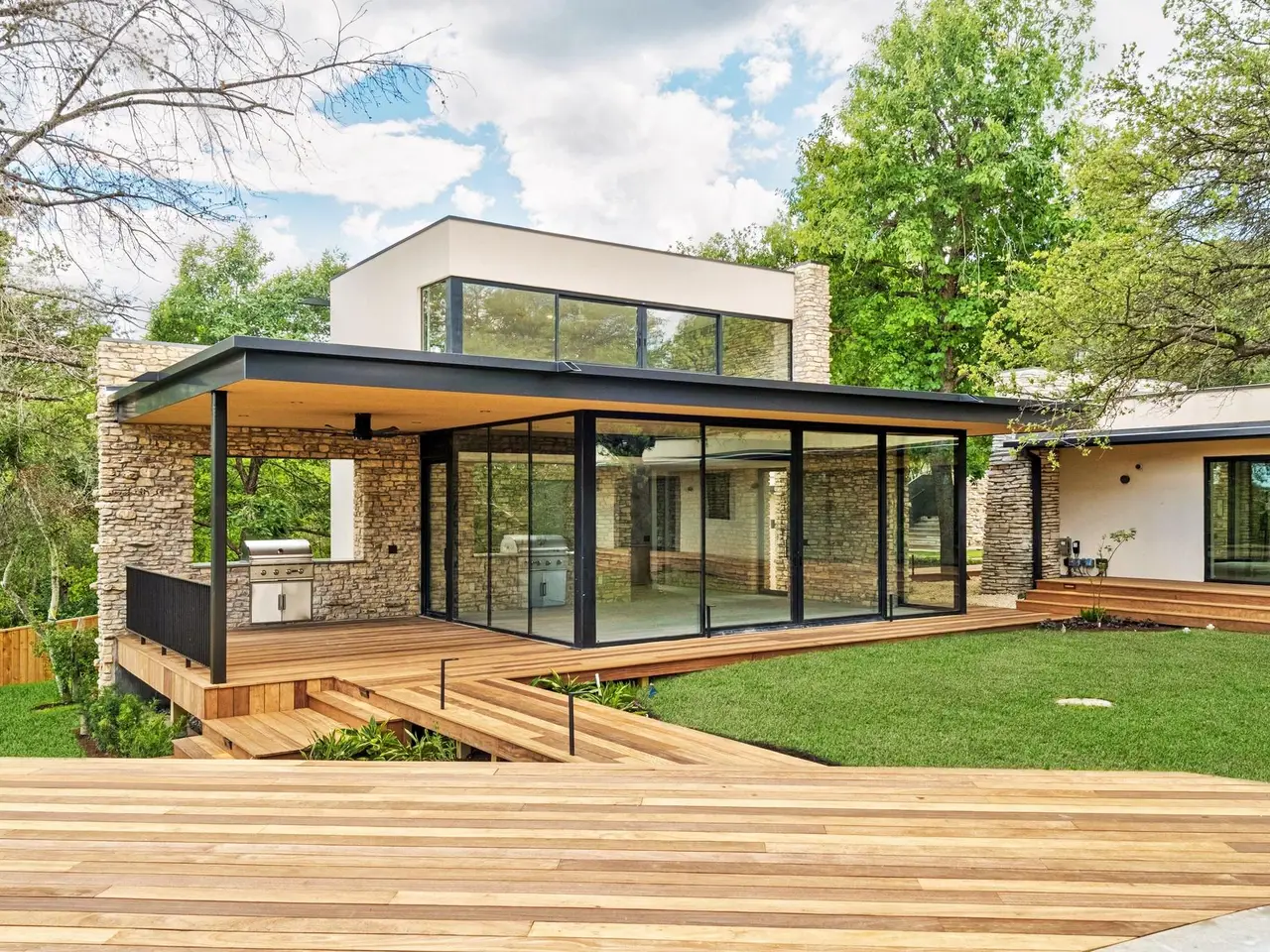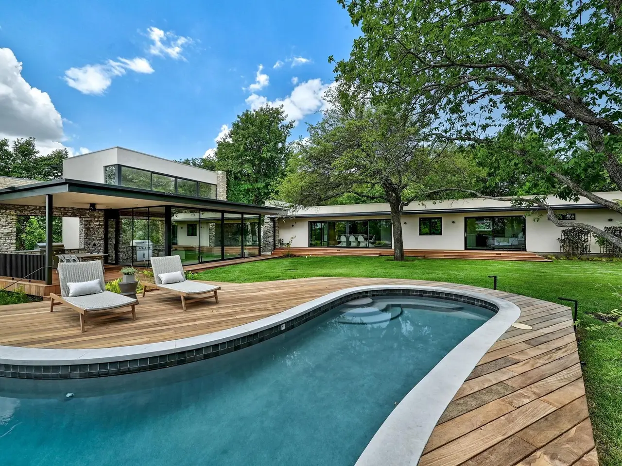 Tucked beneath a canopy of mature trees, 201 Redbud Trail invites you to experience the timeless charm of an expertly restored mid-century home, complete with a detached guest casita and pool house. Glass walls and expansive sliding doors open the home to its lush surroundings, blurring the boundary between indoors and out in the heart of central Westlake. From the moment you arrive, the architecture nods to another era -- but the updates are thoroughly modern, with elevated finishes, fixtures, and functionality throughout. The main residence features light-filled living spaces that open to patios and a pool courtyard, while the detached guest quarters include a fully outfitted outdoor kitchen -- ideal for entertaining or accommodating guests with privacy. This home offers the rare combination of architectural integrity, modern comfort, and natural seclusion -- all within Eanes ISD and just a few miles from downtown Austin and retail and dining in Westlake.
