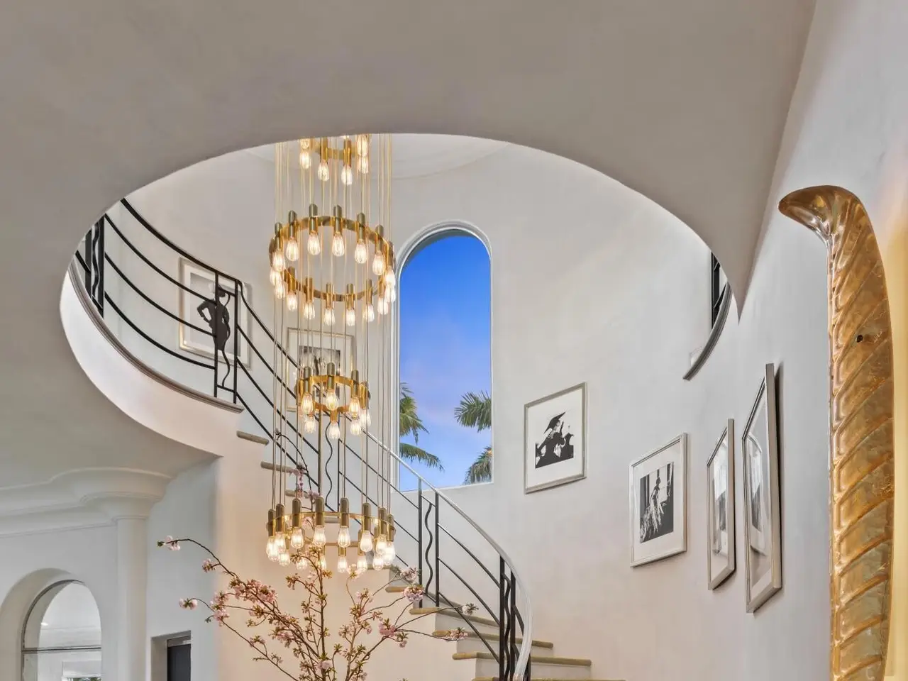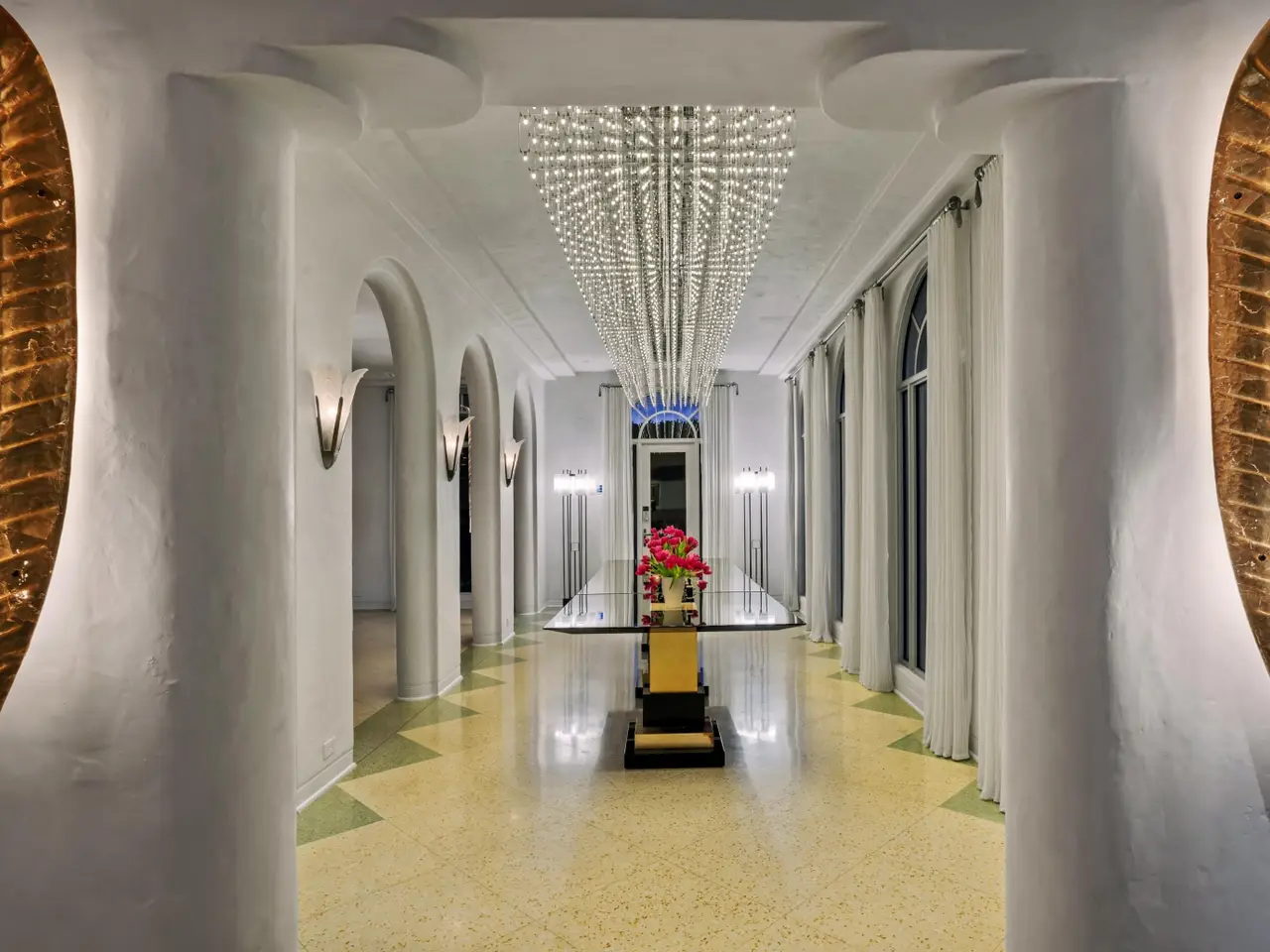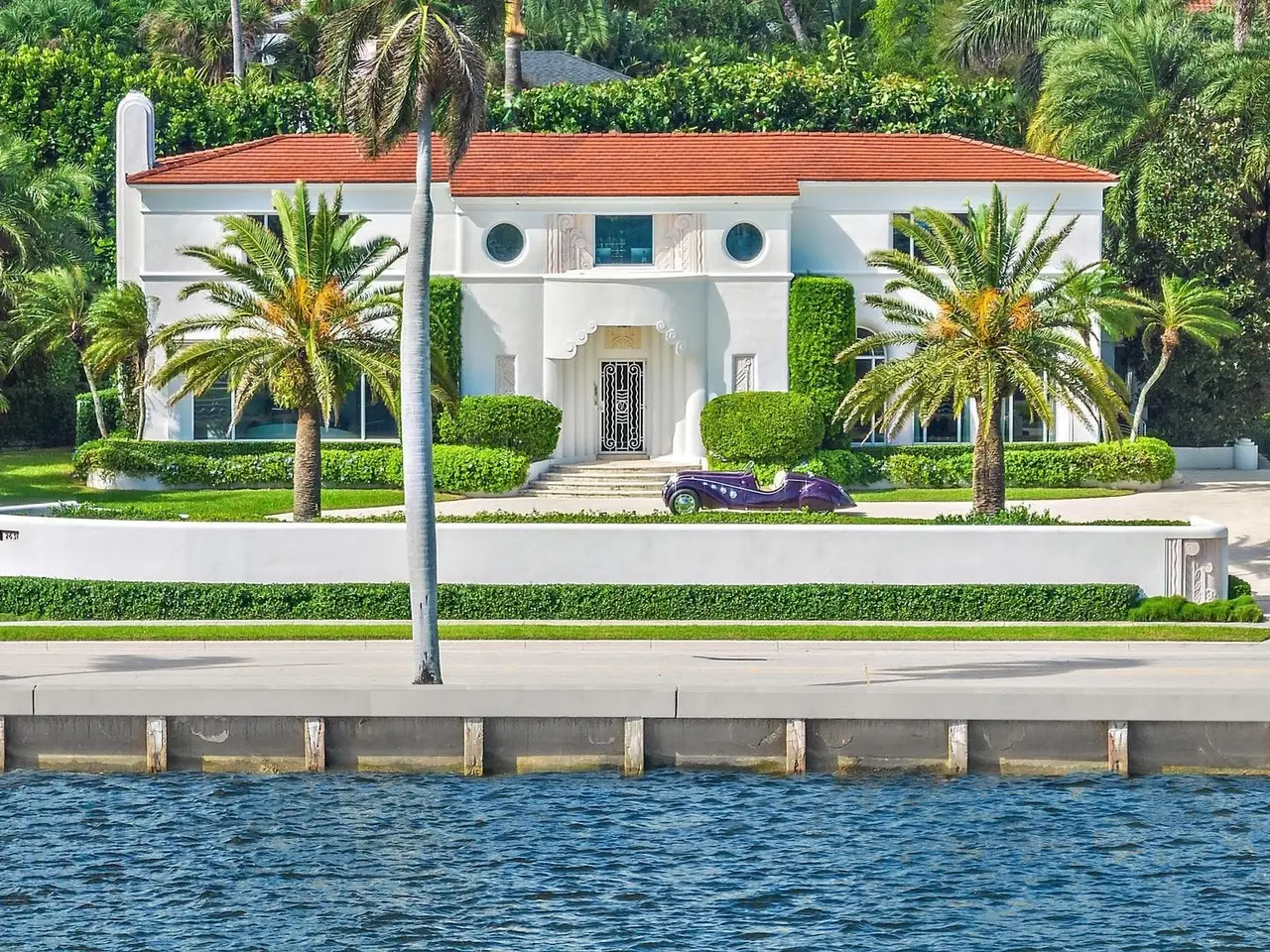 On the West Palm Beach waterfront, this 1937 Belford Shoumate iconic architectural legacy beautifully bridges its nautical moderne heritage with today's modern luxury. Thoughtfully and comprehensively updated, the home retains its signature period details- including sea-foam green terrazzo floors, wavy ironwork banisters, a graceful circular staircase crowned by a domed ceiling frieze, and a curved fireplace-all blending historic artistry with contemporary sophistication. Steamship-inspired railings, a blue-tile-lined pool, and a scrolled stucco banister leading to a side entry complete the picturesque waterfront setting. Featuring 6 BR, 7.1 Ba, elevator, 3-car garage, and outdoor kitchen, this landmark property spans 23,836+/- SF of magnificence along the Intracoastal.