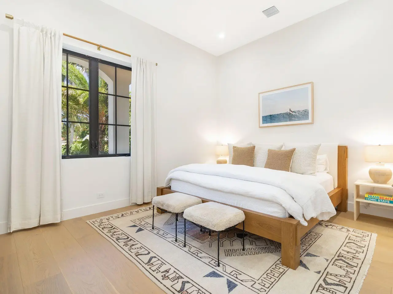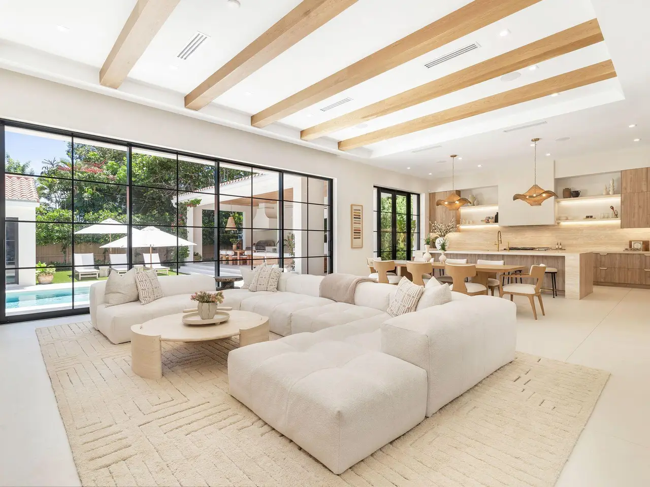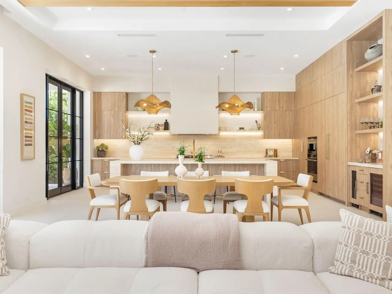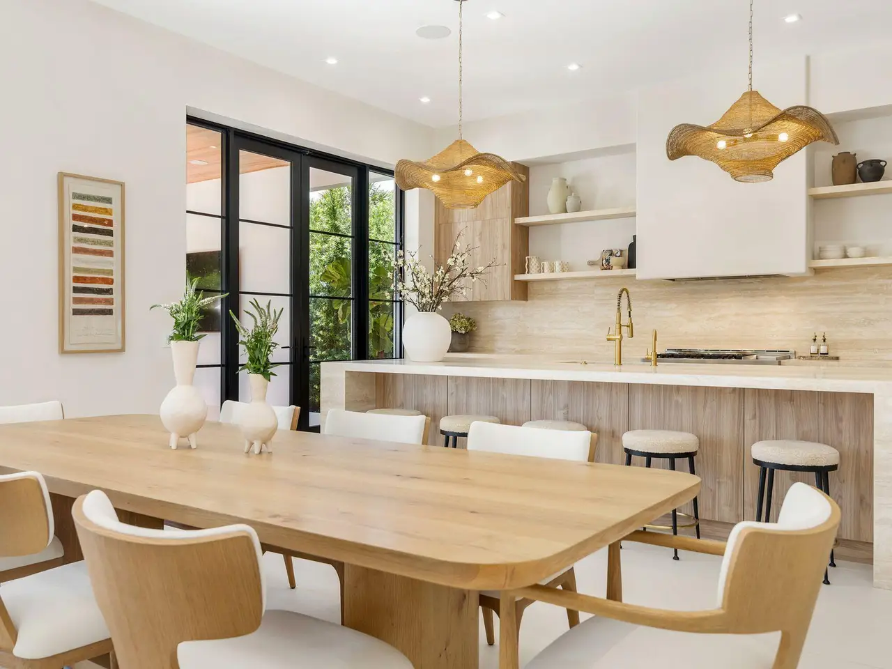 Uber-chic and effortlessly cool, this modern Mediterranean residence combines refined design with a warm, livable feel. Built in 2024 and offered fully furnished, the home features 4 bedrooms, 3 full baths, and 2 powder rooms -- completely turnkey and ready to enjoy. With 12' ceilings on the main level and a dramatic wall of 10' sliding glass doors, the interiors are open, airy, and designed for both everyday living and entertaining. The view from the custom front door carries straight through to the south-facing pool, where a Badu swim jet, covered loggia, summer kitchen, and gym/guest cabana create a true private retreat. Every element of the chef's kitchen has been thoughtfully considered, from the travertine countertops and backsplash to the custom pulls - this kitchen is dreamy!