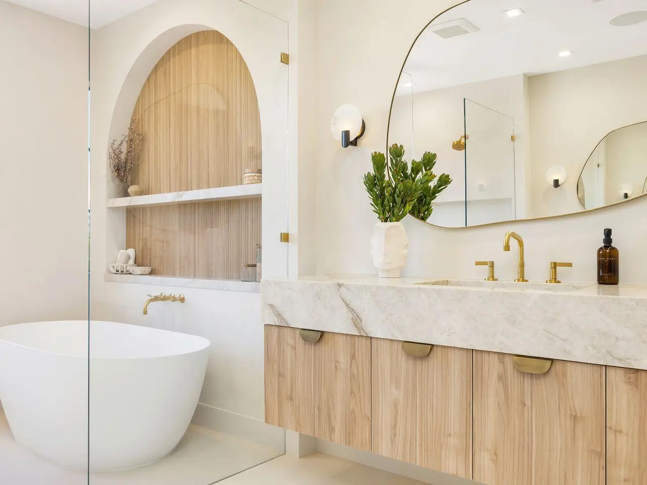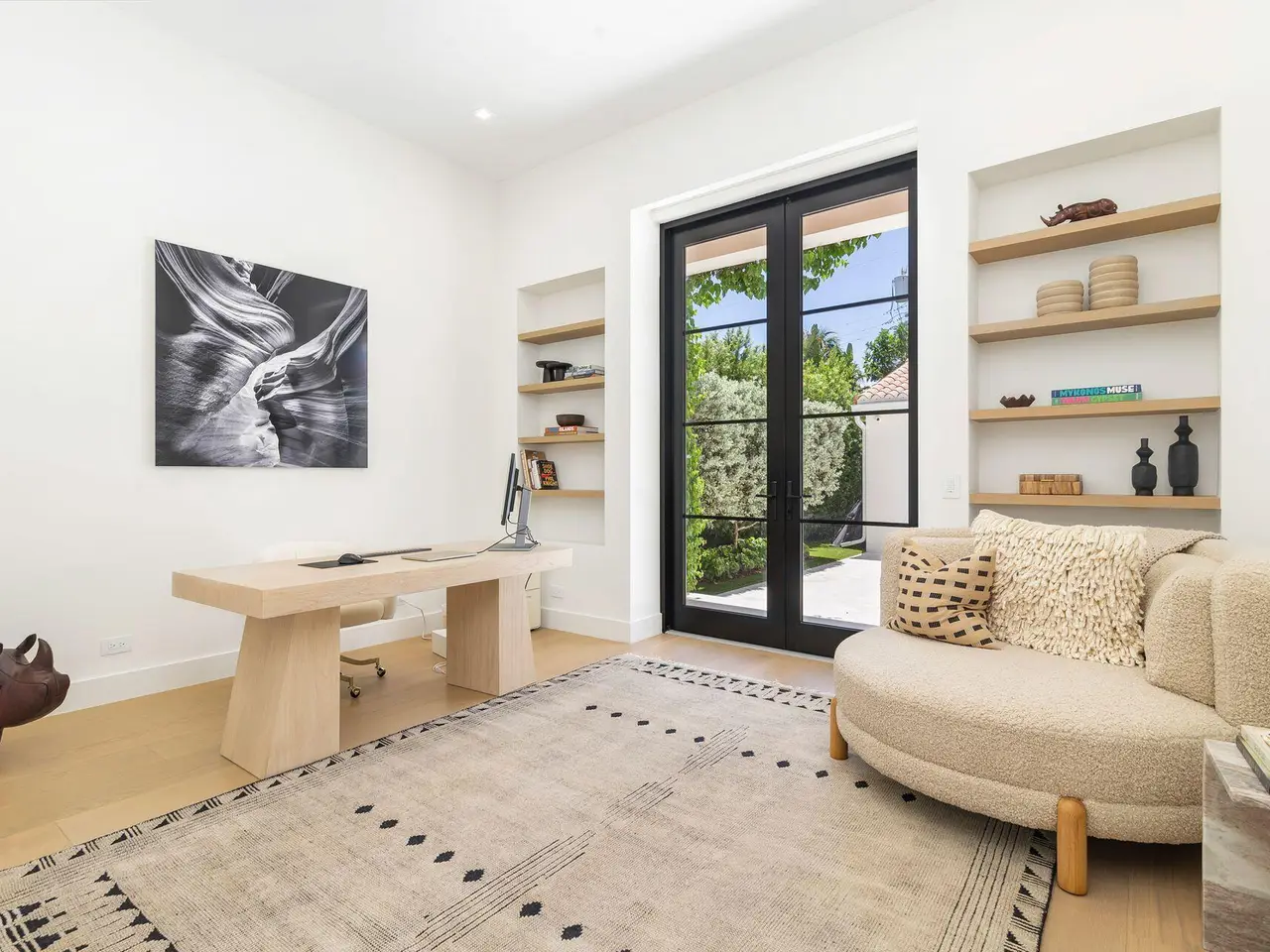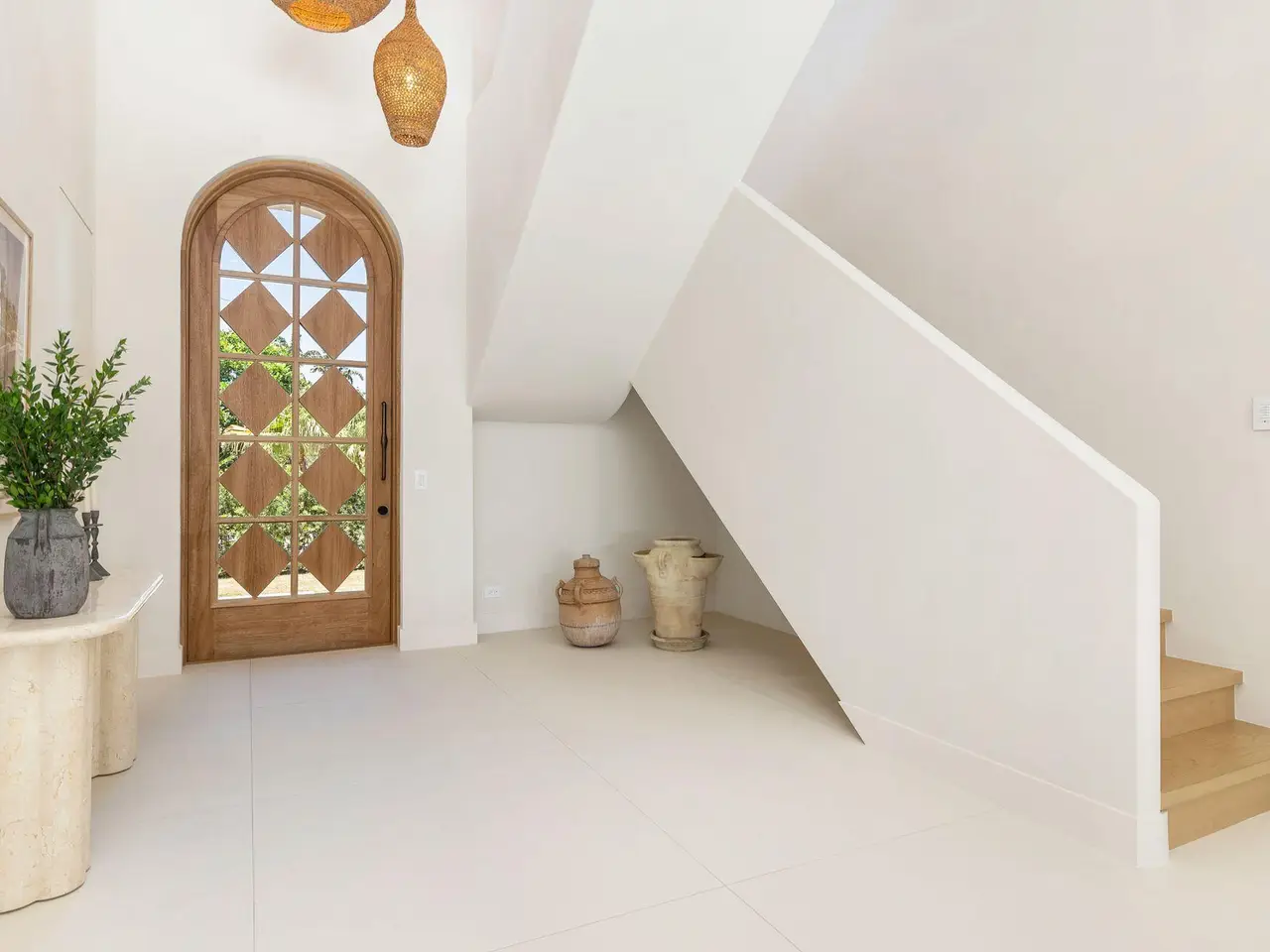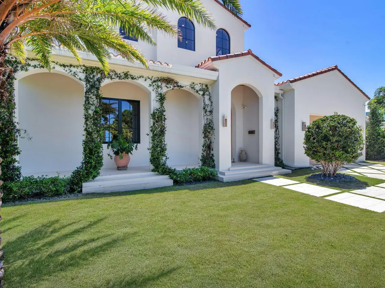 Uber-chic and effortlessly cool, this modern Mediterranean residence combines refined design with a warm, livable feel. Built in 2024 and offered fully furnished, the home features 4 bedrooms, 3 full baths, and 2 powder rooms -- completely turnkey and ready to enjoy. With 12' ceilings on the main level and a dramatic wall of 10' sliding glass doors, the interiors are open, airy, and designed for both everyday living and entertaining. The view from the custom front door carries straight through to the south-facing pool, where a Badu swim jet, covered loggia, summer kitchen, and gym/guest cabana create a true private retreat. Every element of the chef's kitchen has been thoughtfully considered, from the travertine countertops and backsplash to the custom pulls - this kitchen is dreamy!