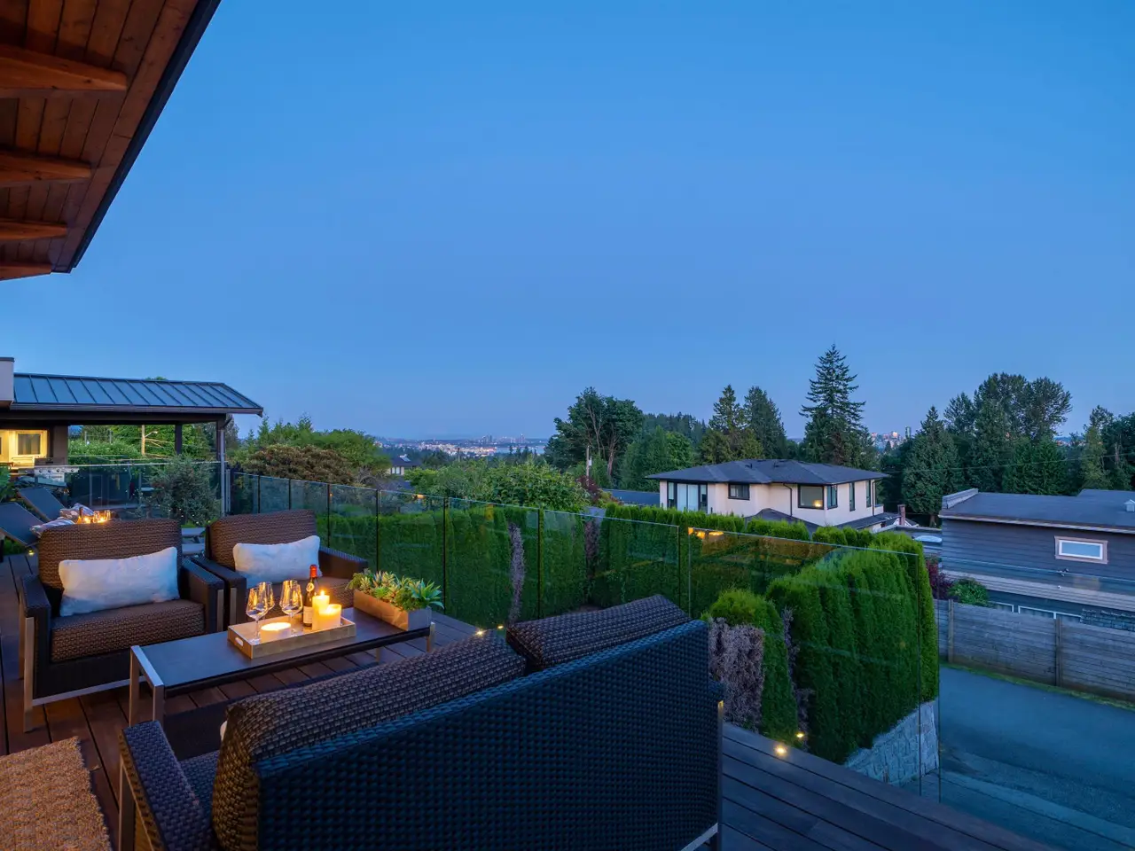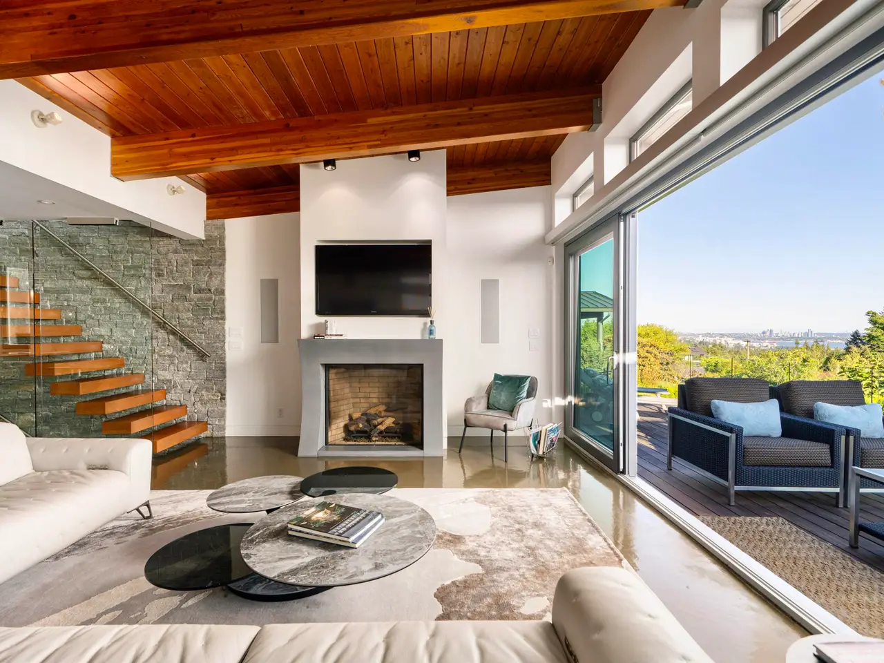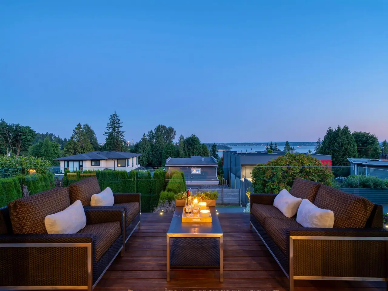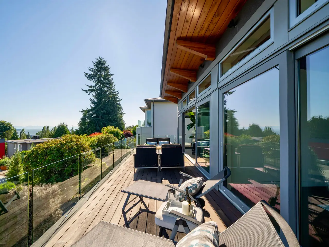 Sweeping panoramic views from Mt. Baker, Vancouver Harbour, Burrard Inlet, Strait of Georgia & Vancouver Island’s coastal mountains, an ever-changing west coast canvas from sunrise to sunset. Designed by renowned Gary Van Dijk, this modern, architecturally refined home offers open-concept living, soaring 10'-14' vaulted ceilings, expansive glazing, floating stairs &seamless indoor-outdoor flow. Primary bdrm on the main level, w/ a huge WIC & spa-like ensuite feat. oversized steam shower & Victoria+Albert soaker tub. Upper level open office can easily convert to 4th bdrm. Located in lower BP in a quiet cul-de-sac, mins to Park Royal & Mulgrave, walking distance to Sentinel Secondary, Chartwell elementary & Hollyburn; easy access to downtown & anywhere on the Shore. Meticulously maintained.