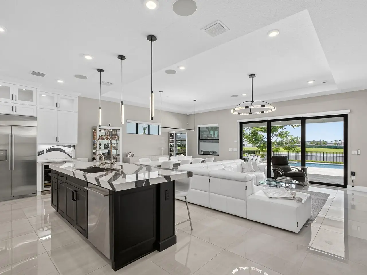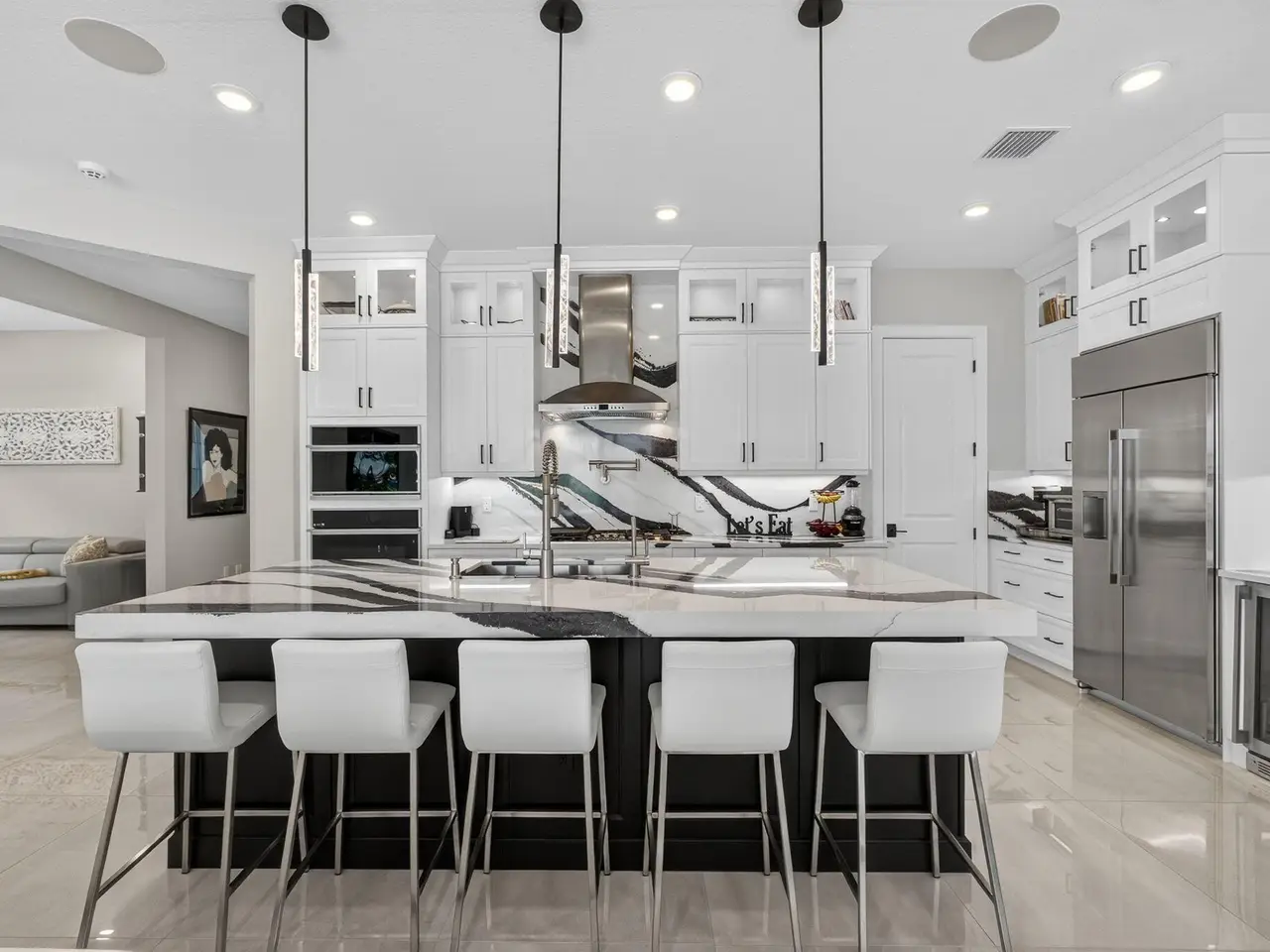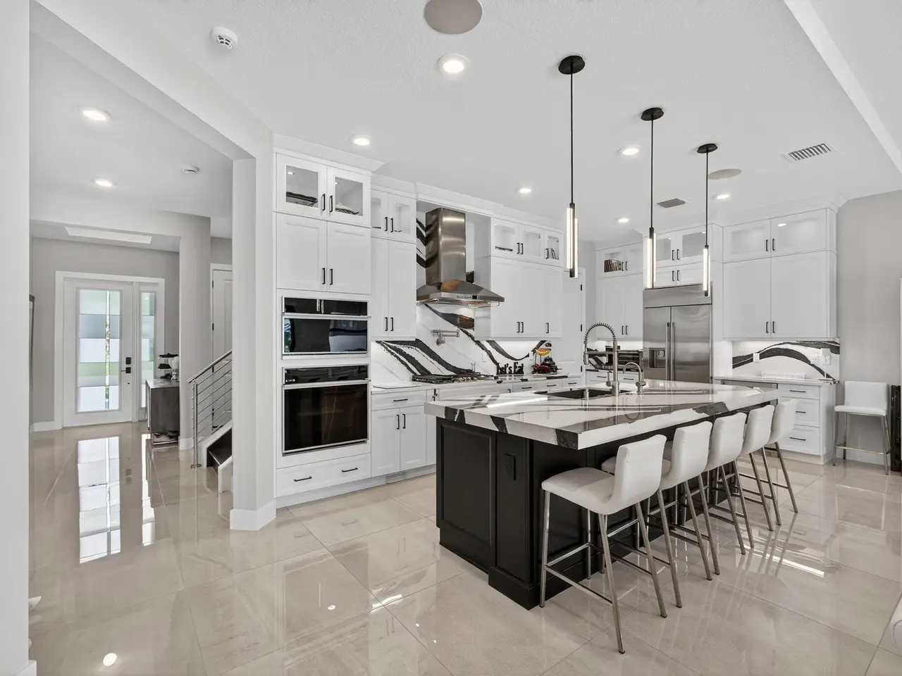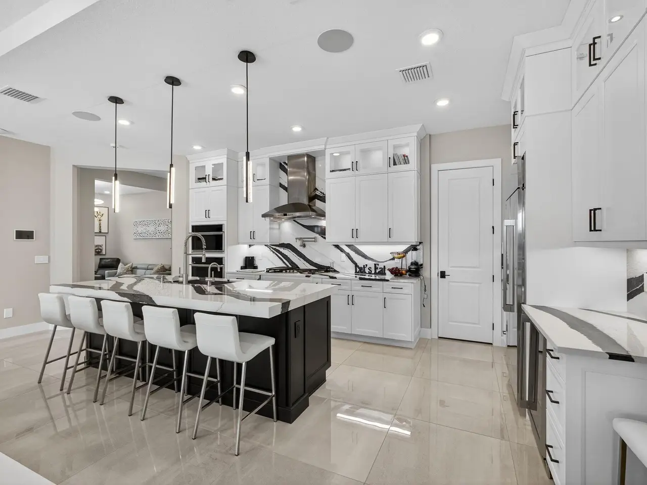 This is luxury Florida living at its finest, located on a waterfront lot, this designer styled home has been thoughtfully crafted with limitless upgrades and high-end finishes. The focal point of this home is the gourmet kitchen with waterfall quartz counters, level 7 soft close cabinets, GE Monogram SS appliances, six burner gas stove top, massive island and custom walk in butlers pantry. The luxurious primary suite features hardwood flooring, an oversized his/her walk in closet, smart mirrors and a spa like bathroom. The outdoor space is a true oasis featuring a heated pool surrounded by travertine decking, water views and a storm smart screening system. Also enjoy smart home technology, complete indoor/outdoor surround sound system and modern home theatre.