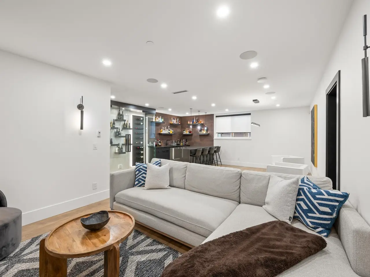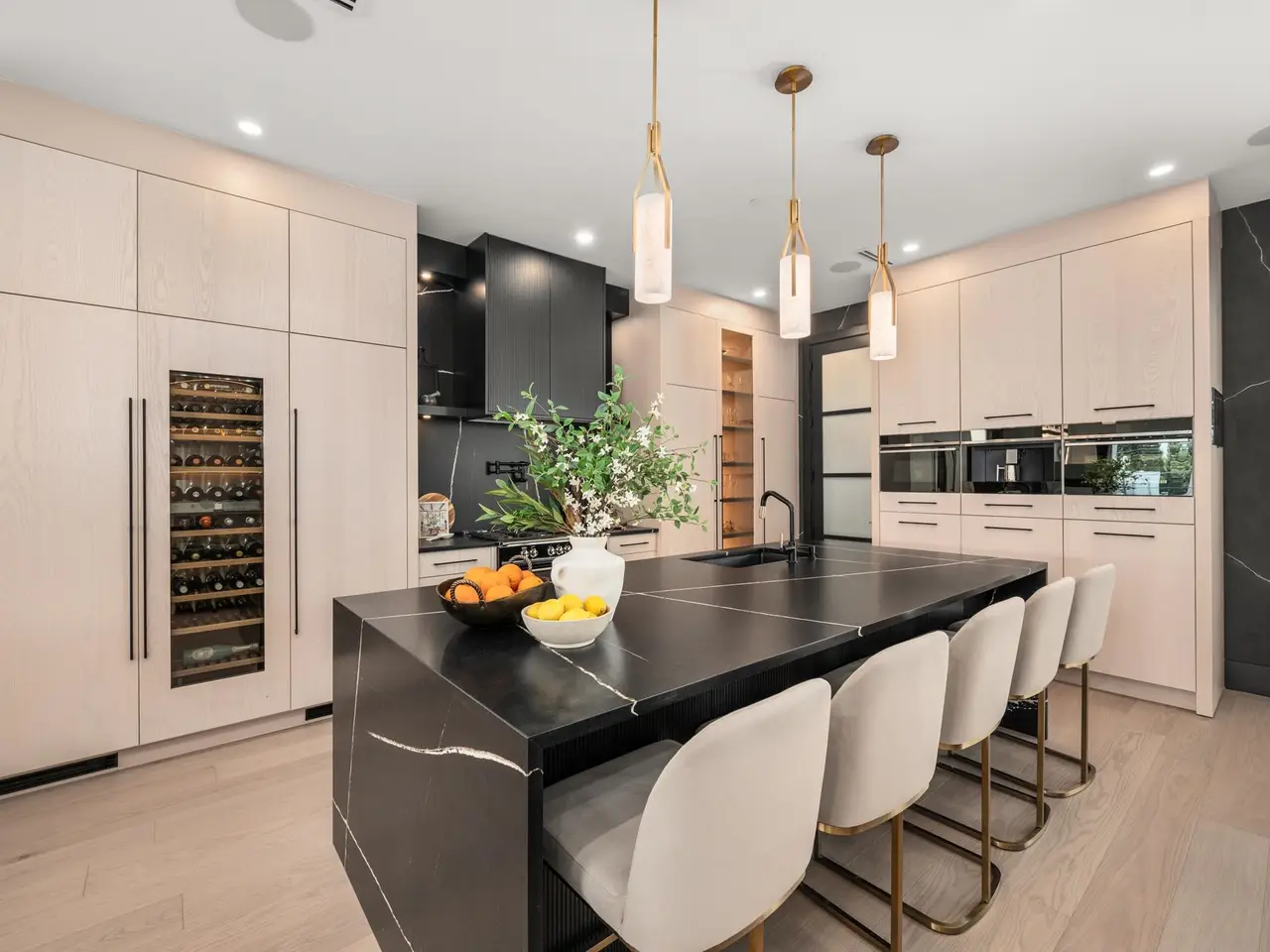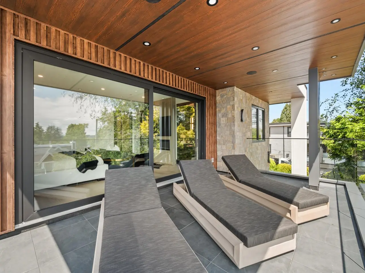 Stunning design & quality construction by Rychter Custom Homes. Elegant Hardwood, floating staircase, abundant light, & extensive wood features are just the start. Spacious covered deck access from living room with view. Radiant heat, A/C, automated blinds, Control 4 - smart home, on demand H/W, Retractable B/I Vac, Shinnoki Panel Cabinetry with integrated Liebherr Fridge, wine cooler & 24" Freezer. Fisher Paykel appliances, B/I Coffee/Espresso & Steam Oven. Spice kitchen. Covered outdoor living space with built-in barbecue station. Primary suite has open glass wall to the sundeck with view of the mountains & ocean. Additional balcony off back bedroom. 1-bed legal suite is also registered with Airbnb. Basement offers rec room with wet bar, wine storage & sauna.