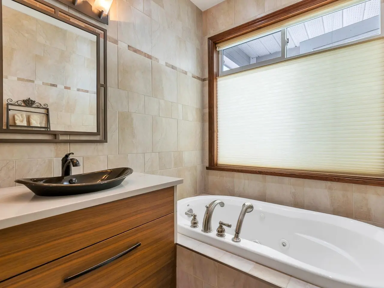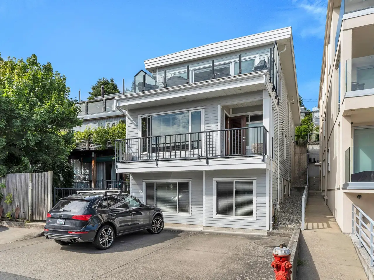Ocean view updated 3 bedroom hillside home with 2 bedroom legal suite with separate access & laundry and great parking. Quality built home with hot water radiant heat for all 3 levels with 5 zones, low maintenance hardie plank siding. wood metal clad windows & sliding doors, 9' ceilings, tiled floors on the main floor with double 4' sliding doors leading to spacious ocean view deck featuring 2 cm porcelain tiles complimented with topless railings & privacy screens both sides of the deck. Some extra feature include wood interior doors and trims, tall baseboards, crown and detailed ceilings, gorgeous updated kitchen with cabinets to the ceiling complimented with stainless steel appliance package, quartz countertops, backsplash & matching island/breakfast bar with storage. Bonus media room!