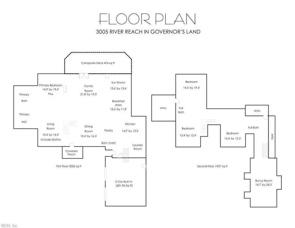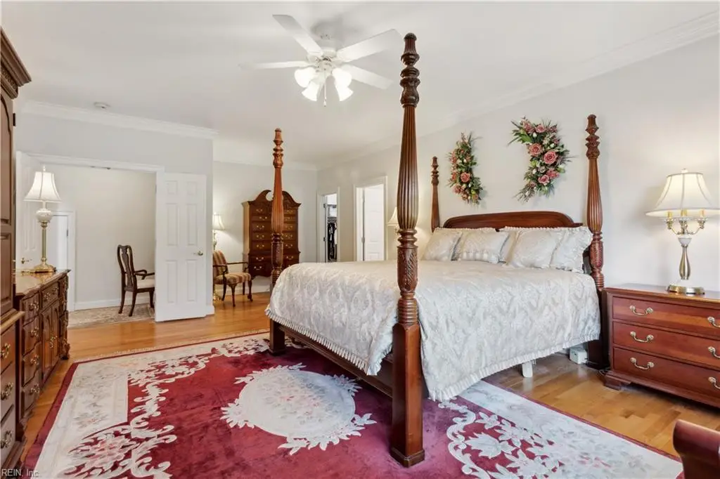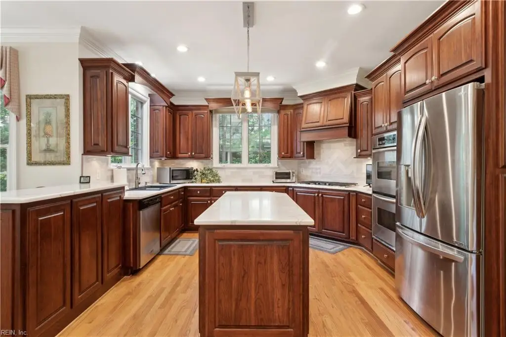 WOW! Exceptional waterfront living in this impeccably maintained all-brick home in Governor's Land. Enjoy serene pond views from nearly every room. The light-filled great room features a soaring cathedral ceiling, fireplace, built-ins, and a wall of windows framing tranquil water vistas. A gracious two-story foyer is flanked by a study with built-ins and a formal dining room with detailed millwork and butler's pantry. The renovated kitchen (2021) offers quartz countertops, tiled backsplash, and a large pantry opening to the breakfast area and sunroom with deck access. The first-floor primary suite offers water views, a beautifully updated en suite bath, and a generous walk-in closet. Upstairs, bedrooms 2 and 3 share a Jack and Jill bath, while bedroom 4 features a private en suite. A spacious bonus room is accessed by a back staircase. Outdoor living is easy with a large deck overlooking the private backyard and pond.