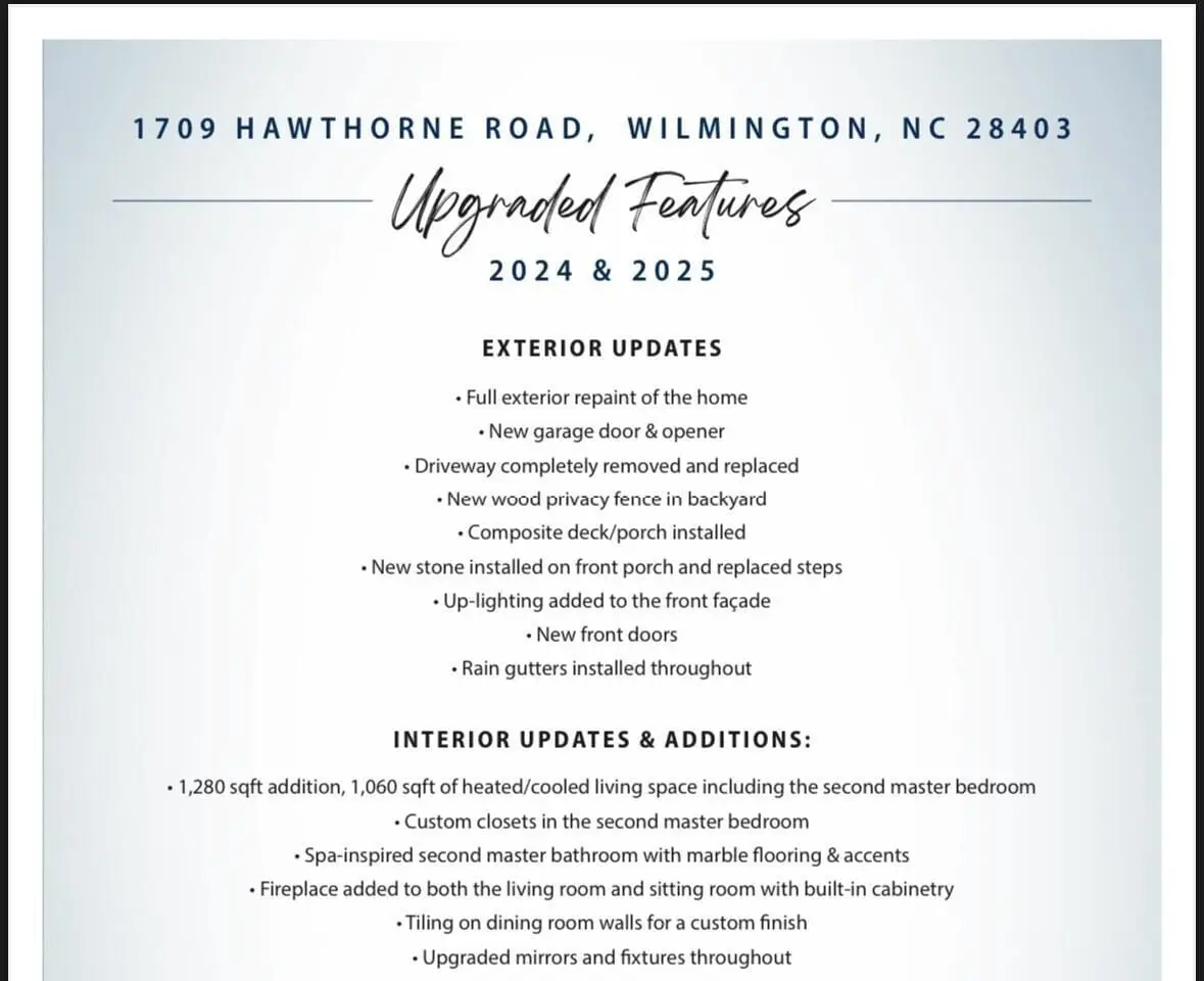Welcome to this beautifully renovated, single-level home in the highly sought-after South Oleander neighborhood--just minutes from the prestigious Cape Fear Country Club. This home has undergone a major renovation adding over 1,000 square feet, including the addition of a second primary suite offering flexible living options for multigenerational families, guests, or those seeking a luxurious home. Blending modern elegance with timeless charm, the home features hardwood floors throughout the main living areas and master bedrooms, plush luxury carpeting in the guest bedrooms, and designer tile and marble accents in the bathrooms. The heart of the home is the show-stopping kitchen, boasting stainless steel appliances, custom cabinetry, sleek countertops, and a generous oversized island--perfect for entertaining or casual dining. Retreat to either of the two spacious primary suites, each offering a spa-like bathroom, soaking tub, walk-in shower, and expansive walk-in closets. With custom lighting, fixtures, and finishes throughout, every inch of this home has been designed with comfort and sophistication in mind. This is more than just a house--it's the lifestyle upgrade you've been waiting for in one of Wilmington's most desirable neighborhoods. Private showings start Tuesday, July 28th, Contact cmorrison@intracoastalrealty for more info Schedule your private showing today!