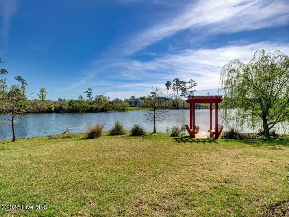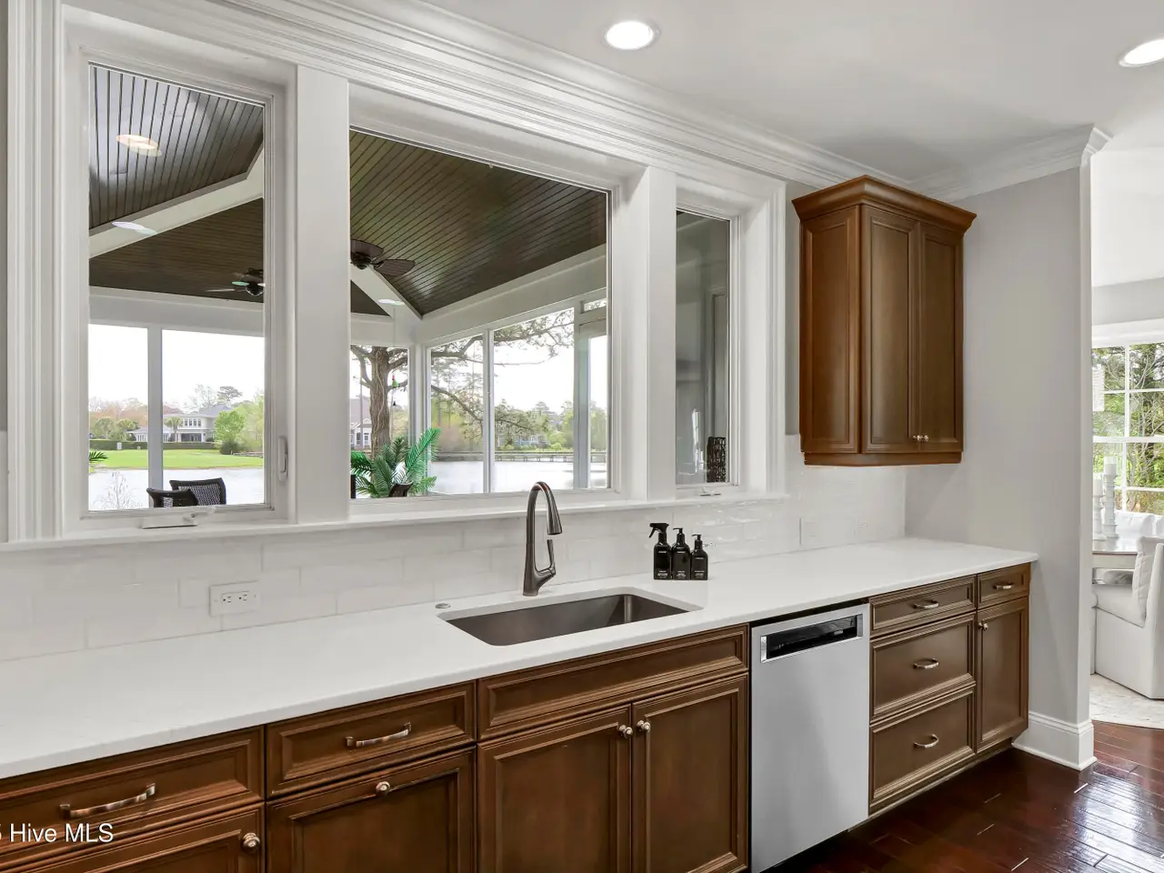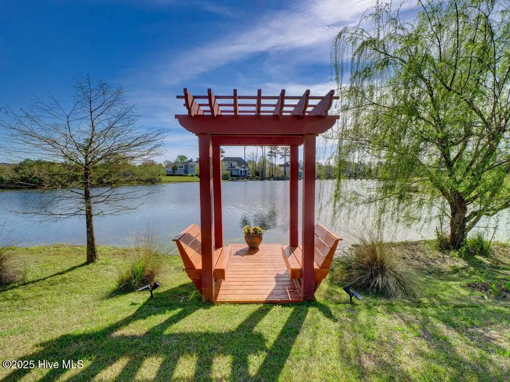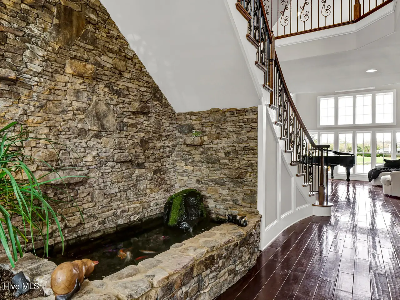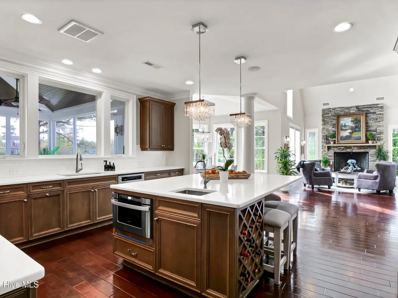 Situated on a quiet, private cul-de-sac in a peaceful peninsula-like setting is where you'll find this lovely lakefront Landfall sanctuary with Marsh #8 golf course views. Let your cares slip away as you gaze at swans gliding across the water, turtles basking in the sun or a variety of birds dancing in the breeze. The interior is equally as serene, as a Koi pond with fountain greets you in the foyer along with wood floors & soft, soothing colors that carry throughout formal and informal areas of this stunning residence. You'll love hosting memorable gatherings with family & friends in your gorgeous gourmet Kitchen complete with beautiful new quartz countertop, a Thermador professional series 6 burner natural gas range & 2 ovens, Thermador refrigerator, new dishwasher new microwave, beverage refrigerator, even reverse osmosis, a prep sink & roll out shelves. The generous Kitchen opens to formal & informal living & dining spaces with a stacked stone natural gas or woodburning fireplace. You'll find 2 offices/bedrooms with adjoining balcony and full bath on the first level; upstairs enjoy 4 bedrooms including the oversized Primary Suite with vaulted ceilings, a reading/exercise/meditation area, spacious walk-in closet, sizable jetted tub AND separate jetted shower. Heaven inside & out. Instantly fall in love with the incredible outdoor space - whether entertaining on your lanai, telling tales around the firepit, or simply sitting under the arbor near the water feeling the sunshine. Other special features of this amazing home include 107 windows including floor to ceiling in the Great Room offering abundant natural light, repainted interior, 2 on-demand hot water systems, whole house water filtration system, irrigation system on a well, efficient geothermal heating & cooling for very low energy bills, Laundry Room with sink & cabinets, wired for sound, oversized 2 car garage and fenced backyard. Wow.