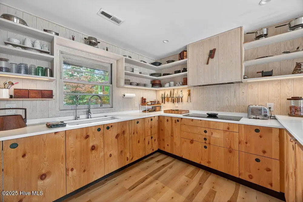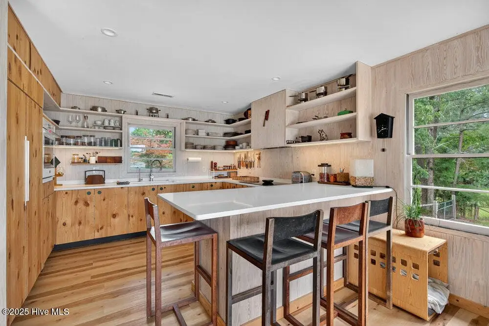 This rare two-acre estate is one of Wilmington's most unique offerings. Located on Hewletts Creek with a high elevation, south-facing peninsula which commands over 700 feet of water frontage. This coastal woodland property is filled with natural beauty: mature trees, abundant wildlife and front row access to fishing and boating. The meticulously restored 1955 mid-century ranch house utilizes organic materials throughout, clad in cypress, blending perfectly into the landscape. Perched well above the flood zone, joining the indoors and out seamlessly, the residence was designed for those who appreciate a true connection to nature. The recently built freeform pool emerges from the rolling terrain, capturing mid-century design at its finest. The site’s perfect solar orientation presents magnificent light throughout the day, awe-inspiring star-gazing in the evenings, creating a nature preserve-like setting with unmatched privacy. A property like this becomes available once in a generation, a true Wilmington icon.