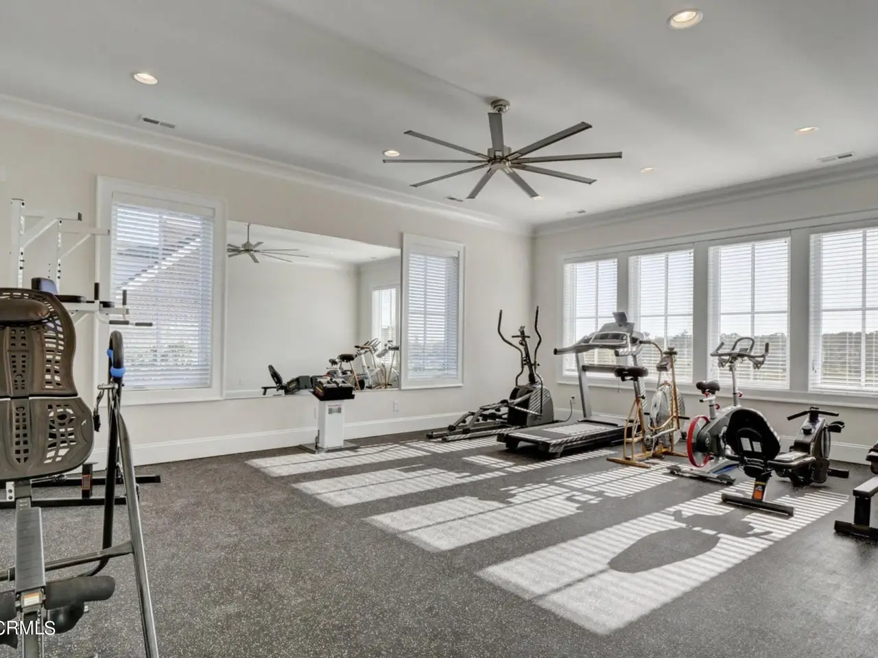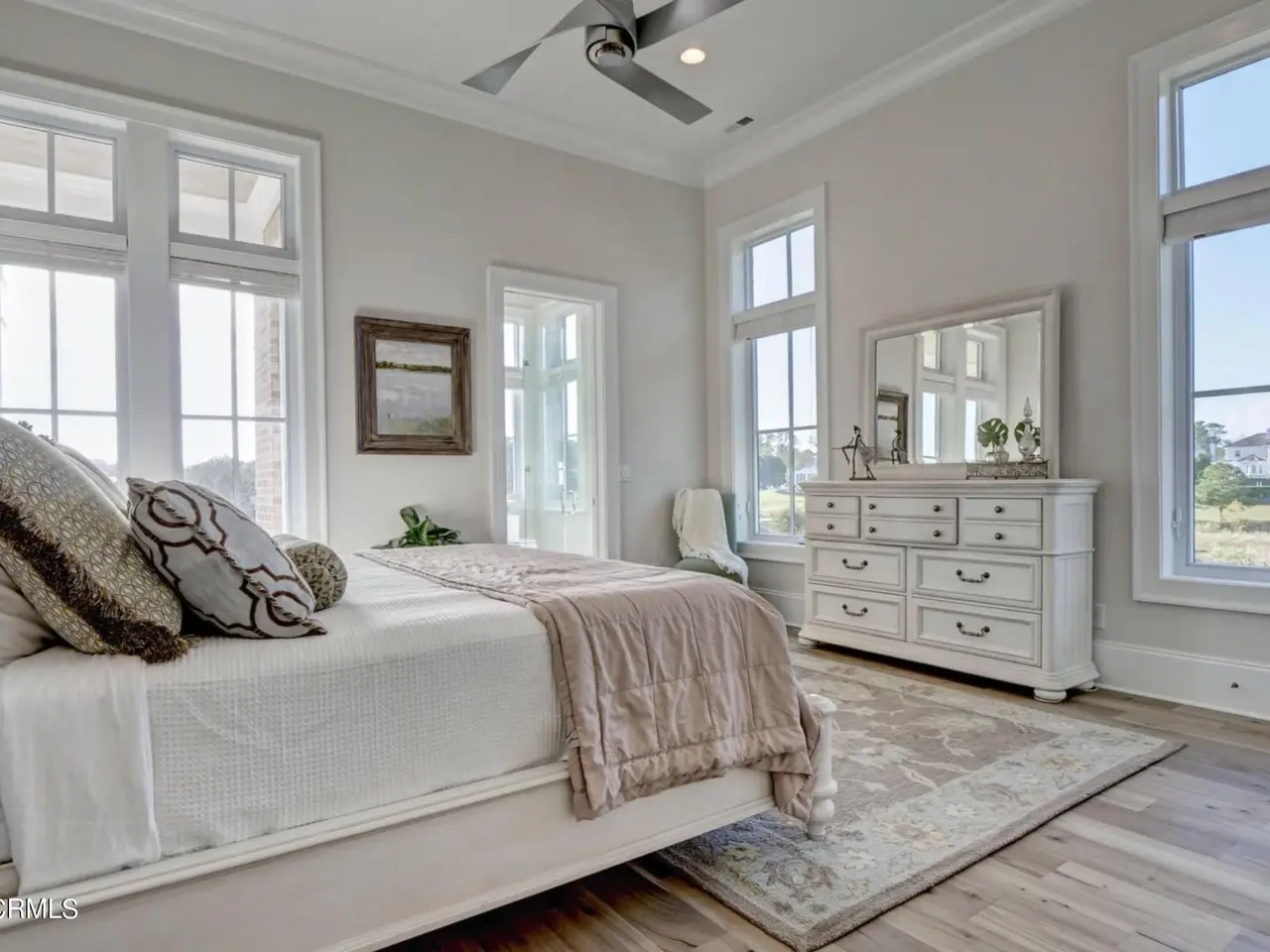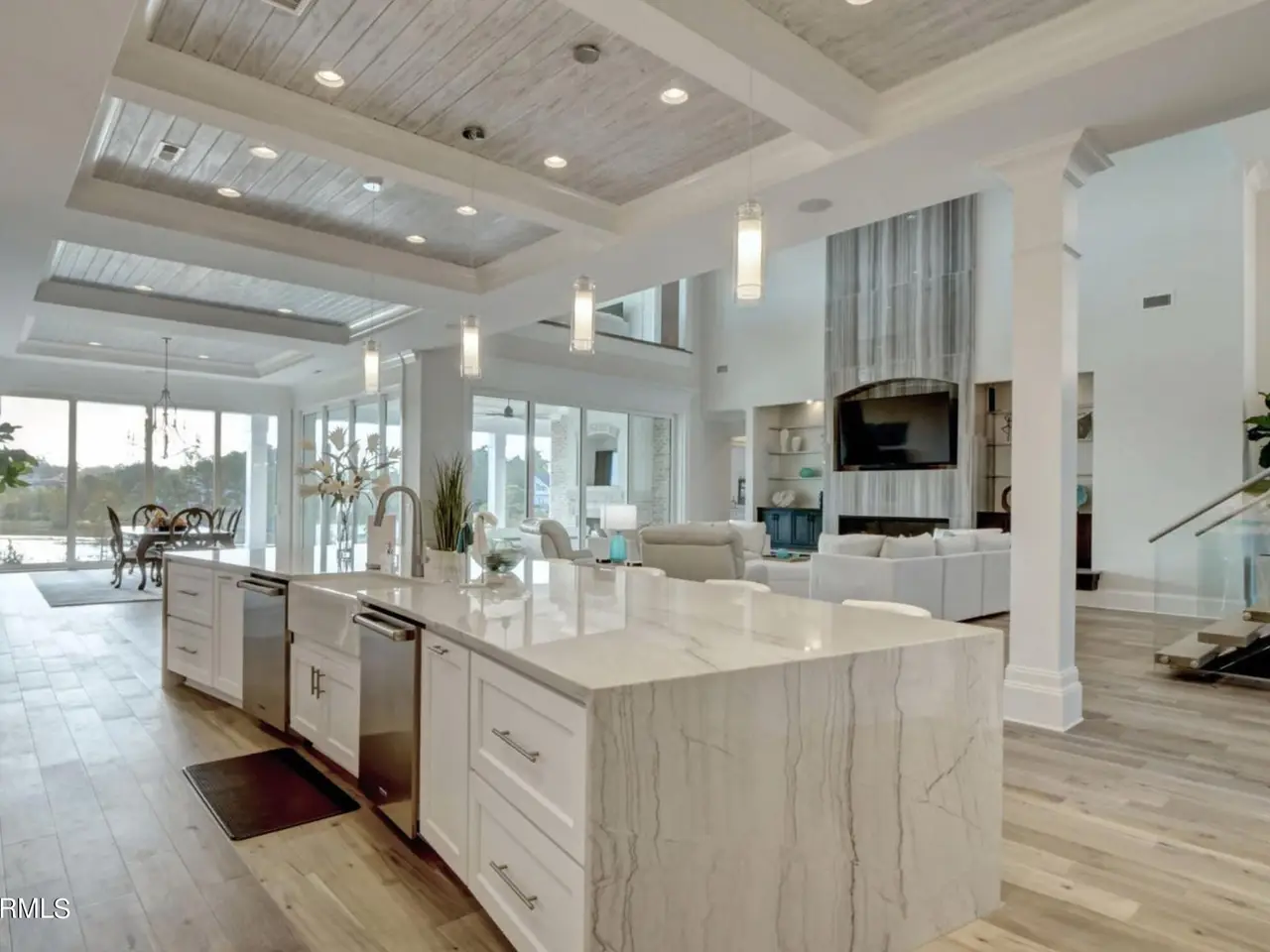 1737 S Moorings is a stunning coastal waterfront modern brick home with superb craftsmanship sitting on an idyllic lake front and golf course lot in the highly sought after gated community of Landfall and adjacent to Wrightsville Beach and endless amenities and restaurants. This beautiful home by Blanton Building features a spacious ''to die for'' chef's kitchen with stacked 2 level cabinetry, a huge island with farm sink, wet bar with wine and beverage refrigerators as well as a 48'' Wolf gas stove with double ovens and a separate Wolf wall oven and microwave, a 60'' Subzero refrigerator and 2 cove dishwashers. The three-car garage and 10 driveway parking areas welcome all visitors to this modern craftsman style. The first level boasts floating stairs with glass rails, 12-foot-plus ceilings with trays, beams and wood details. The first level also encompasses an exquisite master suite with floating vanities, large walk-in shower with multiple shower heads and body sprayers and his and her closets with direct access to the laundry. There are also three additional bedrooms and baths on the first level. On the second level, there are two other bedrooms and baths, a home gym, home theater, additional living area and a separate recreation room. Above the three-car garage is a bonus room suite with an additional bedroom, living area, full bath, laundry, and separate entrance. To add to the breathtaking water views, is a rear yard oasis complete with a pool, hot tub, covered lanai, and best of all- an outdoor kitchen. Another bonus of this property is the natural conservation area across the street providing extra privacy and walking paths. This is truly a show-stopping property that checks all the boxes and much more!
