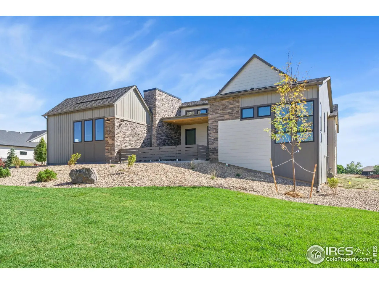 One of the last Alexandra's at Acadia in RainDance by Trumark Homes; a stunning, single-story home offering 4,710 finished sq.ft. with 4 bedrooms and 4.5 baths. Spacious great room with stained ceiling beams and contemporary fireplace with tile detail to the vaulted ceiling. The gourmet kitchen, featuring a walk-in pantry and an oversized center island, perfect for entertaining. The open kitchen includes dusk-stained shaker style with glass stacked cabinetry, Calacatta Classique quartz countertops with subway tile backsplash, Monogram/Electrolux stainless steel appliance package, and decorative matte black fixtures. A center-meet sliding glass door connects the light-filled dining room and great room to the covered outdoor east facing deck which features cedar tongue & groove ceiling detail. A dedicated office with a glass wall and door overlooks the covered deck. The primary suite features ample windows, a luxurious bathroom, walk-in shower, and an elegant freestanding tub. An oversized walk-in closet completes the primary suite. On the other side of the home, you'll find a large laundry, flex room, and two secondary bedrooms, both with ensuite bathrooms. Finished basement includes a rec room with wet bar, a fourth bedroom and full bath. The home comes with extensive 5" plank natural stained engineered wood flooring throughout the majority of the main floor, black interior windows, hand trowel drywall finish, luxurious carpet in bedrooms, spacious 10-foot ceilings throughout the main level and basement, eight-foot interior doors, 3-car side-load garage with insulated steel doors, tankless water heater, AC, and more. Beautiful 1-acre home site close to neighborhood park & RainDance National Golf Club. Optional Raindance pool amenity. Don't miss your chance to live at this remarkable master-planned community in Windsor, CO!