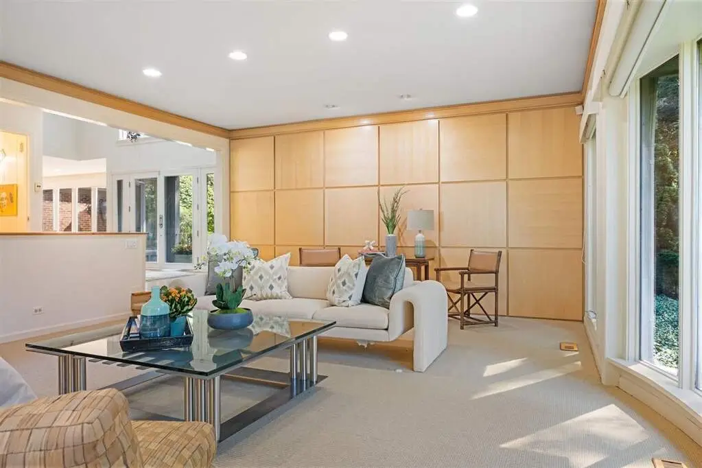 Transitional wood paneling in living room