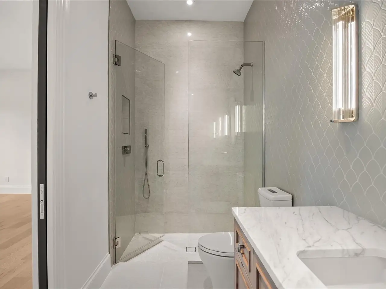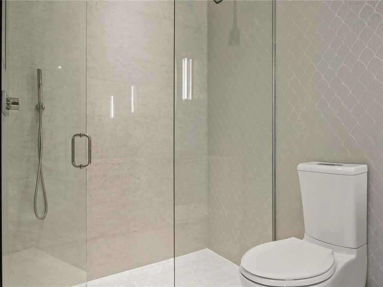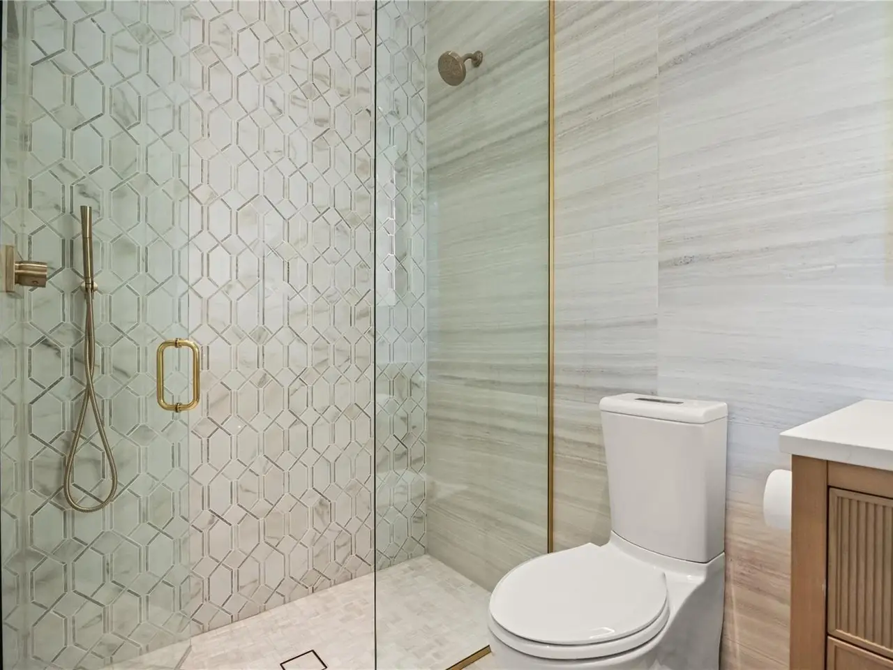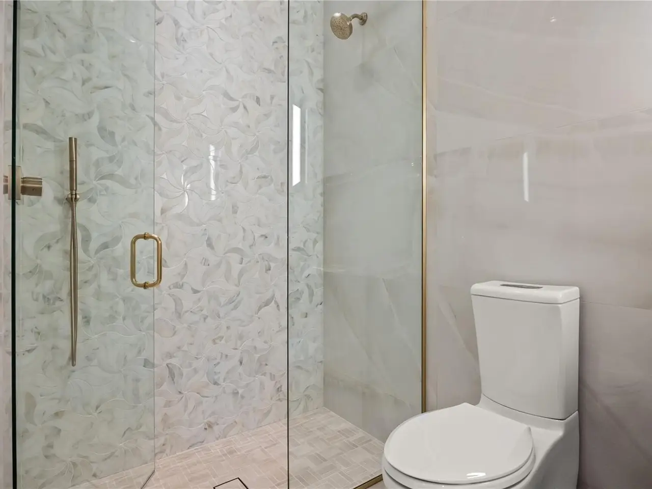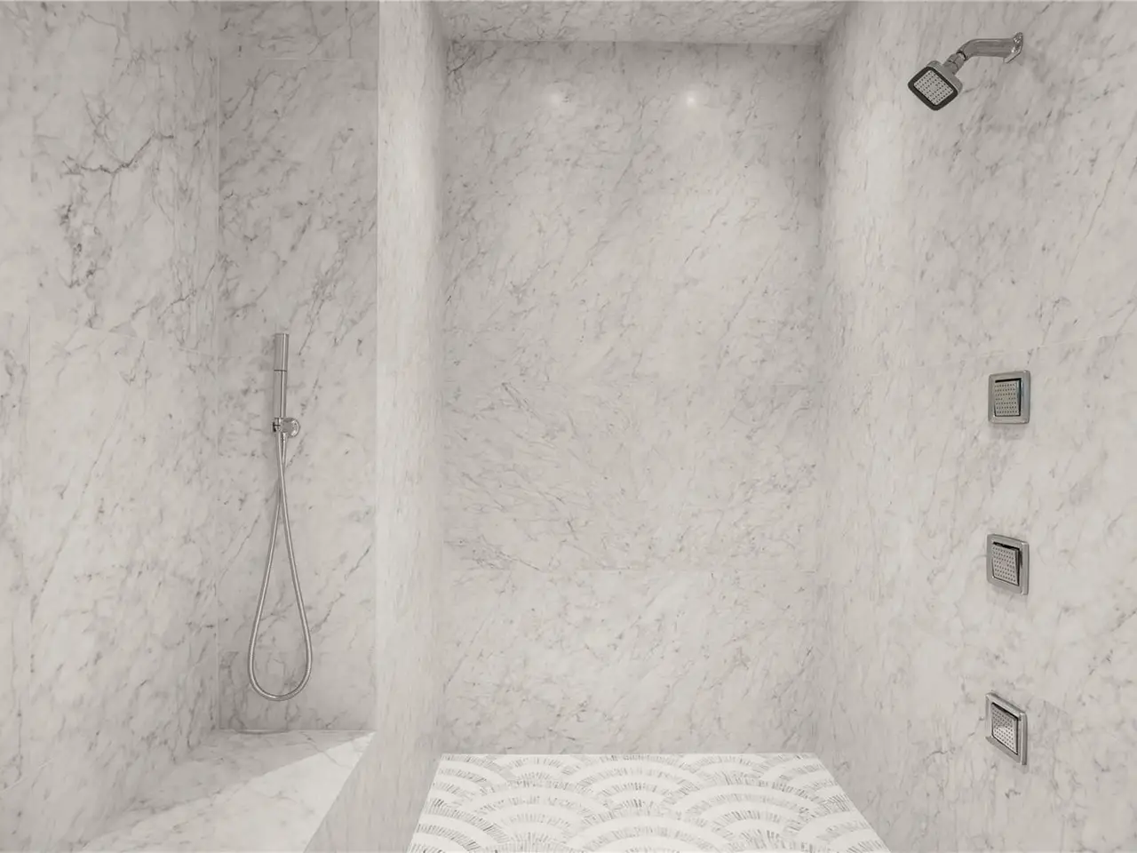 Marble mosaic-clad primary bathing suite with Kohler technology