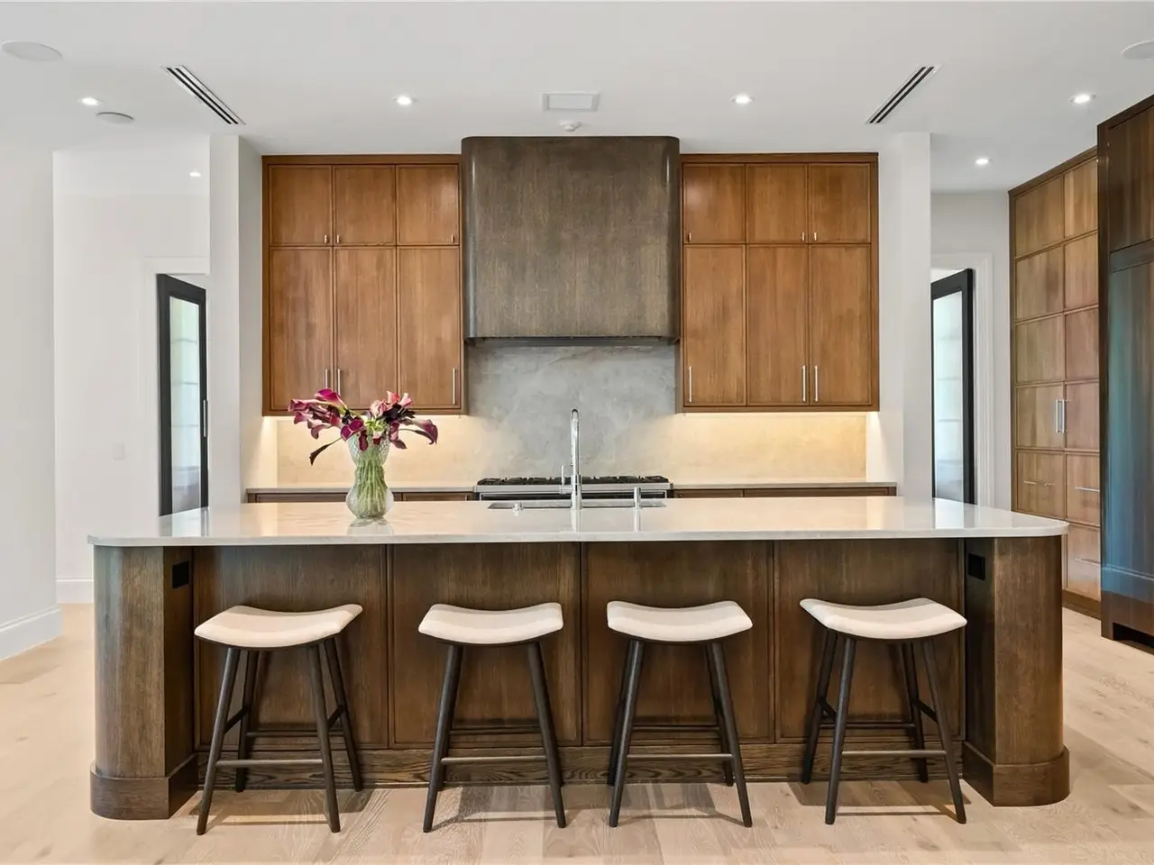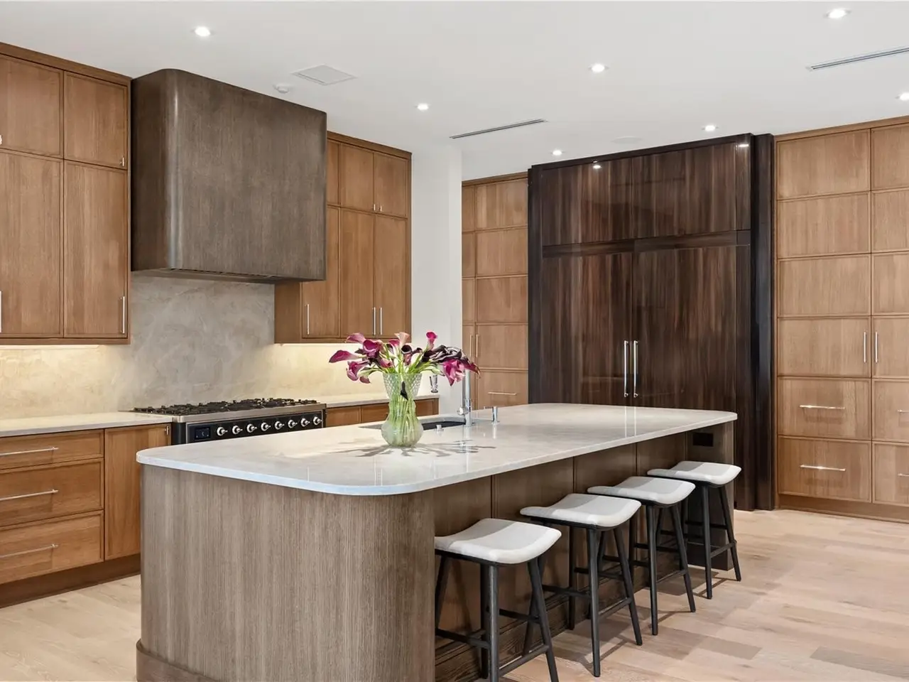 Curved two-tone oak kitchen with natural quartzite