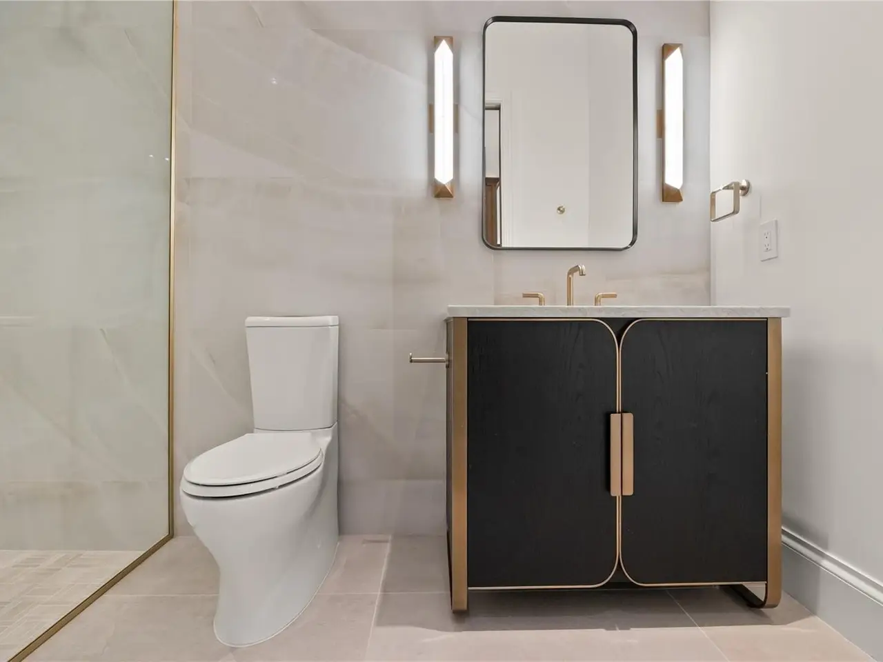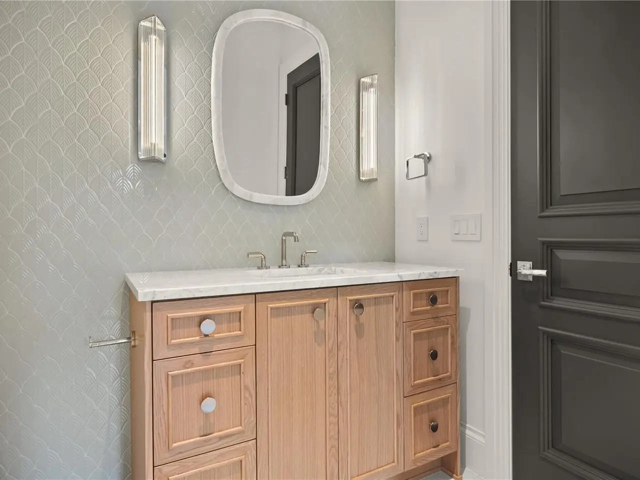 Bespoke powder bath with wood and marble accents
