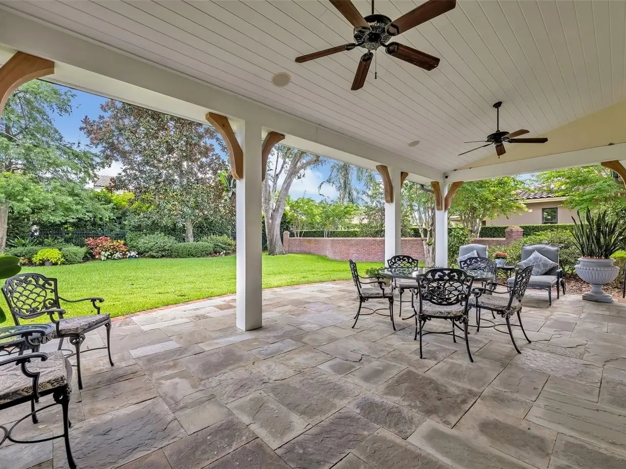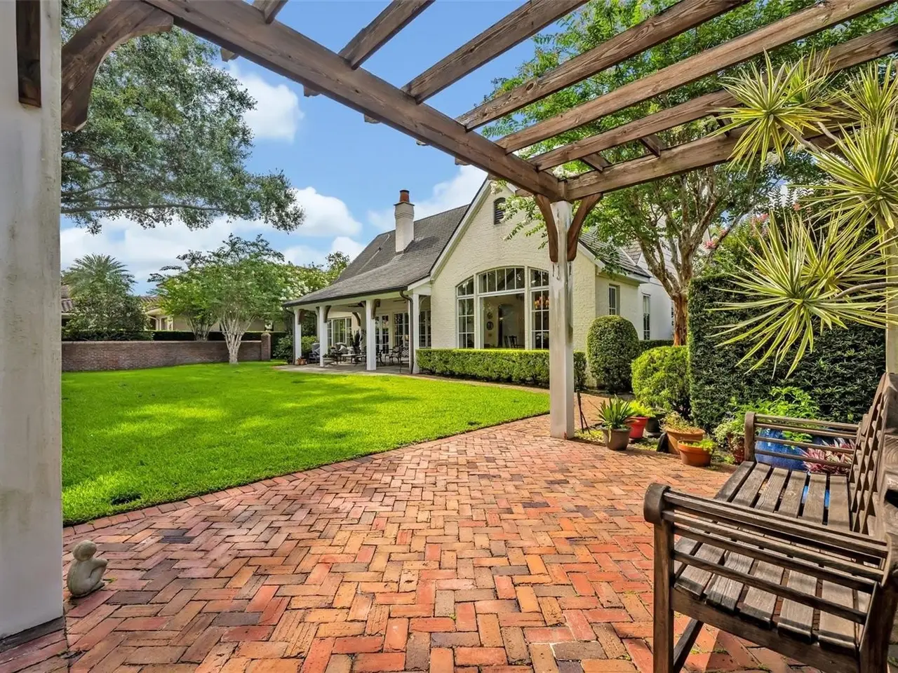 Stunning custom residence in the highly sought-after Windsong community, built by Hal George of Parkland Homes and designed by architect Steve Feller. This one-owner home blends timeless architecture with exceptional craftsmanship and thoughtful design. From the moment you arrive, the storybook curb appeal is undeniable—brick exterior and driveway, lush landscaping, and charming gardens create a warm welcome. Inside, luxury finishes abound: herringbone wood floors, crown molding, cased openings with arched doorways, custom built-ins and plantation shutters. The highly functional floor plan offers a downstairs owners’ suite plus a secondary bedroom (currently used as an office) with adjacent full bath. Upstairs, a spacious bonus room anchors two private bedroom suites. Soaring 10’ ceilings enhance the sense of space, with lots of natural light. The gourmet kitchen is a chef’s dream, featuring wood custom cabinetry, stainless steel appliances including a six-burner gas cooktop and Dacor double ovens, and an oversized island with sink. The kitchen flows seamlessly into the sunlit dining room with a dramatic vaulted 14’ beamed ceiling, comfortably seating 15. Set on a generous 0.38-acre lot, the outdoor living is equally impressive. The resort-style backyard showcases a covered patio with Pennsylvania Bluestone pavers, tongue-and-groove ceiling, and a charming detached garden house for storage. A serpentine wall winds gracefully through the landscaped grounds, offering privacy and charm. Additional highlights include an oversized two-car garage, indoor laundry with sink, and abundant storage throughout. A rare opportunity to own a meticulously maintained, beautifully appointed home in one of Winter Park’s most desirable communities.