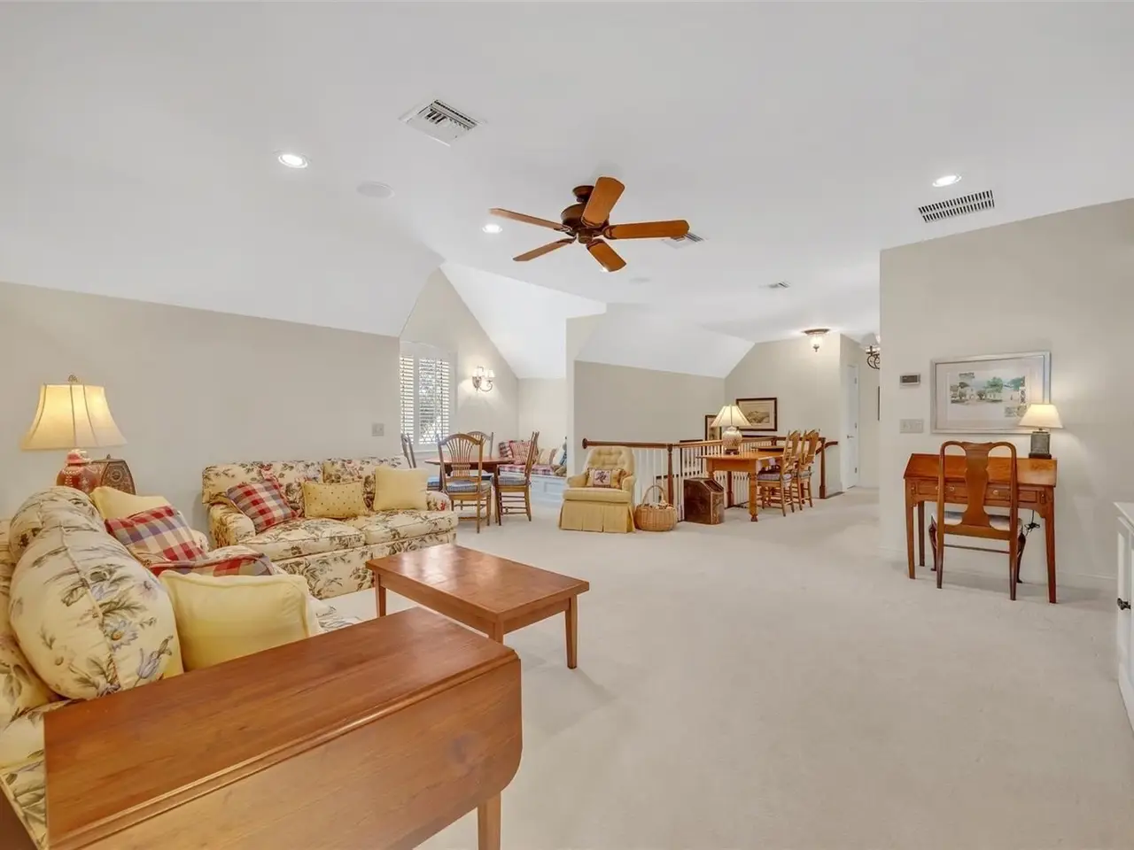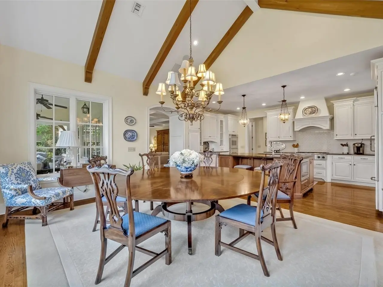Vaulted 14’ beamed ceiling