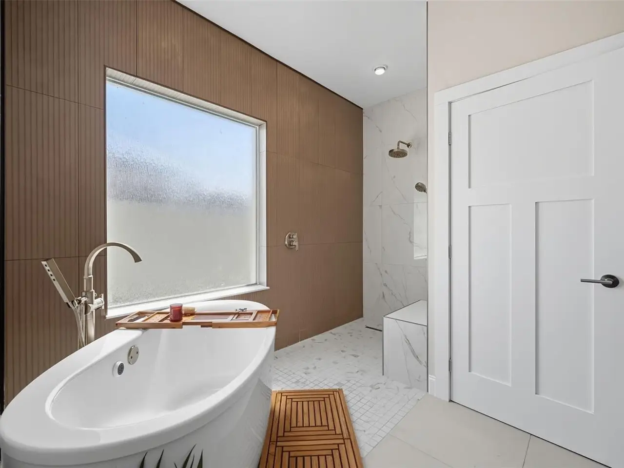Spa-inspired bathroom with Kohler Bask heated surface tub