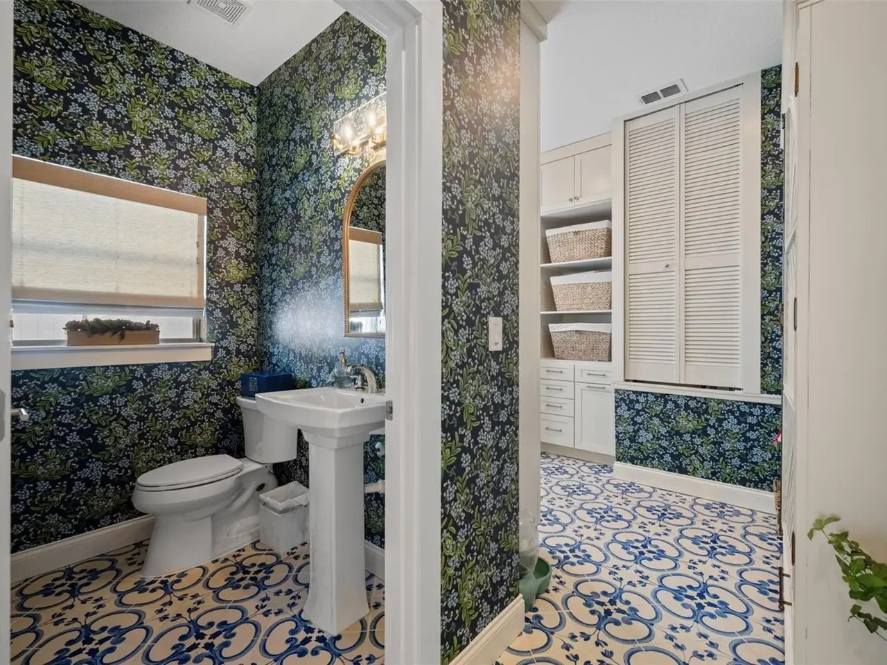 Redesigned laundry with designer wallpaper and tile