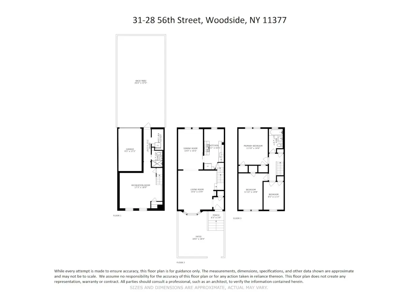 This absolutely stunning and fully renovated three bed/two bath Woodside townhouse is available for purchase! Located on a charming and peaceful residential block in Woodside, and offering outdoor space as well as indoor parking, this move-in ready home truly has it all! At 1,292 sq.ft. interior, with an additional 485 sq.ft. finished basement, you have nearly 1,800 sq.ft. of interior space to call home. There is also over 1,000 sq.ft. of exterior space between the front yard and backyard. Additionally, the home offers a 161 sq.ft. garage, giving you the rare and luxurious private indoor parking. The layout flows perfectly as you enter this meticulously-maintained home to a spacious and welcoming living room and beautiful bay window. The formal dining room sits next to the renovated kitchen, with stainless steel appliances and a coveted window in the kitchen. Owner upgraded the kitchen cabinets, installed a beautiful farmhouse sink, and replaced the countertops and backsplash with quartz. Upstairs, all three bedrooms are bright and well-kept, and the owner installed a runner on the stairs. The primary bedroom is big enough for a king-sized bed, and it includes an upgraded and modernized ceiling fan. The owner also did a full renovation to the upstairs bathroom, including marble countertops, new tiling and tub, modern fixtures and lighting, and even a smart toilet with bidet. The open finished basement includes a Murphy bed; an LG washer/dryer; and a full bathroom, also with upgraded fixtures and lighting. The amount of space, storage and light in this house is a dream come true. This gem won't last. Schedule a showing today! Details: Lot: 19ft. x 95 ft.; Building: 19 ft. x 34 ft.; Zoning: R5; Floor Area Ratio: Facility FAR 2, Residential FAR 1.25 (FAR as built .72), Residential sq.ft. (not including the basement): 1,292 sq.ft. Usable floor area as built: 1,300 sq.ft.; Unused FAR: 957 sq.ft. Garage: 161 sq.ft. Annual Real Estate Taxes: $8,319.24.