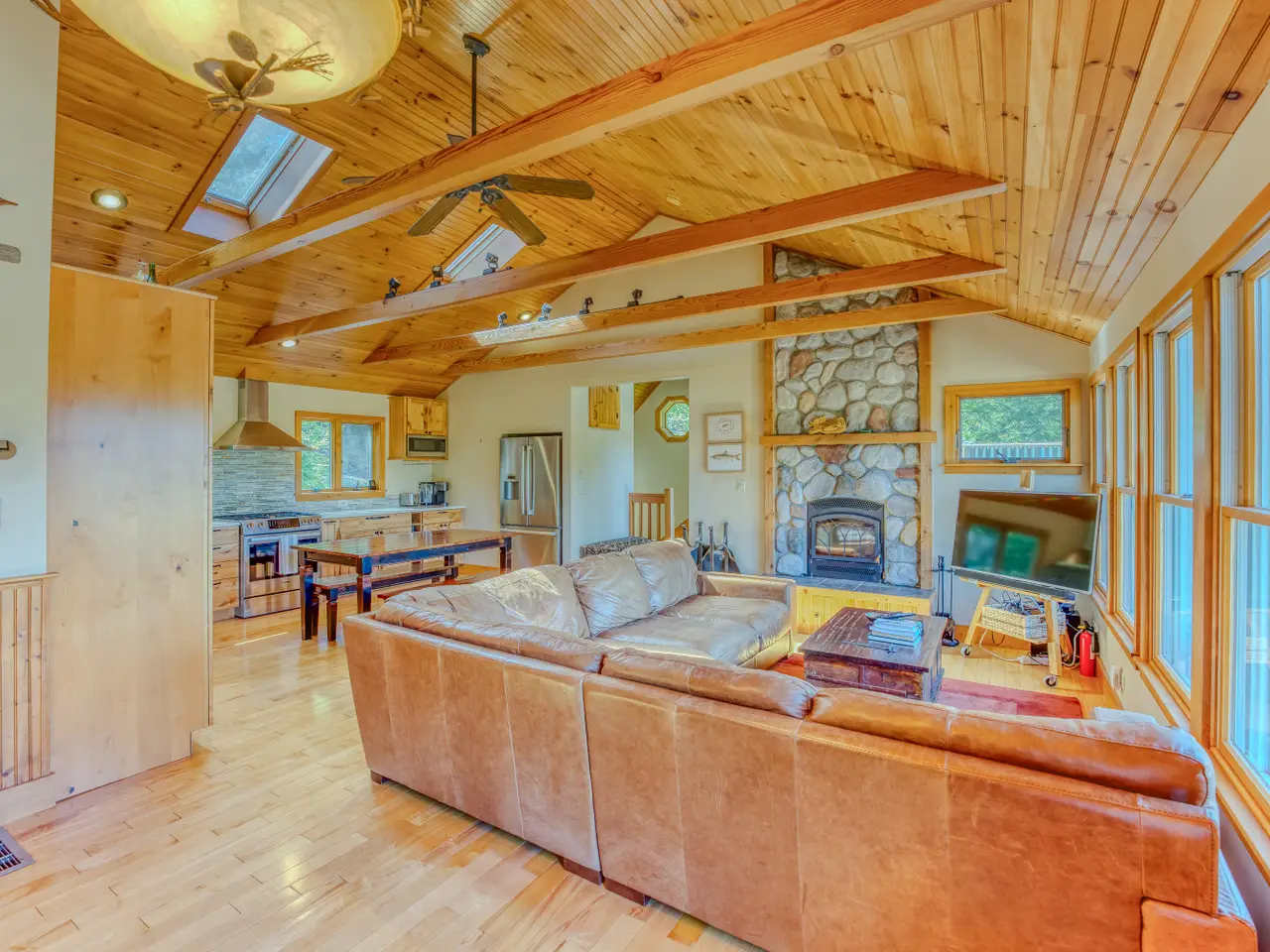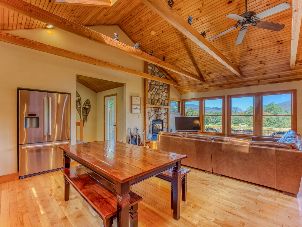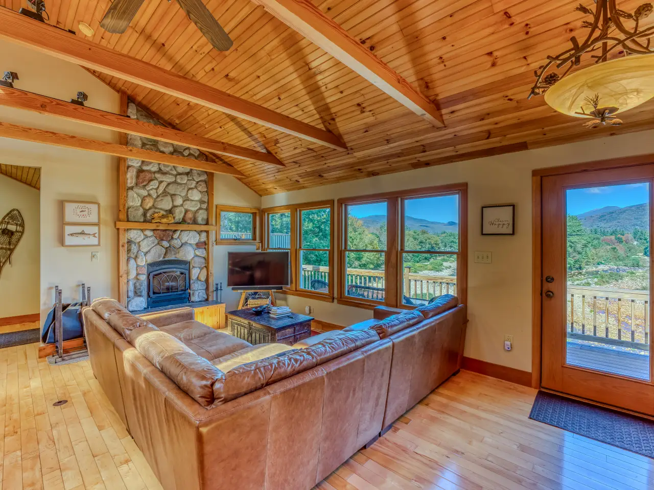 Rare Riverfront Retreat with Unmatched Views in the Heart of the White Mountains. A luxurious riverfront escape offering the best of both worlds: approximately 400 feet of prime, accessible frontage on the Pemigewasset River and stunning views down the mouth of Franconia Notch. Perched atop a scenic granite ledge on just under an acre, this remarkable property provides the perfect blend of nature, privacy, and convenience. Located less than a mile from Main Street in Lincoln, just three miles to Loon Mountain, and 10 miles to Cannon Mountain, you’re right in the heart of all the White Mountain region has to offer. Inside, the home features a bright and open layout, with a variety of rich hardwood floors and elegant tile throughout. The upper level boasts a spacious open-concept kitchen and living area, centered around a beautiful fireplace and flowing seamlessly out to a large deck—perfect for entertaining or soaking in the view. The primary suite occupies the top level, complete with a large walk-in closet and private access to the upper deck. Multiple stairways lead from the home to the yard, riverbank, and a cozy fire pit area. This home is being sold fully furnished, with an established rental history and professional property management in place for a seamless investment opportunity or private retreat. Private showings only—please do not enter the property without a scheduled appointment. Currently used as a four-bedroom home (with a three bedroom septic system).