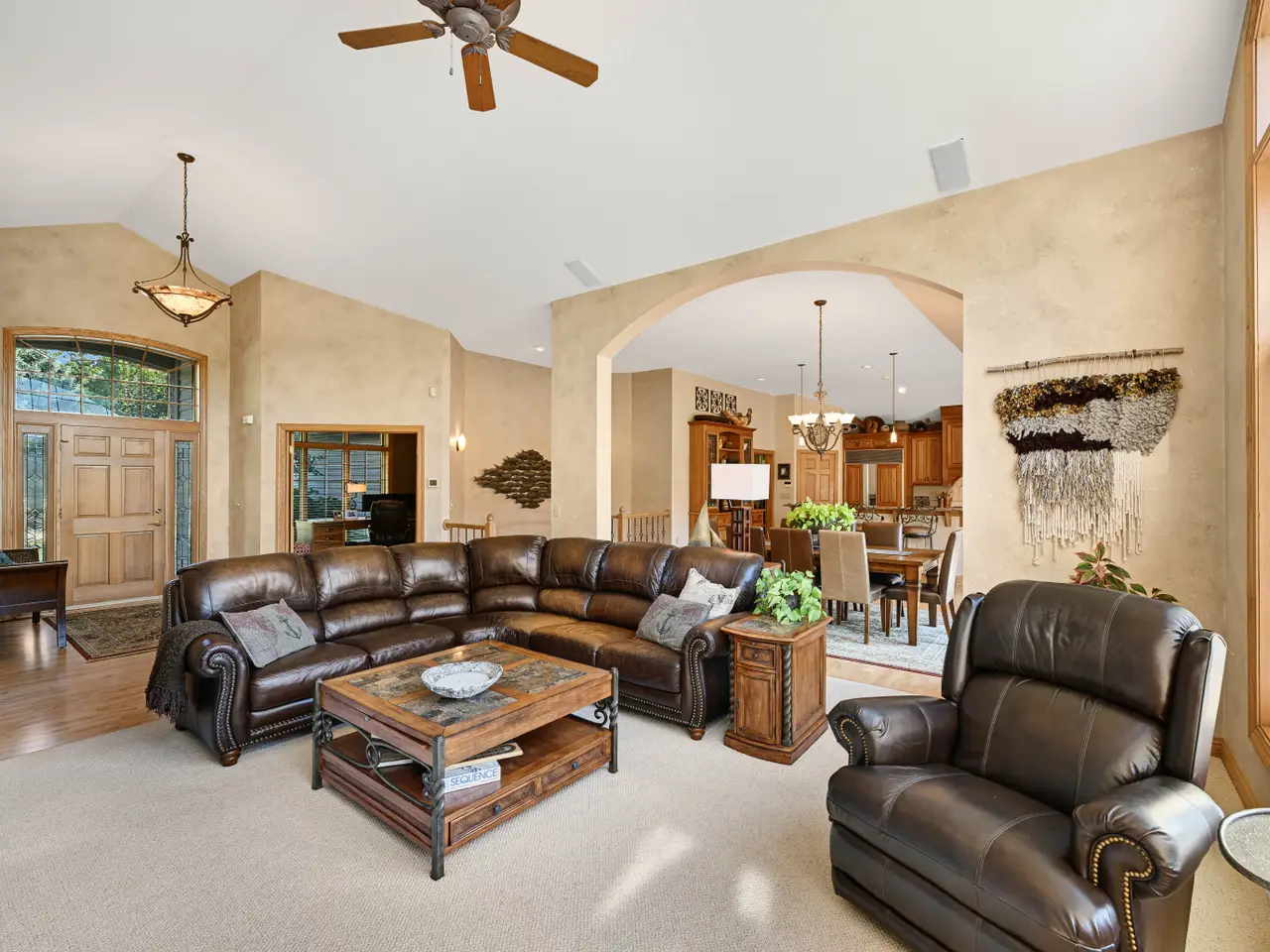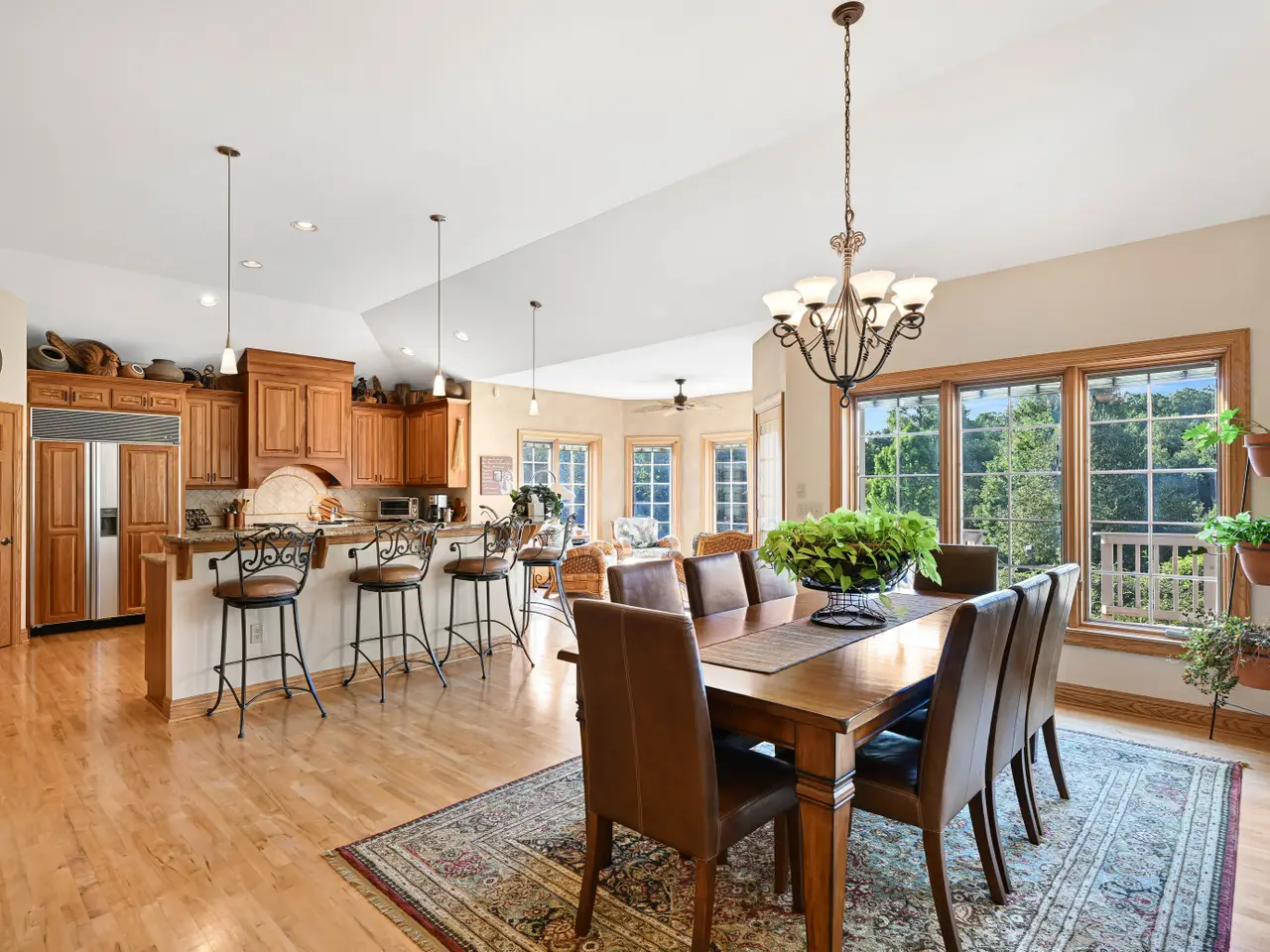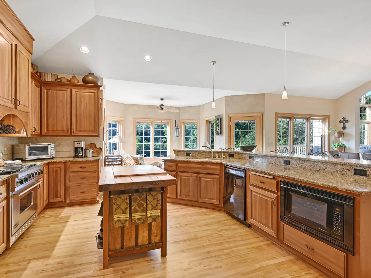 Secluded Executive Walk-Out Ranch. Tucked away on a quiet cul-de-sac, this stunning 3-bedroom, 3.5-bath executive walk-out ranch offers luxurious living space on a serene, park-like 1.9-acre wooded and fenced lot. Designed with quality in mind, this home combines privacy, elegance, and functionality. The open-concept great room features a wall of windows that flood the space with natural light and seamlessly connects to the formal dining area, sunroom, and chef's kitchen. The gourmet kitchen is a dream, complete with a large breakfast bar, cherry wood cabinetry, granite countertops, a professional-grade Viking stove, and a Sub-Zero refrigerator - perfect for entertaining or everyday living. 3.5-car heated garage includes a built-in dog wash and direct stair access to the lower level. The fully finished walk-out lower level is ideal for multigenerational living or in-law accommodations, featuring a bedroom, full tiled bath, large family room, and rec room - all finished with the same high-quality craftsmanship as the main level.