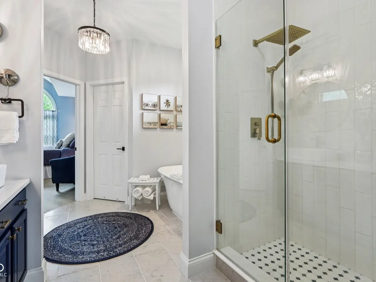 - Custom tile and freestanding soaking tub in remodeled primary bath