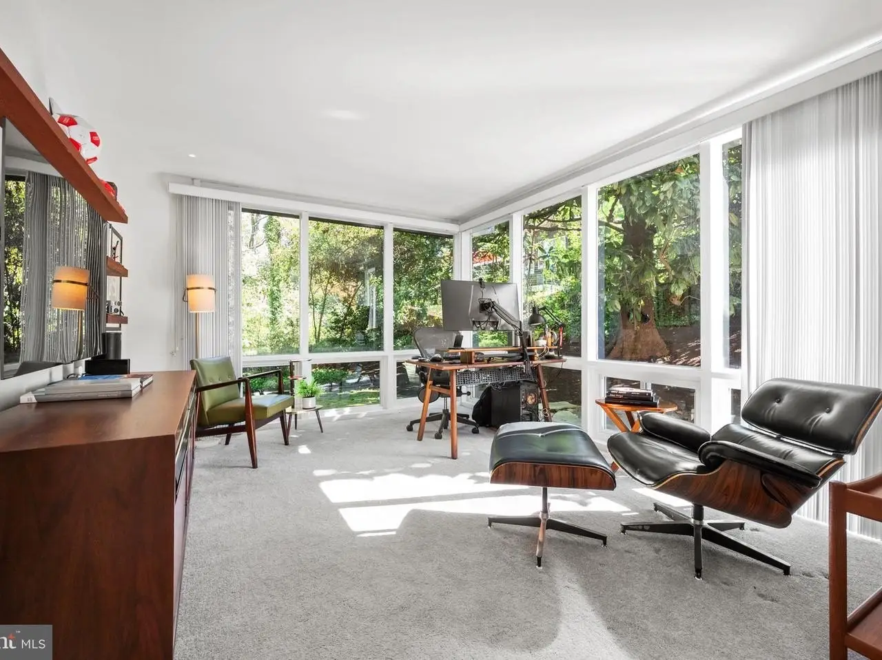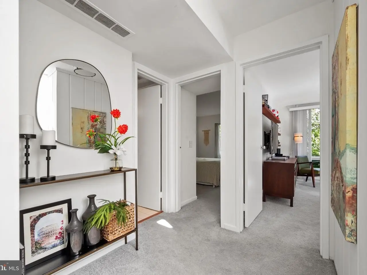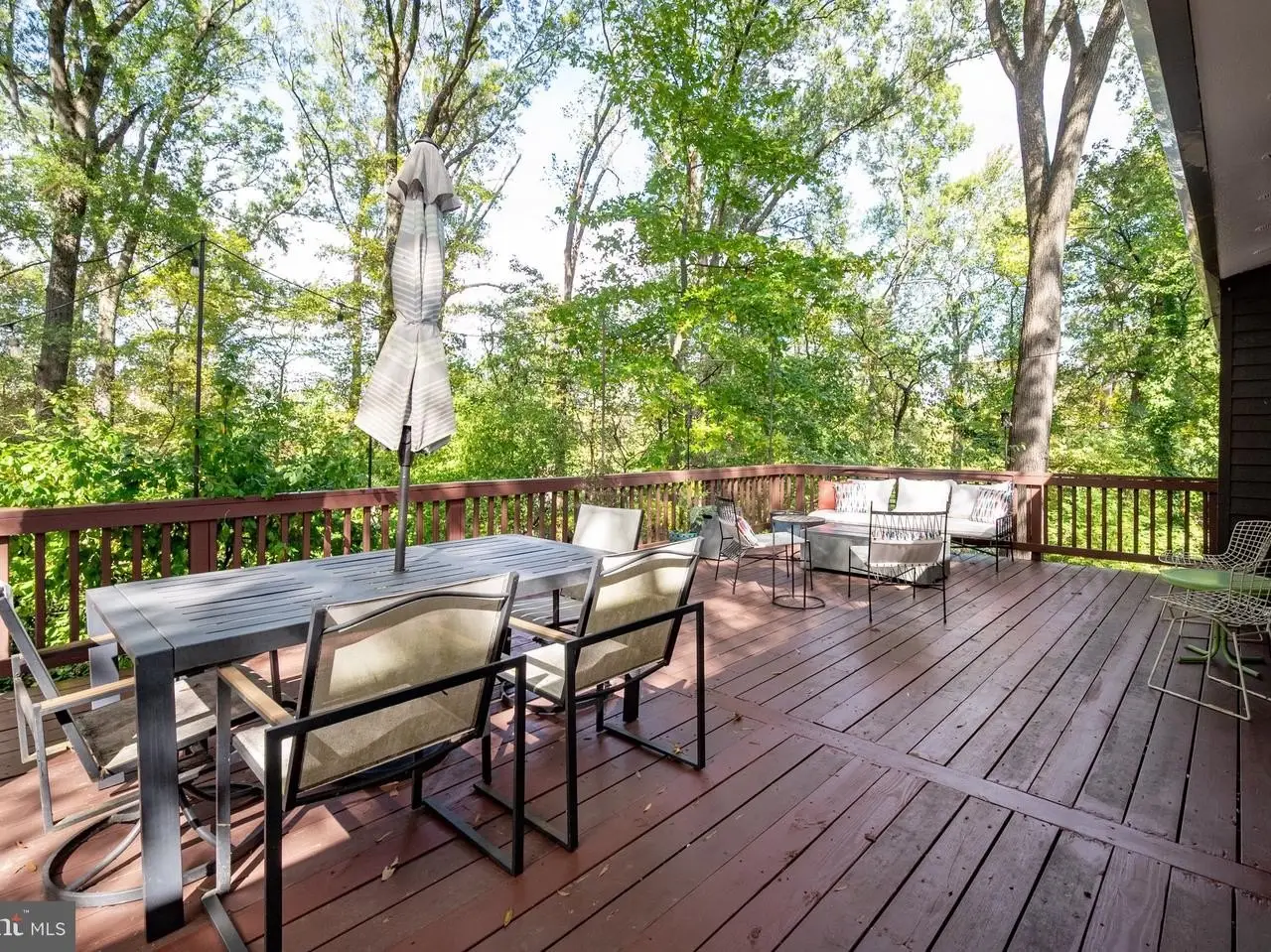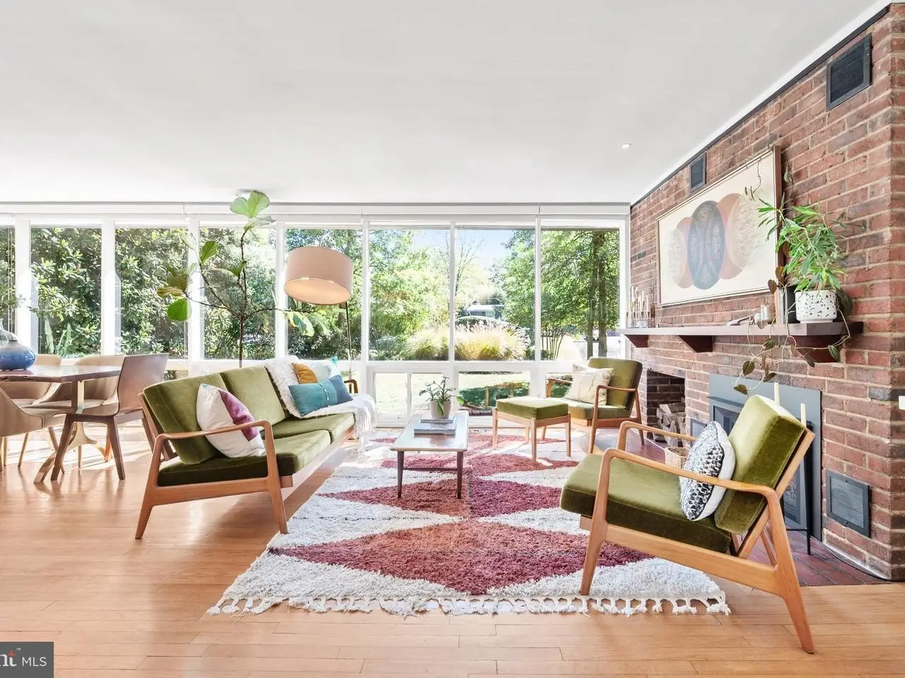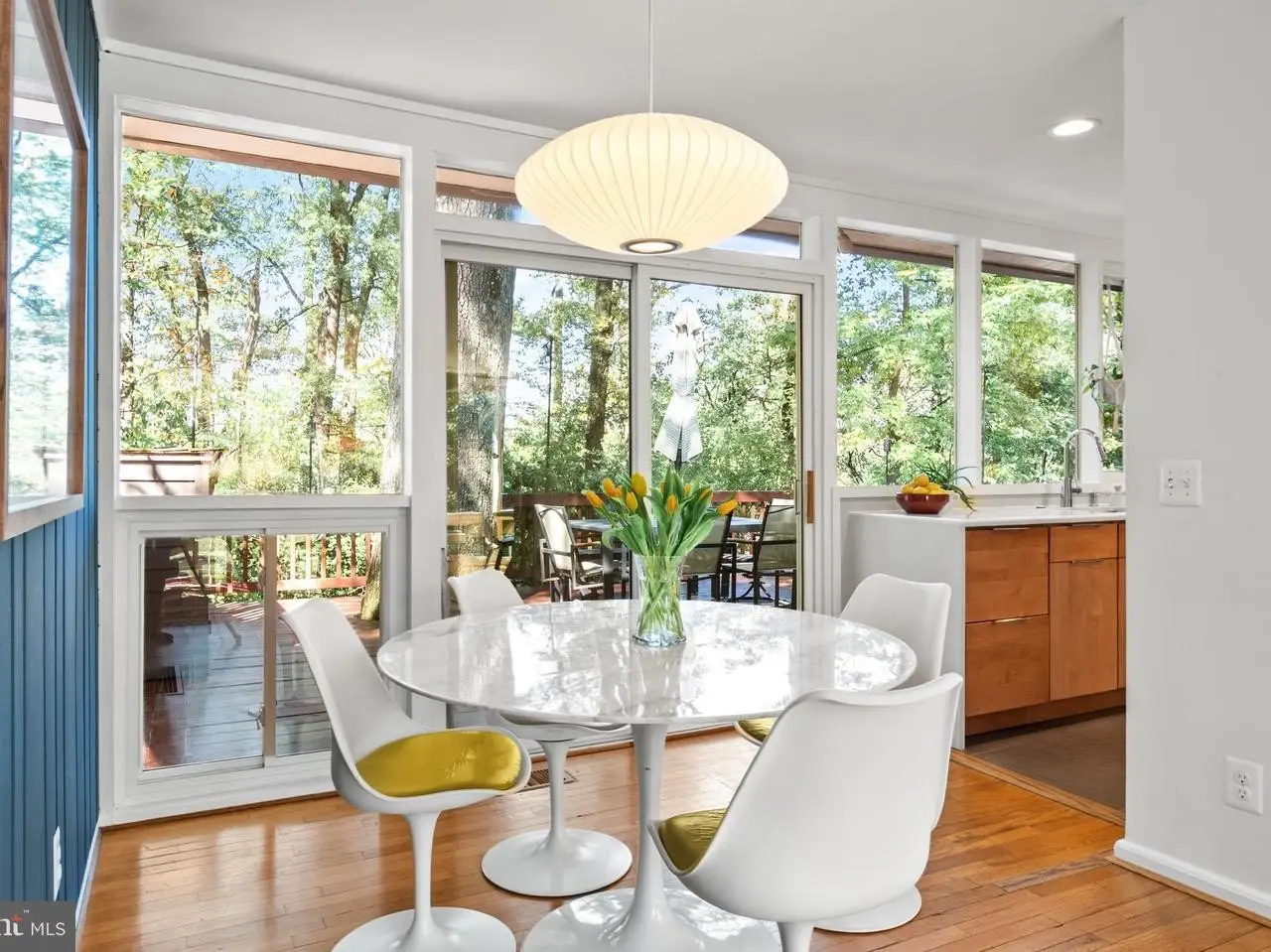 Nestled in the highly sought-after Hollin Hills Mid-Century Modern community, this stunning home on Marthas Road sits on a private, .42-acre lot that backs to serene, wooded views. Designed by renowned architect Charles Goodman, this two-story residence is flooded with natural light through its iconic floor-to-ceiling windows. The open floor plan highlights a gas fireplace set into an exposed brick wall, beautifully refinished original white oak flooring, and expansive living areas perfect for both relaxing and entertaining. A separate dining room features a sliding glass door that opens to an impressive 450-square-foot deck built around a mature tree, offering ample space for dining and lounging while overlooking the tranquil landscape. The kitchen was fully remodeled in 2019 and boasts custom maple cabinetry, stainless steel appliances, waterfall quartz countertops, and a vintage-inspired glass tile backsplash. The main level includes two spacious bedrooms, including a primary with a closet bump-out, and an expanded full bathroom that exceeds the original footprint. An open staircase leads to the lower level, where a large family room with a second fireplace and walls of windows connects to a slate patio area framed by raised planting beds and a privacy-enhancing brick wall. Additional features include a generous laundry room with yard access, a large utility room with built-in shelving, and abundant storage throughout. The professionally landscaped lot is enhanced by mature plantings, towering trees, in-ground sprinkler system as well as a home electric car charging station. Hollin Hills offers membership to 2 community pools as well as membership to a tennis and pickleball club. The scenic neighborhood boasts 7 parks, trails, an active Civic Association with seasonal celebrations, delicious super society and a friendly, close-knit environment. A commuter's dream location minutes from GW Parkway and trails, DC & the Pentagon; and south to Fort Belvoir, or north to Andrews AFB & Tysons Corner via I-495. This exceptional Mid-Century Modern home has been thoughtfully updated without losing the vintage feel throughout.