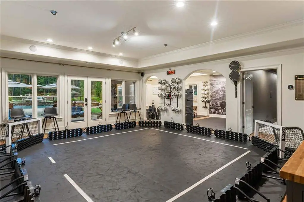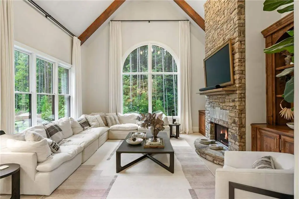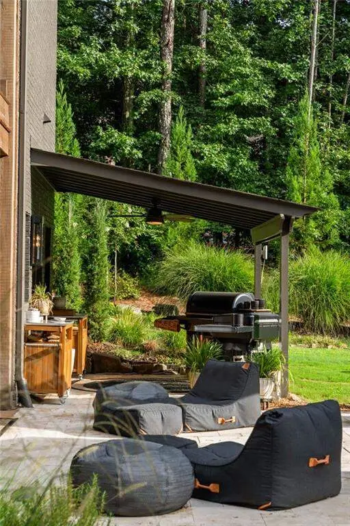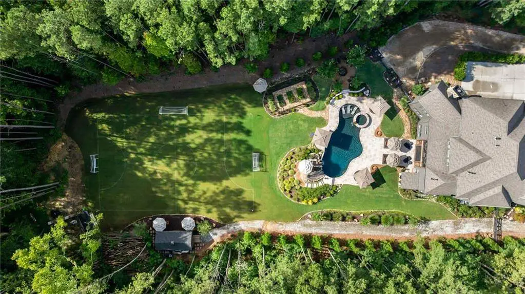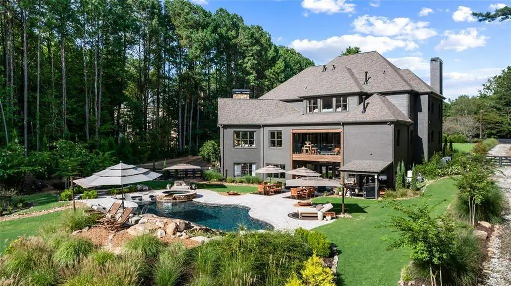 Tucked within a gated enclave and offering the rare blend of a sought-after Alpharetta address and low Cherokee County taxes, this stunning modern cottage-style estate is a true lifestyle property. Set on a beautifully landscaped lot, the exterior stuns new rock pathways, and a full yard transformation including a leveled, aerated backyard perfect for soccer play. Outdoor living is redefined with a heated saltwater pool featuring a blue light system, waterslide, and 10-person spa, paired with a round steel firepit, 18-speaker sound system with in-ground subwoofers, raised garden beds, firepits, and expansive patios for entertaining. Inside, the light-filled home features refinished Ashwood floors, fresh cedar accents, and over $100,000 in Restoration Hardware lighting. A Control4 smart home system integrates sound, lighting, hardwired cameras, and more. The open chef's kitchen is equipped with Sub-Zero, Wolf, and Miele appliances, plus double ovens and a walk-in pantry. Custom window treatments and built-in garage storage remain. The home boasts 7 total bedrooms, including a serene main-level primary suite with a gas fireplace. Upstairs offers four large bedrooms and the terrace level features two additional suites (one with separate entrance and kitchenette), a theatre, game room, and gym with sauna, all complemented by secondary laundry and ample storage. Experience elevated, turnkey living, just minutes from Milton and downtown Alpharetta.