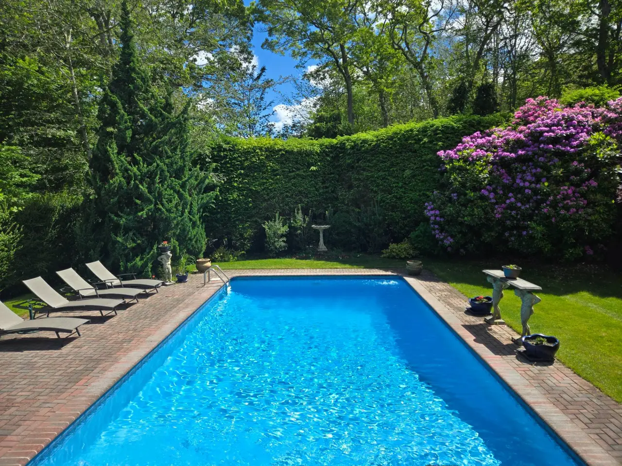 Amagansett East Hampton Rental Registration#: 24-1087. This recently renovated post-modern home is surrounded by beautiful Beech tree woodlands, specimen shrubs and flowers with rolling lawn. Located on two secluded acres at the end of a quiet cul-de-sac in the desirable Bell Estate section of Amagansett - fully gated property. This spacious home with oversized windows and skylights throughout, makes you feel like you are part of the outdoors. A grand entrance leads to the main floor that is open and spacious, with high ceilings and huge windows. The large living room has a gas fireplace and flows into the dining area and recently renovated kitchen, all flooded with light. The is a patio off the kitchen/dining room that leads down to the heated pool area. The king-size master suite is separated from the other bedrooms and has a gas fireplace, a walk-in closet and a large master bath with a soaking tub with views that go on forever! The lower level (above ground) has a second master en suite with queen bed; two additional guests bedrooms (one queen and two twin), another full bath and a fun billiard room complete this level. Outside there is a courtyard with a small meditation pond and water feature. The house is fully equipped with WIFI, central vac, central a/c, an irrigation system, and an alarm. Enjoy being biking distance or a quick drive to the most beautiful ocean beaches. Shop at the local farm stands and enjoy top rated restaurants all just minutes to this private property.