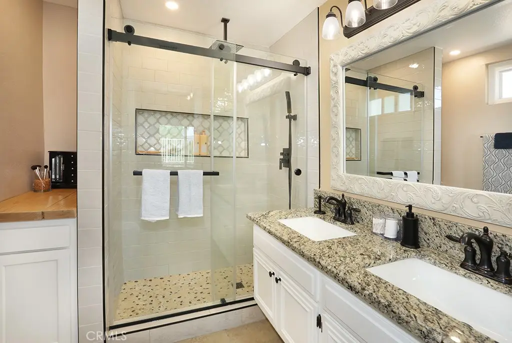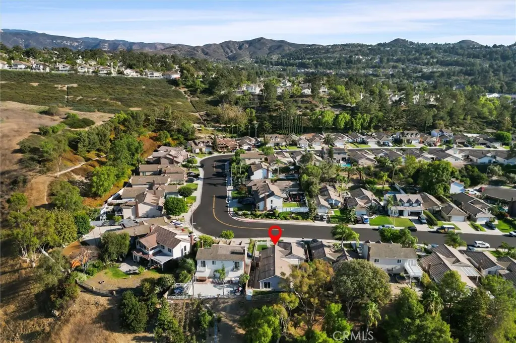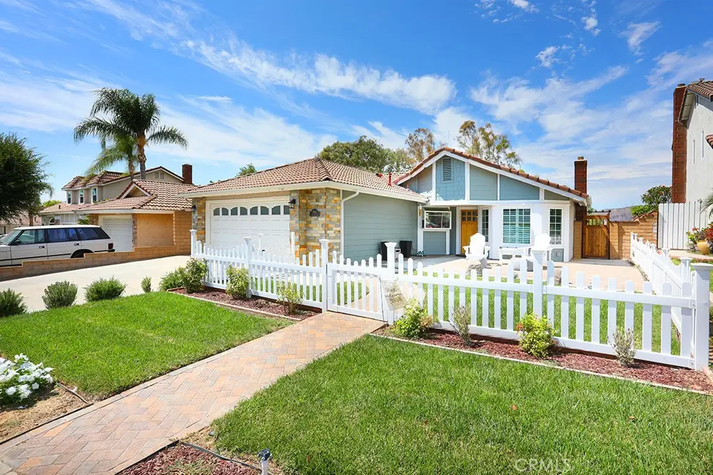 Dreaming of the perfect home with a white picket fence? Here it is! Delivering charm and sweeping city light and mountain VIEWS, this SINGLE STORY 3 bed 2 bath home tucked away in the Bel Air neighborhood of Anaheim Hills offers a a sense of tranquility and vibrant energy all at once. Delightful curb appeal welcomes you up a newly paved and enclosed front patio for extra outdoor entertaining. Inside discover a cozy family room with vaulted ceilings, rich brick fireplace with custom mantel and a picture perfect bay window trimmed in classic plantation shutters. The newly remodeled farmhouse kitchen is accented with crisp white shaker cabinetry, quartz counters, glazed subway tile backsplash, stainless steel appliances, a deep single basin sink, recessed lighting and features a light-filled window box. Head down the halls trimmed in wainscoting to the primary bedroom with vaulted ceilings and impressive views overlooking the rolling hills and direct access to the backyard. The enviable remodeled primary bath features a walk in shower with artful tile work and a custom glass enclosure and dual vanities with granite counters. Two ample sized guest bedrooms share a guest bath with single vanity and granite counter. Outdoor entertain under the covered patio outfitted with electrical lighting or perfect your golf game on the putting green while soaking in the incredible views. The garage features epoxy flooring, upgraded lighting, new cabinets, a custom entertainment center with TV and attic storage with pull down ladder. Other improvements include a newer water heater, HVAC system, gutter system, whole house fan, interior and exterior paint, low maintenance turf, exterior hardie plank concrete siding and new stone facade. This low HOA neighborhood offers convenient access to 91 and 241 freeways, shopping centers, dining, hiking trails, award-winning schools and more!