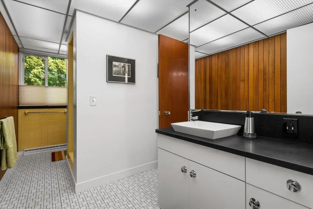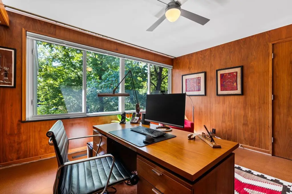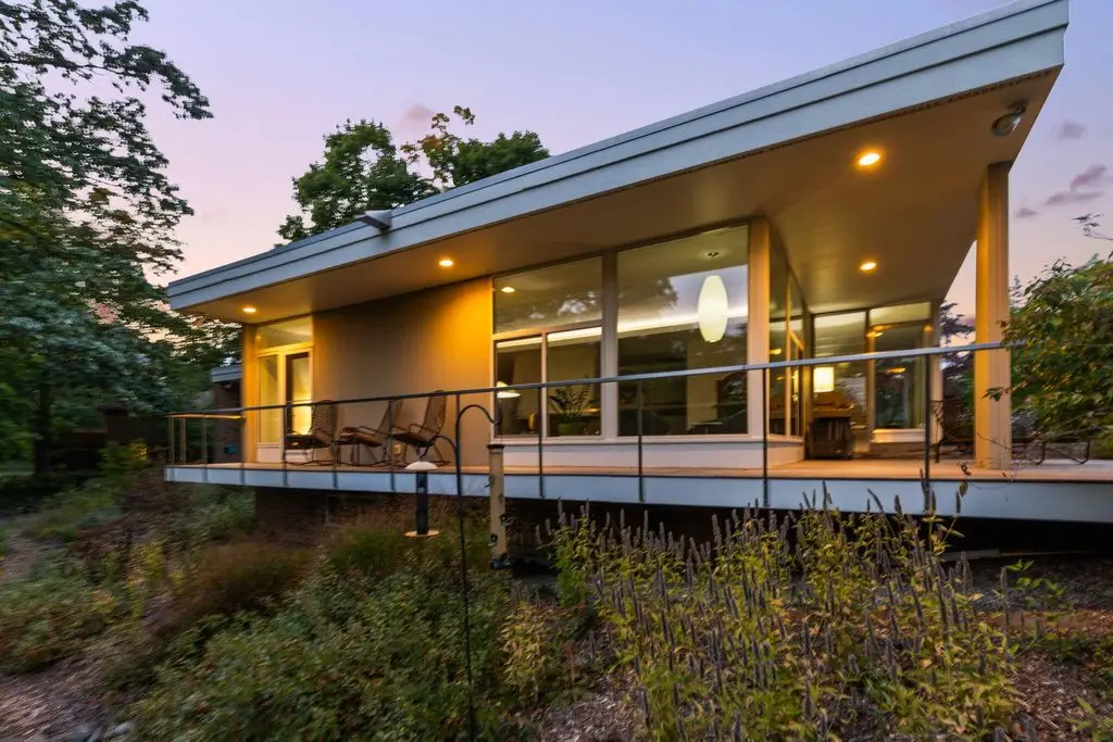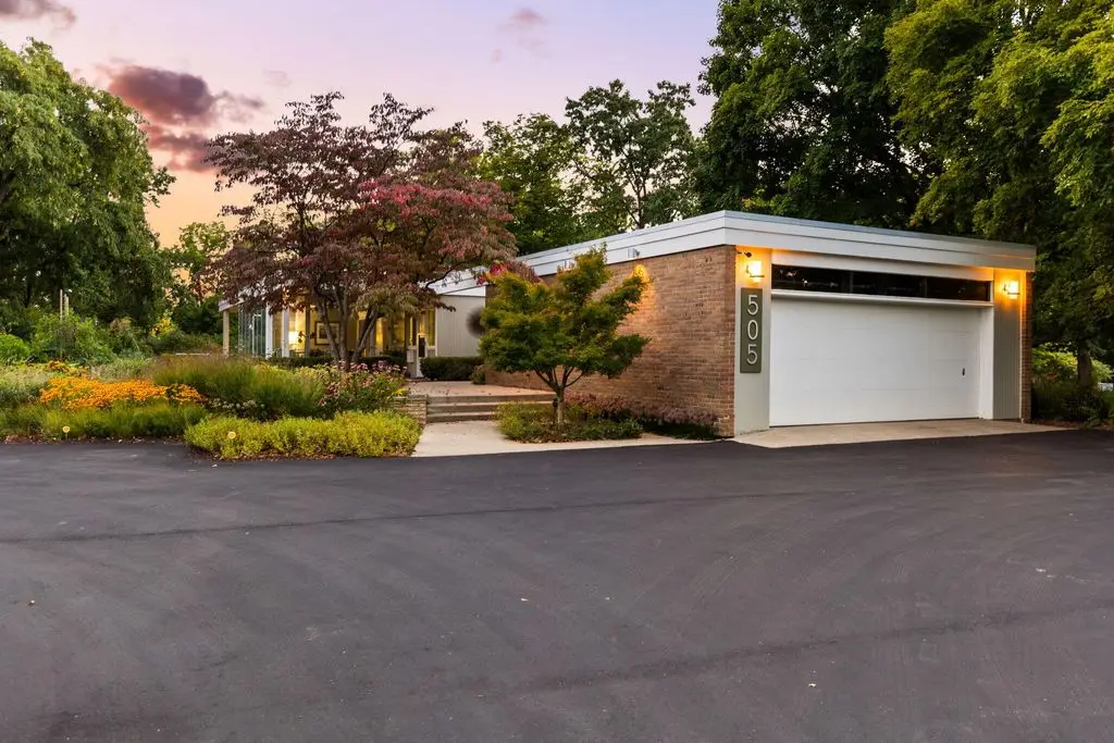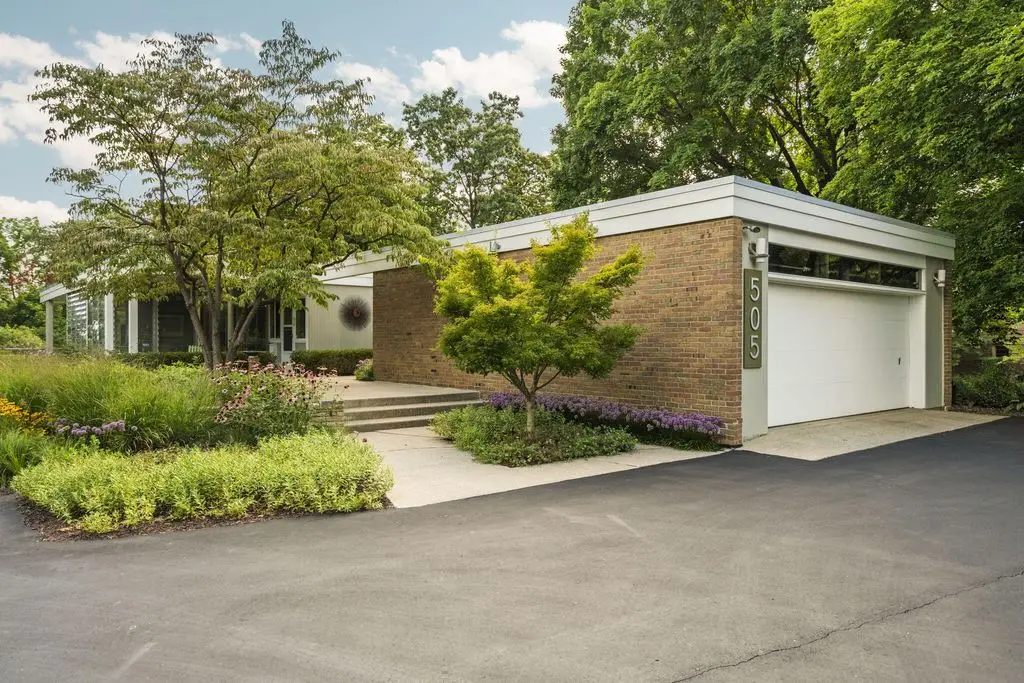 Designated by A2Modern as one of Ann Arbor's most notable Mid-Century Modern residences, this gracious home is a timeless example of the movement's enduring appeal. Its flat roof, cantilevered eaves, and private entry tucked into a breezeway embody the geometric simplicity and strong connection to nature that define the era. Expansive windows and skylights flood the interior with natural light, framing treetop and meadow views. A Florida room with jalousie windows and a full-width balcony create seamless transitions between indoors and out, while landscaped grounds enhance the home's natural hillside setting. In keeping with the owners' commitment to sustainability, the property features a small orchard of fruit trees, raised vegetable gardens and a pollinator garden. The exceptional property was featured in the Ann Arbor Garden Tour. Inside, organic materials including slate tile, cork flooring, and walnut paneling are paired with a dramatic stone wall that divides the living and dining rooms, featuring a built-in planter and cantilevered hearth. Cove lighting accents the tall ceilings, while horizontal flow brings warmth and intimacy to the open floor plan. The eat-in kitchen blends stainless steel finishes and high-end appliances with carefully preserved original cabinetry. On the main level, three bedrooms and two baths include a primary suite with treetop views and a renovated bath featuring a level-entry shower, while the third bedroom has been converted into a paneled study. The lower level offers a cozy sitting area, laundry and exercise space, and well-organized storage. One-level living is easily possible by relocating the laundry to the spacious primary closet.Thoughtful renovations have elevated this residence into a net-zero, all-electric retreat powered by a 15kW solar arraya rare union of architectural heritage and sustainable living. At once a faithful restoration and a forward-looking sanctuary, 505 Burson Place offers the elegance of mid-century design harmoniously reimagined for today's eco-conscious lifestyle.Tucked away on a private cul-de-sac in Ann Arbor Hills, this home provides unparalleled access to the best of Ann Arbor: stroll through Nichols Arboretum, picnic at Gallup Park, bike or jog to the U-M main campus, medical center, or new U-M fitness center. Designed by James Livingston in 1956, it remains one of the city's most admired Mid-Century Modern retreats.