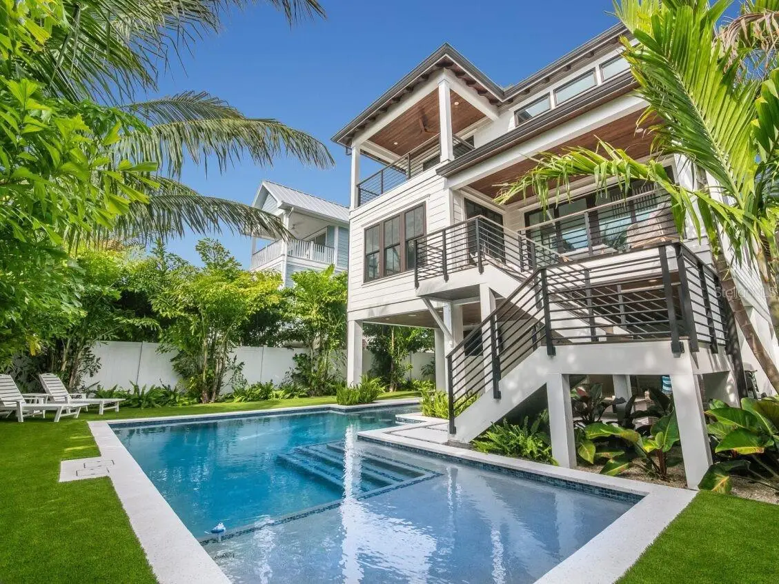 Welcome to Luxe Island Escape, an exceptional 4-bedroom, 4.5-bath coastal retreat nestled in the tranquil heart of Anna Maria Island. This captivating residence is offered fully turnkey furnished - ready for you and your family to immediately embrace the island lifestyle. Designed with thoughtful design and coastal sophistication, the home is surrounded by lush tropical landscaping and features a private heated pool, spa, and an expansive rooftop deck offering sweeping views of both the Gulf of Mexico and Tampa Bay. Inside, a bright, open-concept floor plan awaits, enhanced by soaring ceilings and custom contemporary finishes throughout. The main living level showcases a designer kitchen outfitted with sleek stainless-steel appliances, a striking island, and abundant space for entertaining. The dining area and great room flow seamlessly onto a covered deck, welcoming in the sea breeze and natural light. Also on the main floor are two tranquil guest suites with private baths, offering comfort and privacy for visiting family and friends. Upstairs, the serene primary suite opens to a private deck - an ideal retreat for peaceful mornings and quiet evenings and an extra surprise space for an office or sitting area. M sure you ascend to the rooftop deck for panoramic island views and breathtaking sunsets. Ideally located just a 2-minute walk from the sparkling waters of Tampa Bay and only 5 minutes from the pristine shores of Anna Maria Island's iconic Bean Point, this home offers the ultimate blend of tranquility, beauty, and fun. Currently operating as a busy vacation rental property, Luxe Island Escape presents a rare opportunity for full-time living or a luxurious coastal escape vacation rental. Don't miss your chance - book your private showing today.
