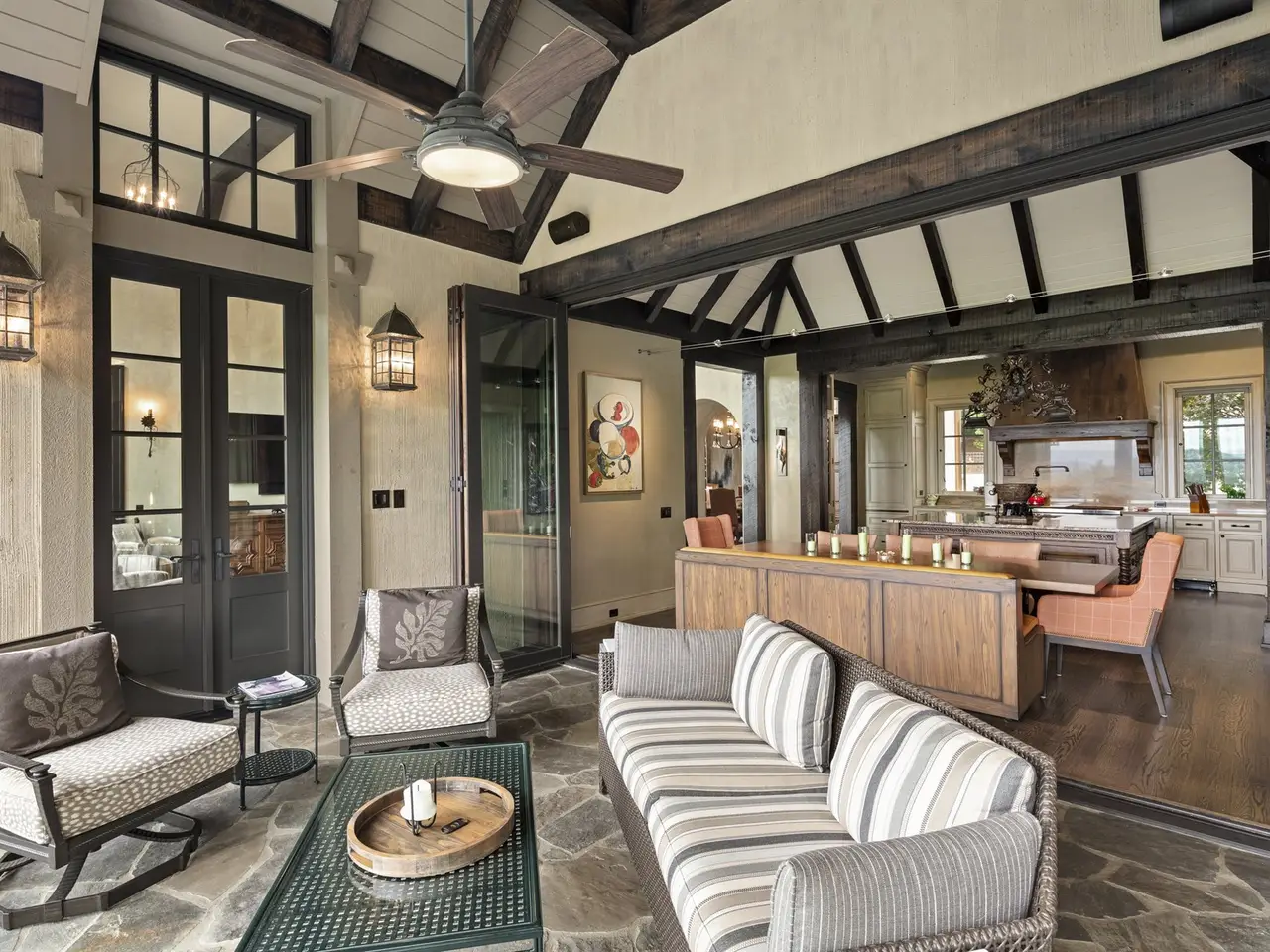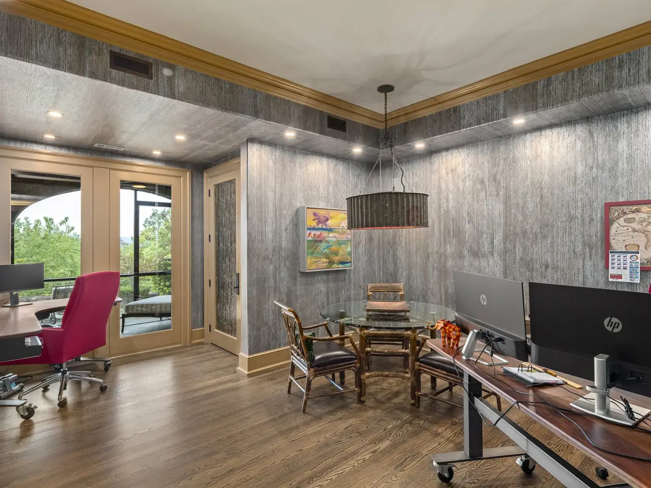 A gentle driveway and expansive brick paver private courtyard welcome you to this luxury mountain enclave. Revel in outstanding long-range mountain views throughout the house with every convenience plus some creative surprises. A fabulous French Country-style kitchen offers Oak and copper accents along with a separate pantry and breakfast room with a retractable wall opening to the outdoor dining porch. The main level primary suite has a beamed ceiling and opens to a screened porch, an elegant primary closet that flows easily into the spa-inspired bath with a steam shower, whirlpool tub, and radiant heat floors. Special highlights include two-story beamed ceilings, clerestory windows, home elevator, hidden bookcase doorways on the terrace level, gorgeous oak wet bar, and private guest quarters. Enticing outdoor living spaces include a fenced level yard, four private screened porches, and an expansive flagstone terrace framed by a stone retaining wall and a built-in gas firepit.