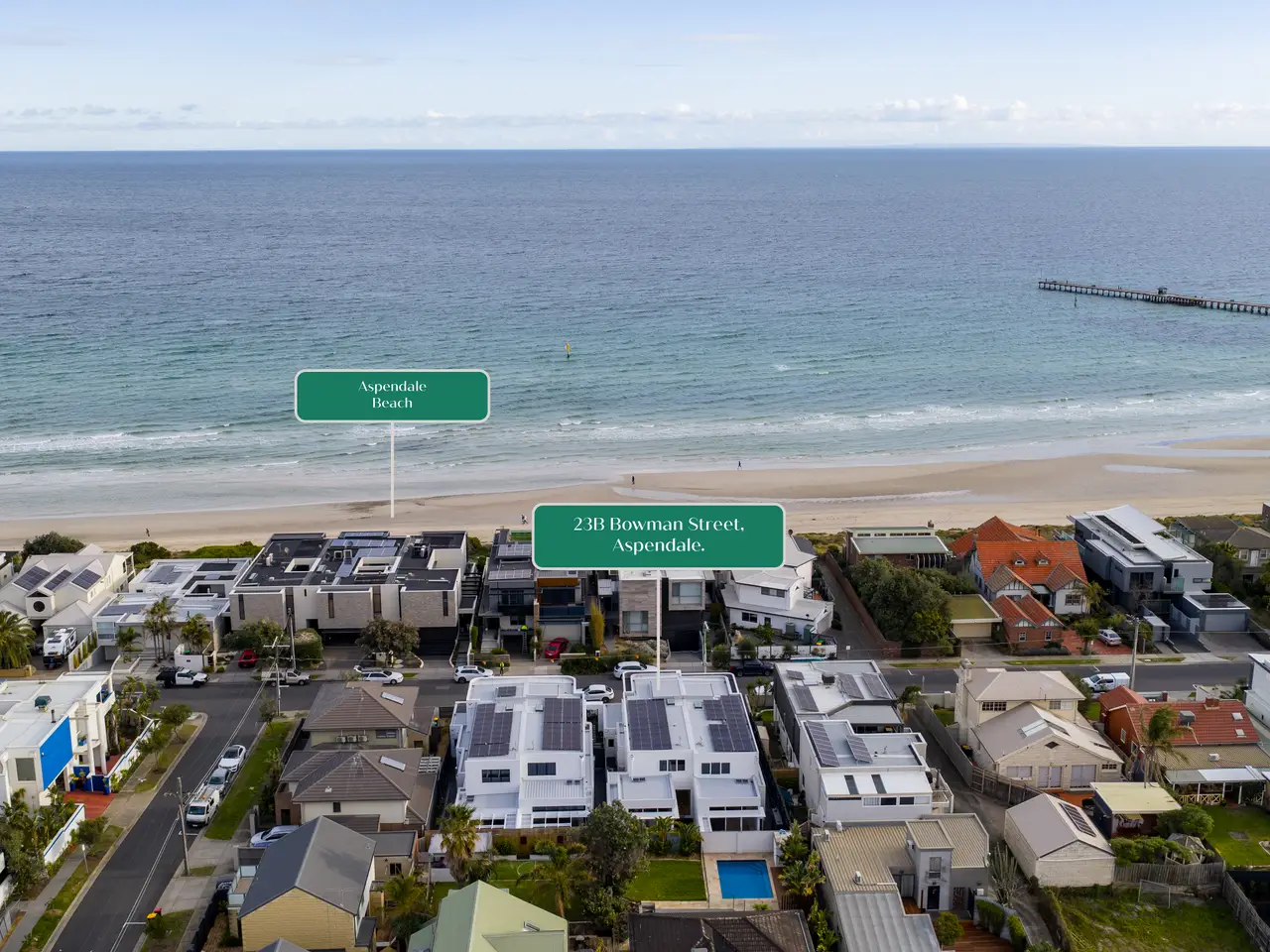 Tucked within Aspendale's most exclusive beachside enclave, this three-bedroom, three-bathroom, dual living zone residence by Lowe Design & Build sets a new benchmark in sustainability and timeless coastal luxury. Just steps from pristine stretches of sand and crystal-clear waters, this contemporary home offers an unrivalled lifestyle with fine dining, cafes and shopping all within strolling distance. Beyond its striking façade, a carefully crafted interior awaits with bedrooms, bathrooms and living zones on each level - all accessible via a lift. Stunning open-plan living and dining impress with elevated ceilings and clerestory windows, designed to take full advantage of the beautiful northern sunshine and accentuated by seamless connection to an entertaining oasis surrounded by landscaped gardens. An alfresco kitchen with a built-in Weber barbecue is the perfect addition for hosting. At the heart lies a showstopping kitchen, boasting a butler's pantry and suite of Bosch appliances, including an induction cooktop and integrated dishwasher, sleek porcelain benchtops and streamlined cabinetry. Providing flexibility is a ground-level ensuite guest bedroom and an upper-level master bedroom with a dressing room and underfloor heating in the luxurious ensuite, while the third bedroom sits adjacent to a lavish main bathroom. The upstairs retreat enjoys glistening water glimpses, equipped with a discreet kitchenette for relaxed entertaining on the balcony, the perfect spot to capture the sea breeze, sunsets and fireworks. Achieving an impressive 70% Build Environment Sustainability Scorecard (BESS), this 7-star energy-rated sanctuary is prestige appointed with an 8kW solar system with 5kW battery, double glazing, zoned heating and cooling, Hikvision keyless entry and video intercom, plus a double garage with EV charger. Positioned to enjoy a relaxed turnkey lifestyle in this highly desirable pocket, stroll to Mordialloc Creek, Peter Scullion Reserve, the iconic pier, popular eateries, shopping, the train and local schools.