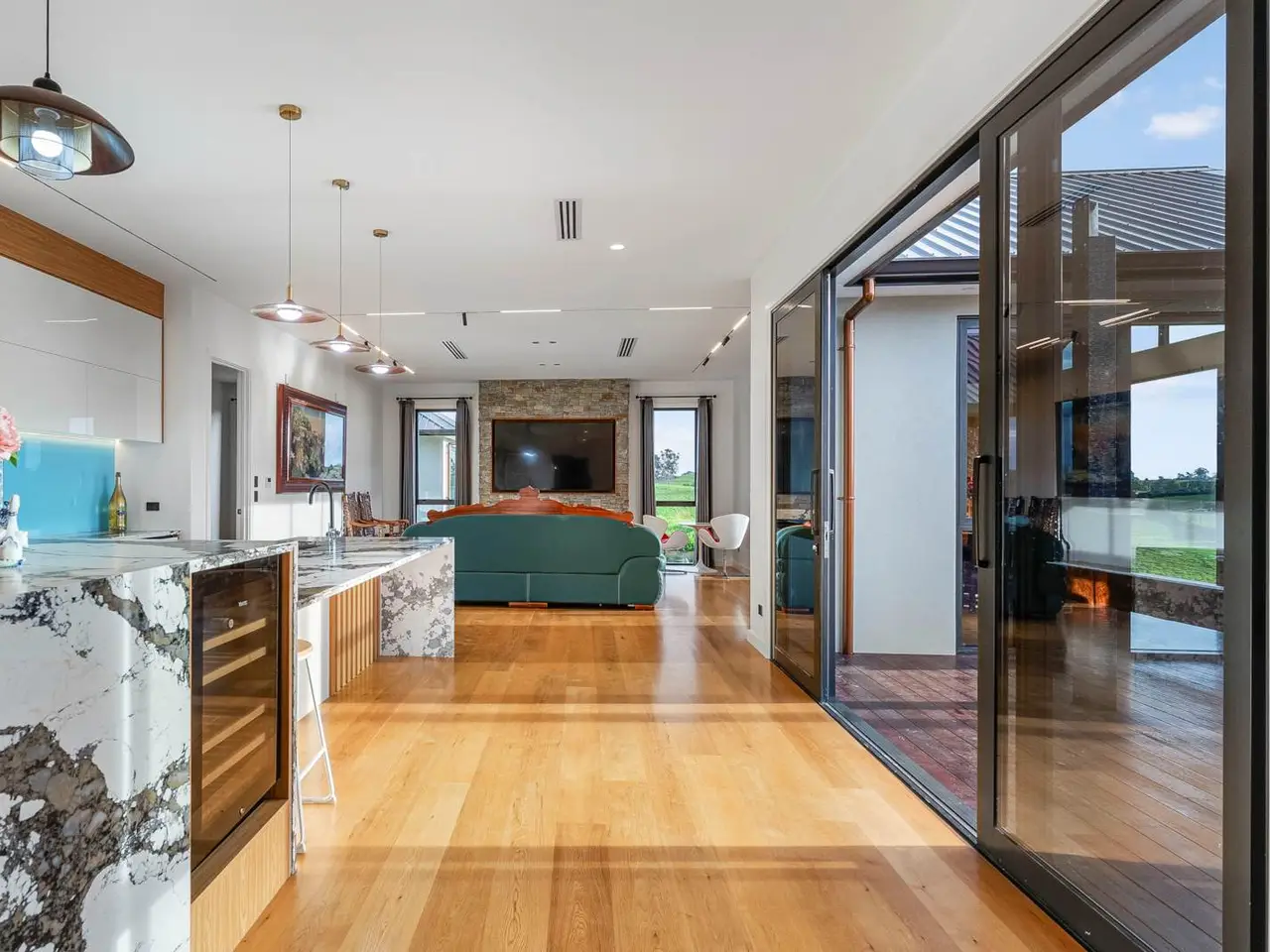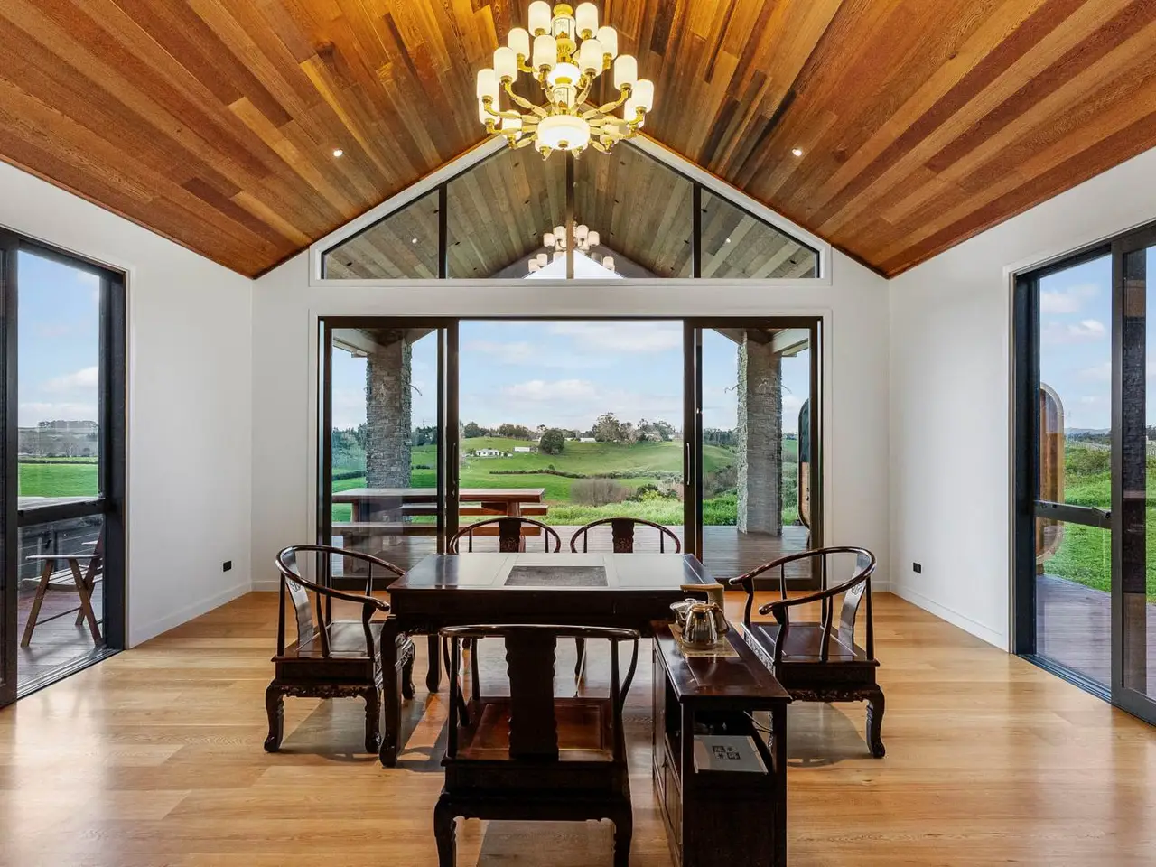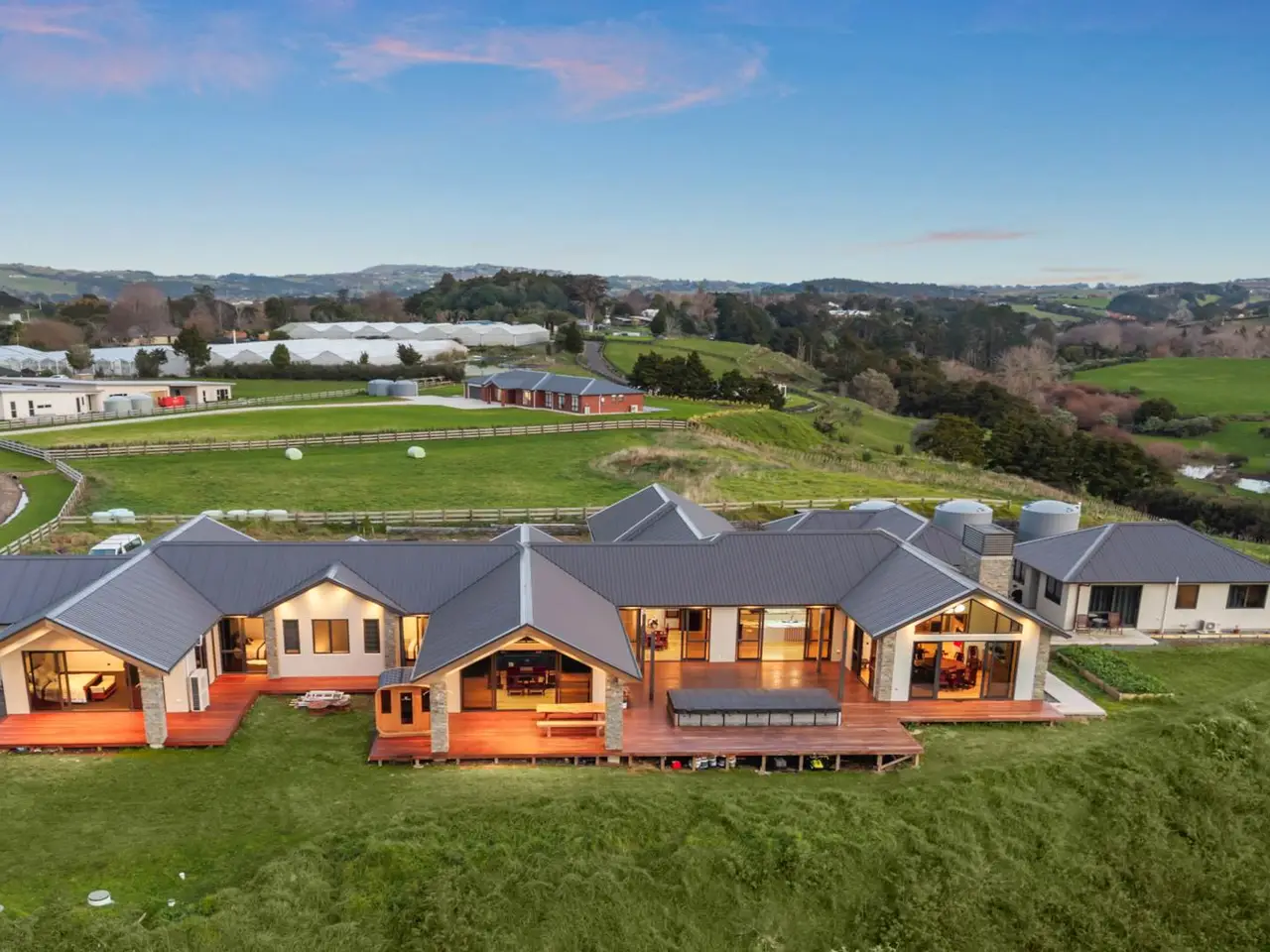 NORTHERLY DECKS - SCENIC CITY LIGHTS Completed in December 2024 (CCC issued April 2025), this elevated north facing home, built of EZ panel cladding (concrete panels) with colour steel roof and feature stone exterior accents, this superb 570 square metre home plus 64 square metre minor dwelling (635 m2 total approx) set on 3.13 hectares (7.83 acres) zoned Country Side Living boasts sweeping views over rolling countryside to the distant night lights of the city. Excellent design by LW Architecture Ltd is complemented by quality construction by Kea Building Ltd. Brand sparkling new, landscaping is yet to be done which will of course, reflect the new owners botanical preferences. Double door entry leads into a spacious foyer with a high pitched Cedar ceiling and stunning hand painted feature wall. Engineered Oak flooring, 3 metre ceilings and 2.4m high doors, cameras and alarms, wiring for wi-fi connectivity, fibre optic internet and ducted air conditioning throughout are just a few of the comfort inclusions in this ultra-spacious sophisticated residence. The foyer leads to expansive, light-filled open plan living anchored by a high-end kitchen featuring premium Miele appliances, including both steam and conventional ovens, as well as a warming drawer. It also boasts an AEG induction hob, Bosch dishwasher, granite waterfall edge island bench, and a Vintec wine fridge. The butler’s pantry is equally impressive with microwave oven, gas hob and blue glass splash-back. Abundant window walls open to covered and open Kwila decks which stretch across the full side of this home (totaling 55 square metres approx) providing scenic venues for stylish entertaining and lazy day leisure in the Alpine swim spa and the sauna. The kitchen spills into a sumptuous family room with feature stone-surround gas fireplace and adjoining formal dining. Off the casual dining double doors open into a luxurious media room with galaxy ceiling and feature lighting, built in speaker system, projector, built in bar and all media equipment – also the perfect karaoke venue. Adjoining this space is another living area with a high pitched Cedar ceiling that opens out to covered alfresco recreation. Also on this side of the home is a multi-use living room and two bedrooms with built-in wardrobes, one opens to the outdoors. You'll also find an office and a bathroom on this side. Additionally, there is a separate powder room and a well-equipped laundry. Hallway’s end gives access to a three car garage with marine carpet and extra-large insulated doors. Off the opposing side of the foyer, two bedrooms with walk-in robes and sliding doors flow out to the northern deck. These are separated by a bathroom with dual vanities. Off a small hall, the magnificent super-spacious master bedroom which opens out to a covered deck features two walk in robes, built in storage, make up station and an ensuite with double Englefield spa bath, electric mirror, double vanity and smart toilet. Yet another bedroom here, also with walk-in robe and ensuite, has an adjoining study area, making a total of six superbly appointed bedrooms in this expansive home of supreme comfort. Separate self-contained living, perfect for extended family or guests, is spacious and classy comprising open plan living, dining and kitchen, a powder room, bathroom with two vanities and two bedrooms with built-in wardrobes. Incredibly spacious, exceptionally designed, superbly appointed and scenic located, this admirable residence awaits inspection by the discerning buyer. • Elevated ultra-spacious 570 m2 (approx) main house + • 64 m2 minor dwelling (635 m2 total) north facing home on 3.13 ha. • Completed in December 2024 (CCC issued April 2025) • EZ panel cladding construction colour steel roof & stone accents • Sweeping rolling country views to the distant city night lights • Engineered Oak flooring, 3 metre ceilings & 2.4m high doors • Cameras & security alarms. Wiring for wi-fi connectivity • Fibre optic internet & ducted air conditioning throughout • Cedar pitched ceiling foyer. Luxe hand painted feature wall • Sundrenched open plan living. Window walls flowing outdoors • North facing Kwila covered & open decks (55 square metres approx) • Scenic, stylish al fresco entertaining. Alpine swim spa & sauna • Sleek dream kitchen + premium quality inclusions & appliances • Formal & casual dining. Deluxe media room & equipment • Separate lounge/dining room + window walls spilling outdoors • Lavish master suite & additions, 2 walk-in robes. Outdoor access • + 5 stylish bedrooms + walk-in or built in robes. Some + outdoor access • Sumptuous media room, feature ceiling, projector & equipment • Office or study room. Laundry plus storage & outdoor access • Multi-use living room. 2 bathrooms plus 2 ensuites. Powder room • 3 car garage with marine carpet & extra-large insulated doors • Free-standing 2 bedroom dwelling + open plan living & bathroom • 12kms to ACG Strathallan Early Learning School, Primary and College • 13kms to Pukekohe Township and just 3kms to Motorway • 32kms to Auckland Airport & 42kms to Auckland CBD
