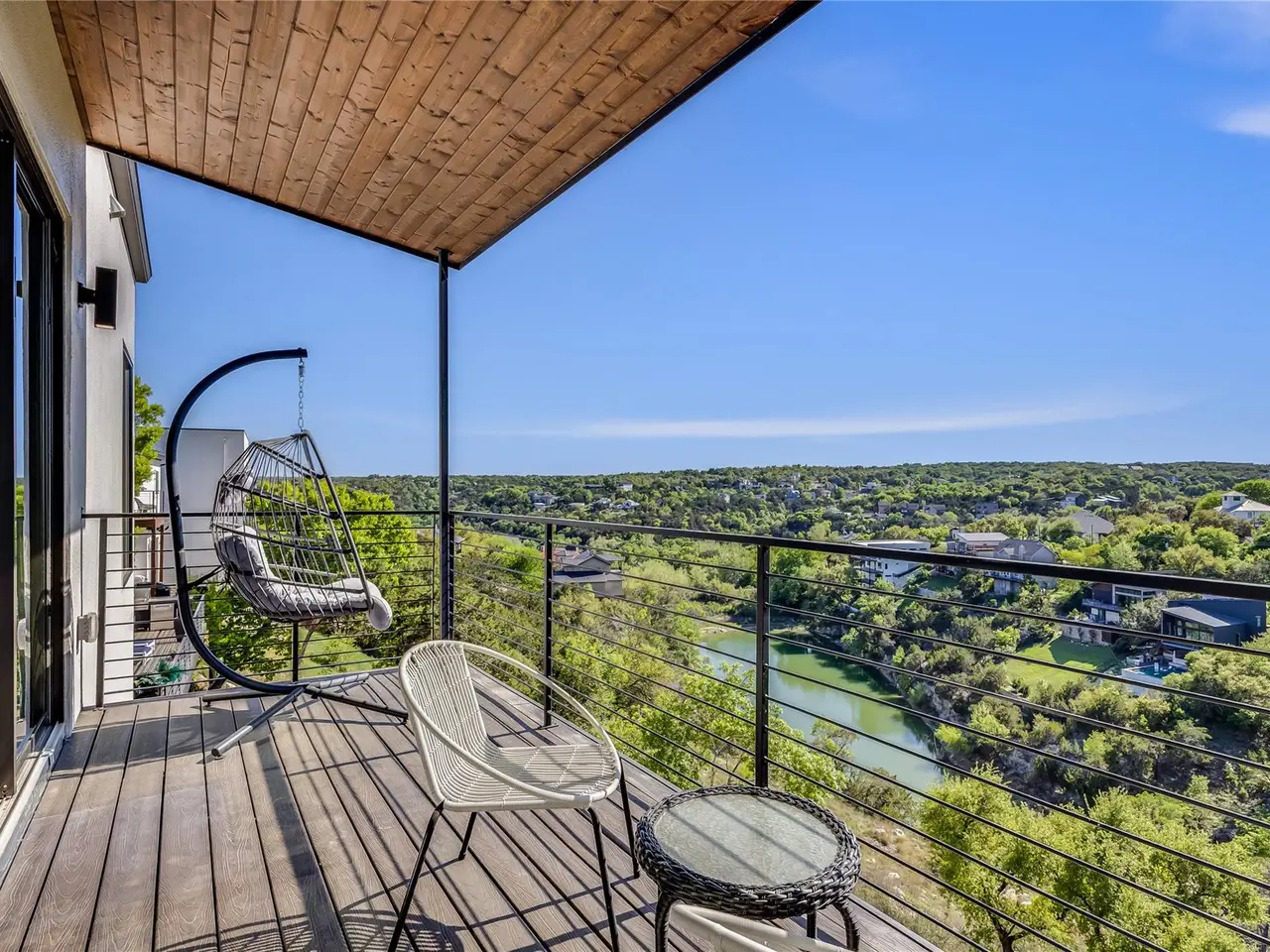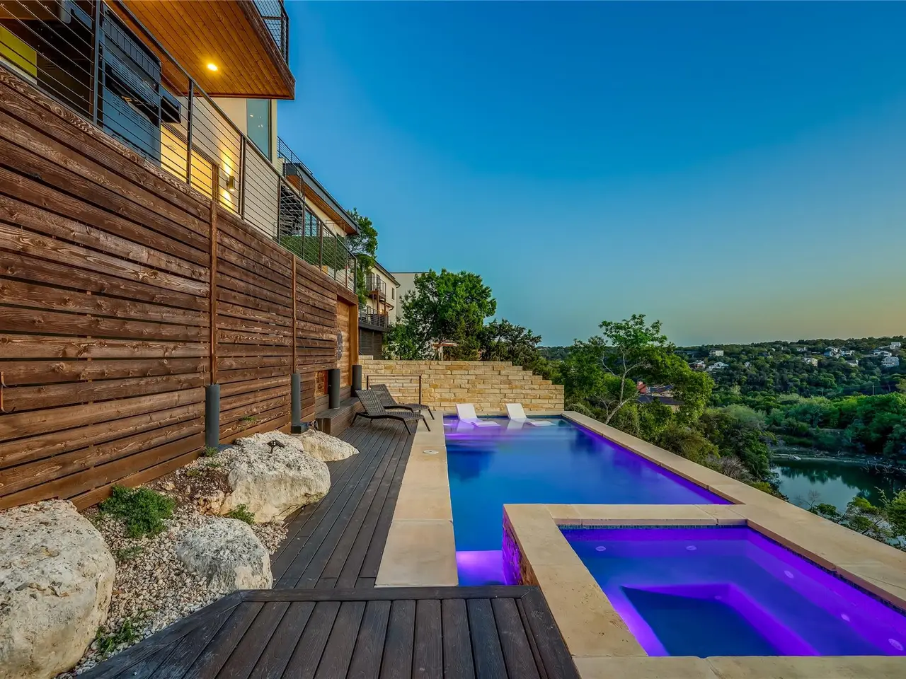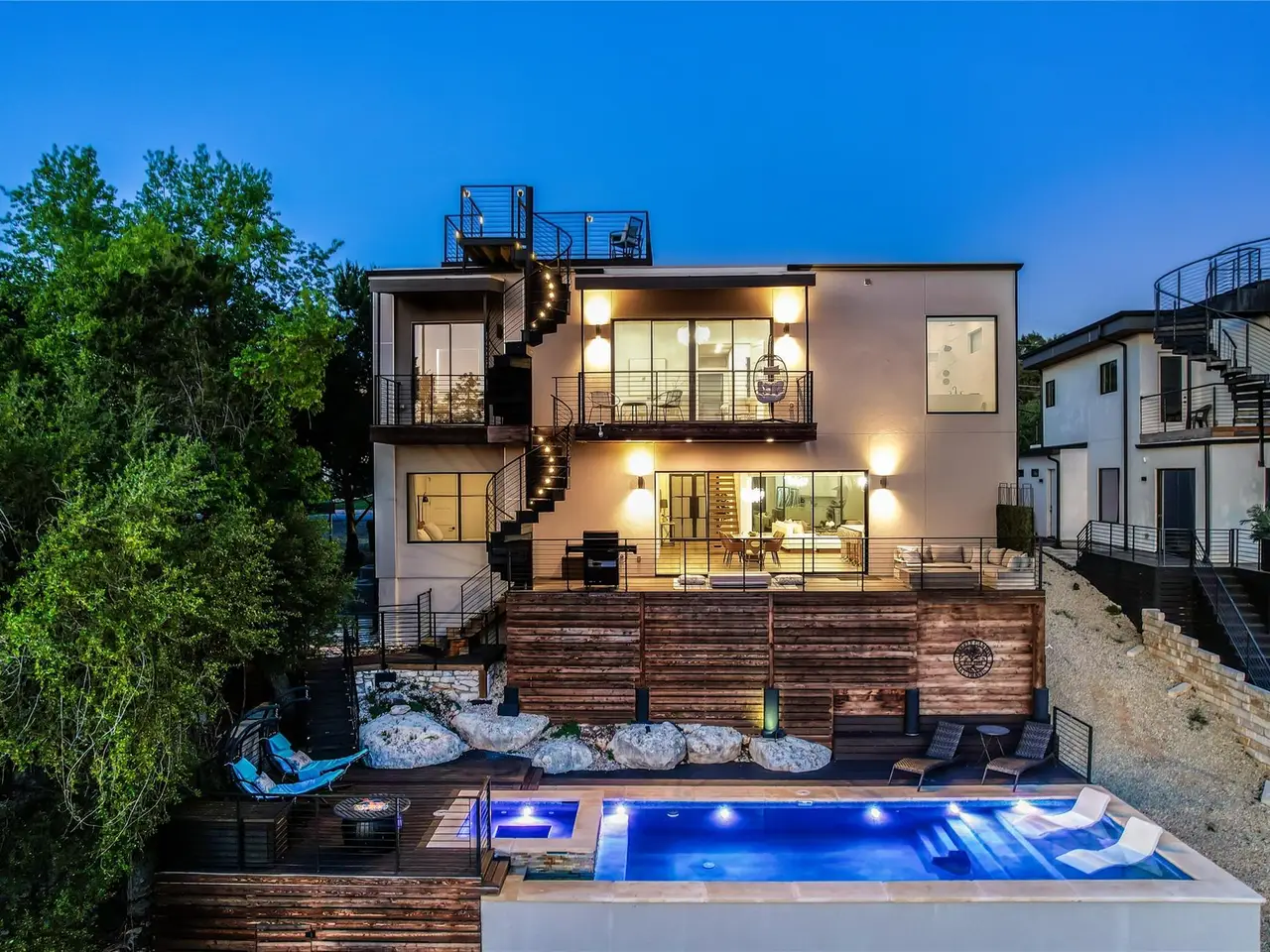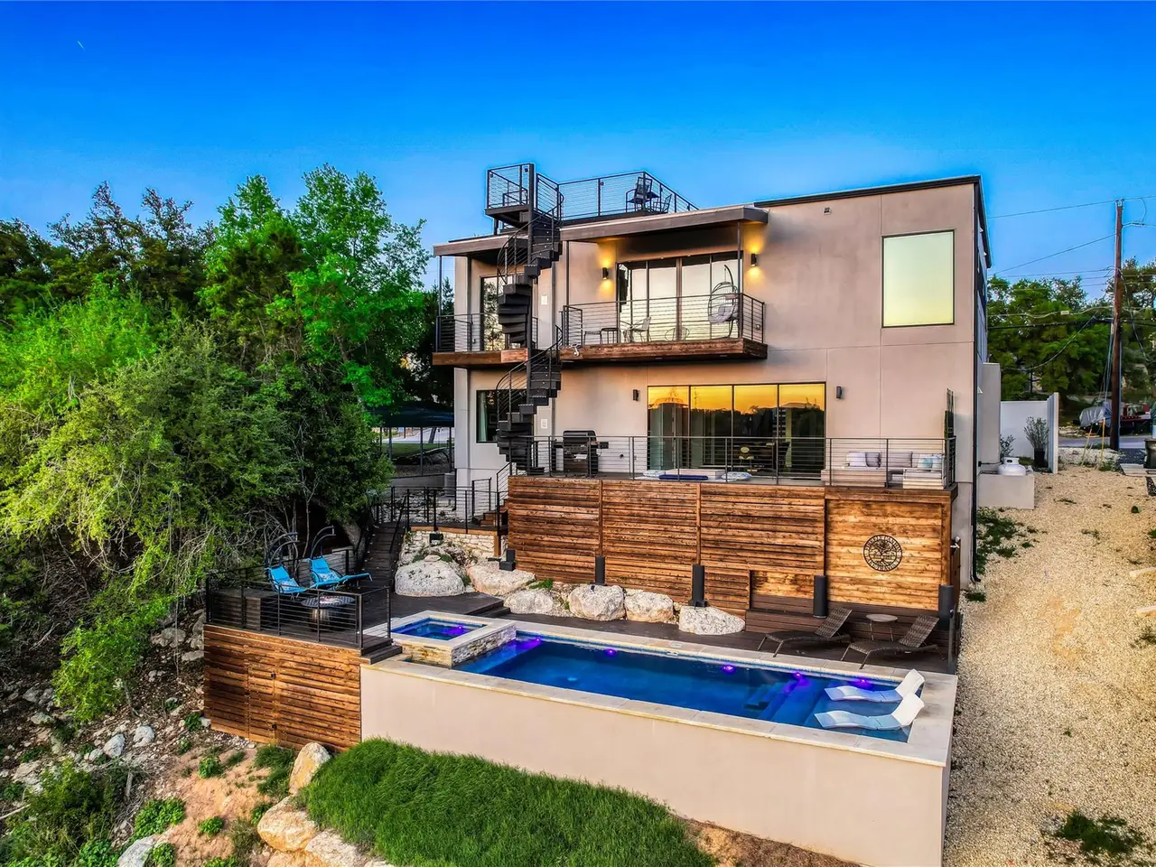 Nestled in the serene enclave of Apache Shores, Firefly Canyon is a breathtaking modern retreat offering panoramic views and a coveted setting backing onto Apache Shores Lake, a tranquil, creek-fed oasis. This stunning home boasts five spacious bedrooms and four luxurious bathrooms, designed with an open-concept layout that seamlessly blends style and functionality. The chef's kitchen features high-end stainless steel appliances, expansive quartz countertops, a waterfall island, and sleek European-inspired cabinetry. The generous dining area is framed by elegant sliding glass doors, opening onto a sprawling outdoor patio that invites effortless indoor-outdoor living. Designed for both relaxation and entertaining, this home offers a private rooftop deck, a cozy fire pit, and a heatable pool and spa--all set against the backdrop of breathtaking lake views. The primary suite is a true retreat, featuring a private balcony and a spa-inspired bathroom. Perfectly situated just 10 minutes from Lakeway and 20 minutes from downtown Austin, Firefly Canyon balances privacy with convenience. Its prime location and luxurious amenities make it an outstanding investment opportunity, offering top-tier rental potential year-round in Austin's thriving vacation market. With easy access to Lady Bird Lake, Lake Travis, top-ranked schools, medical facilities, scenic hiking trails, and premier shopping and dining, this exceptional property delivers an unparalleled lifestyle in one of Austin's most sought-after communities.