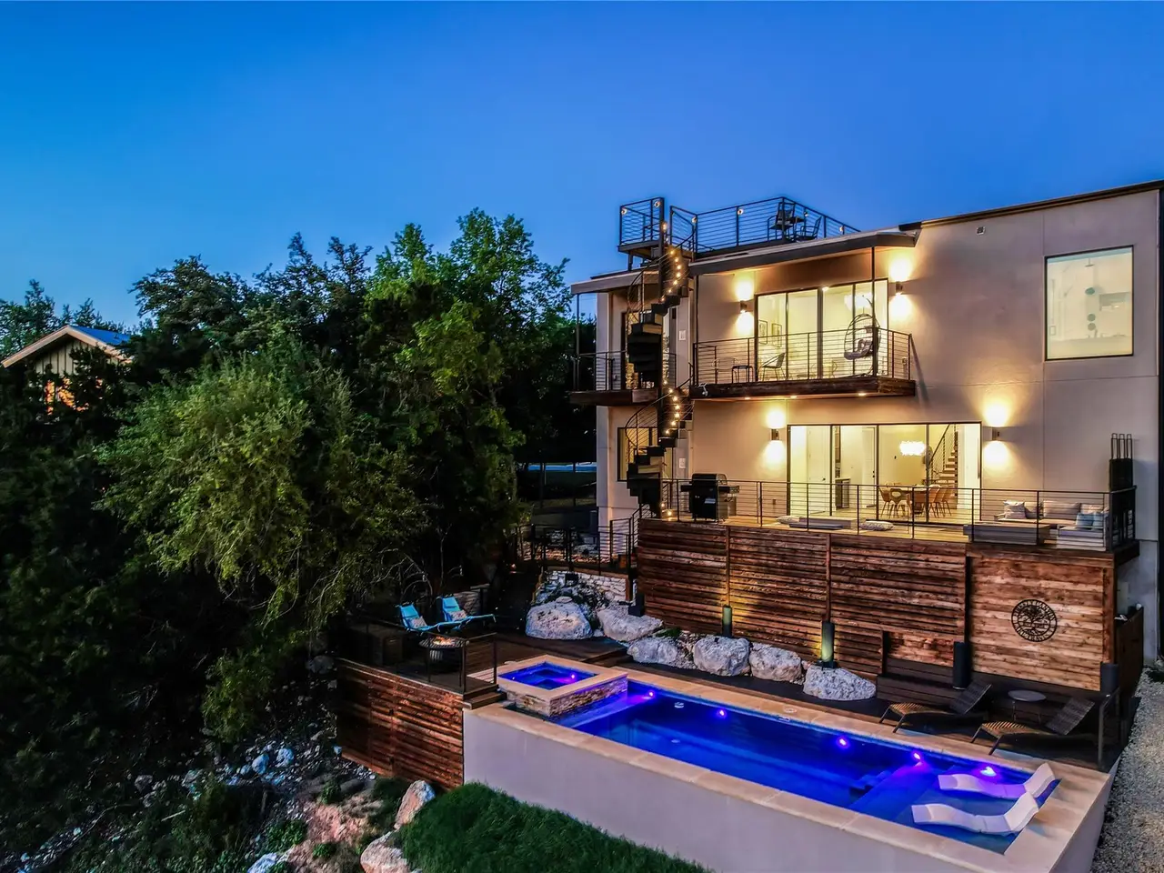 Nestled in the serene enclave of Apache Shores, Firefly Canyon is a breathtaking modern retreat offering panoramic views and a coveted setting backing onto Apache Shores Lake, a tranquil, creek-fed oasis. This stunning home boasts five spacious bedrooms and four luxurious bathrooms, designed with an open-concept layout that seamlessly blends style and functionality. The chef's kitchen features high-end stainless steel appliances, expansive quartz countertops, a waterfall island, and sleek European-inspired cabinetry. The generous dining area is framed by elegant sliding glass doors, opening onto a sprawling outdoor patio that invites effortless indoor-outdoor living.Designed for both relaxation and entertaining, this home offers a private rooftop deck, a cozy fire pit, and a heatable pool and spa--all set against the backdrop of breathtaking lake views. The primary suite is a true retreat, featuring a private balcony and a spa-inspired bathroom.Perfectly situated just 10 minutes from Lakeway and 20 minutes from downtown Austin, Firefly Canyon balances privacy with convenience. Its prime location and luxurious amenities make it an outstanding investment opportunity, offering top-tier rental potential year-round in Austin's thriving vacation market. With easy access to Lady Bird Lake, Lake Travis, top-ranked schools, medical facilities, scenic hiking trails, and premier shopping and dining, this exceptional property delivers an unparalleled lifestyle in one of Austin's most sought-after communities.