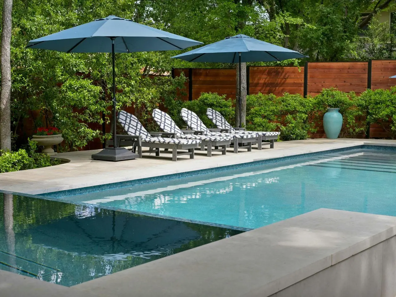The private backyard is a true oasis, featuring a beautiful Westbank pool and spa surrounded by lush landscaping, perfect for cooling off on hot Austin summer days.