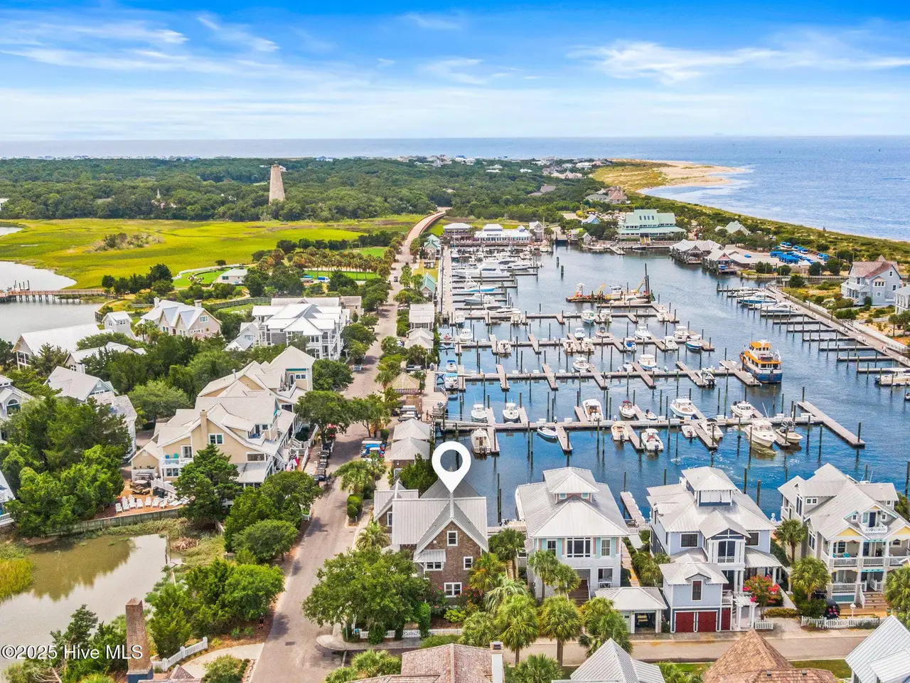 Coastal charm on one of the island's most iconic corners. At the meeting of Keelson Row and Transom Row, this Nantucket-style retreat offers front row views of the marina, sweeping saltwater marshes, and the daily rhythm of Bald Head Island. With 4 bedrooms and 4.5 baths total, the home spans just over 2,300 square feet and is designed for laid-back island living. The reverse floor plan makes the most of its elevated views. Upstairs, the vaulted living room opens to a screened porch where you can watch boats drift by and spot the beacon of Old Baldy. A renovated kitchen blends coastal character with modern function, creating a warm and welcoming flow throughout. On the main level, you will find two guest suites. One of which opens directly to a covered porch with a swinging bed that catches the breeze and invites long, lazy afternoons. Just outside, the wraparound front porch is lined with rocking chairs and offers a perfect perch to watch the island go by. A cozy fire pit patio just off the side adds one more spot to unwind. The top-floor primary suite is a true retreat with sweeping marsh views, a cozy reading nook, and a spacious walk-in shower. The crofter, accessed by a spiral staircase, offers two twin beds and a full bath for guests or flexible living space. Sold furnished and including two 4-passenger golf carts, this home offers a front porch lifestyle made for slow mornings, sunset views, and timeless island memories.