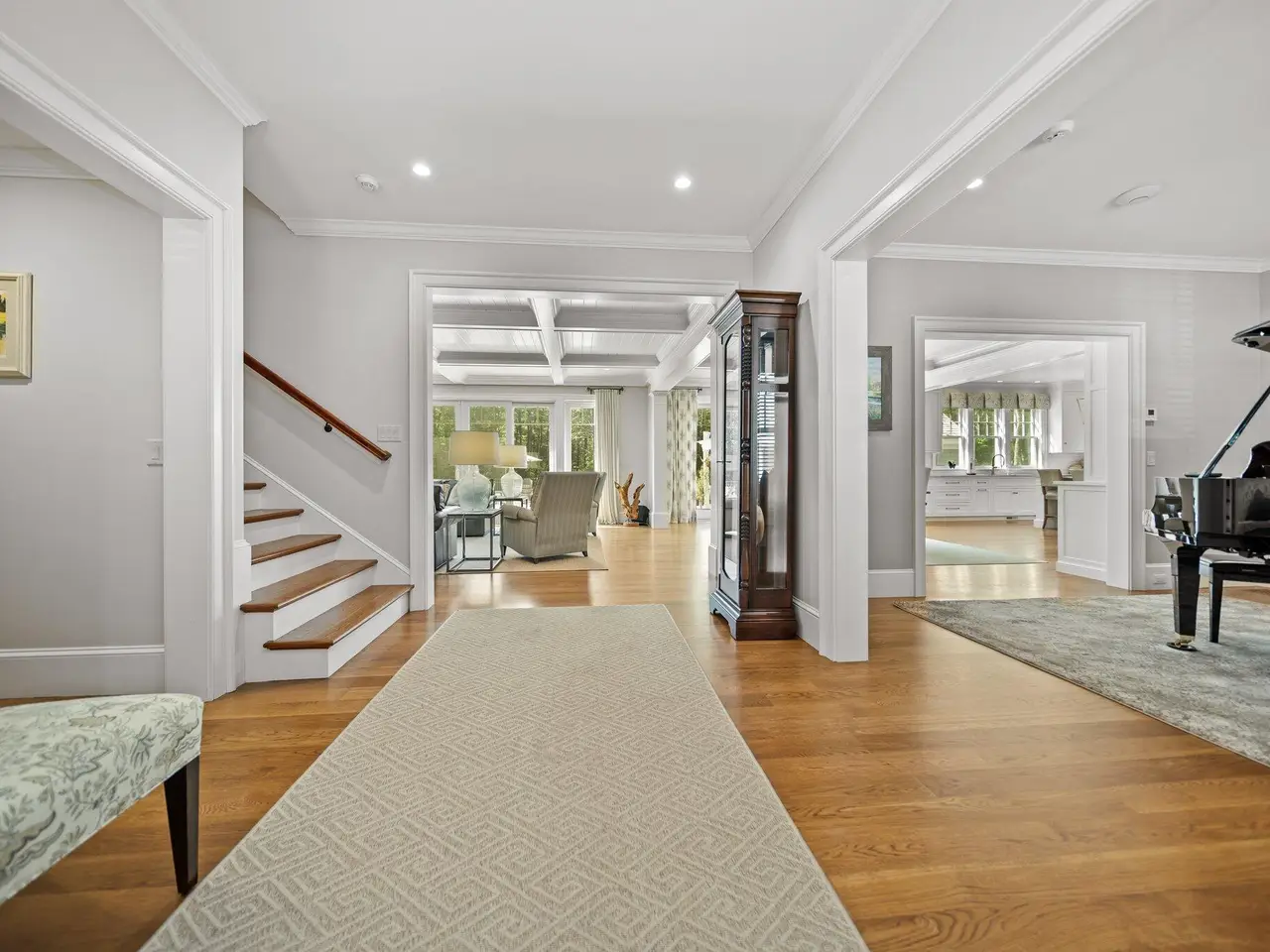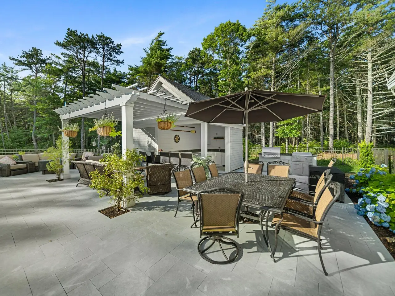 Pamper yourself and your family on this private Cotuit estate with the latest finishes in new construction. This contemporary-style Gambrel home, recalls the best of Cape Cod, and was designed for both beauty and function, featuring five-bedroom suites, including the Primary wing. Visible from multiple sliding glass doors and windows in the open floor plan is the salt-generated, heated pool with spa, & Cabana, with a kitchenette, grill area, and bathroom/shower beckoning you out to the private 2.24-acre yard. Or, if you're a beach person, take yourself to your private beach on Nantucket Sound where you can moor your boat. The floor plan flows from the custom kitchen through a dining area to the living room, with a stone surround on the gas fireplace. A wonderful surprise is the 3rd-floor family room with a comfy TV viewing station and a table for games for those stormy days, or long winter nights. A half bath and snack room make it convenient to stay the night. Two laundry rooms, one on the first floor, the other on the second, a pantry with a second fridge, and a large mudroom which leads to an in law suite above the garage. Mudroom has 2 built in kennels-a special property.